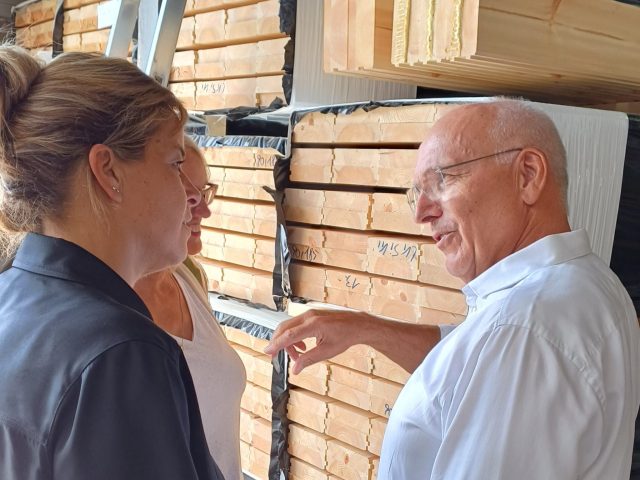 Ministerin Mona Neubaur begutachtet die laminierten Blockbohlenim Lohmarer Werk von Fullwood Wohnblockhaus