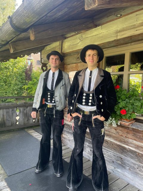 Gewandert und gearbeitet wird in der traditionellen Kluft, die aus schwarzer Hose, schwarzer Weste, weißer Staude (Hemd), schwarzem Hut und Jackett besteht. Nicht zu vergessen die Ehrbarkeit: das ist ein schmaler Schlips, der verschiedene Farben haben kann. Dominik und Melf tragen ihn in schwarz. Sogar die Anzahl der Knöpfe an der Kleidung ist genau durchdacht und hat ihre Bedeutung. „An der Weste 8 Knöpfe für die Anzahl der Arbeitsstunden pro Tag. Am Jackett 6 Knöpfe für die Zahl der Arbeitstage pro Woche. An den Ärmeln der Staude je 3 Knöpfe pro Seite, einmal für die Zahl der Lehrjahre und einmal für die Zahl der Wanderjahre.“, zählt Melf auf. Wobei Dominik in der Schweiz die dort üblichen 4 Jahre lernen musste bis zur Freisprechung. Bedeutungsvoll ist auch der goldene Ohrring, der im linken Ohr getragen wird: ursprünglich diente er einem auf Wanderschaft verstorbenen Gesellen zur Finanzierung seiner Beerdigung.