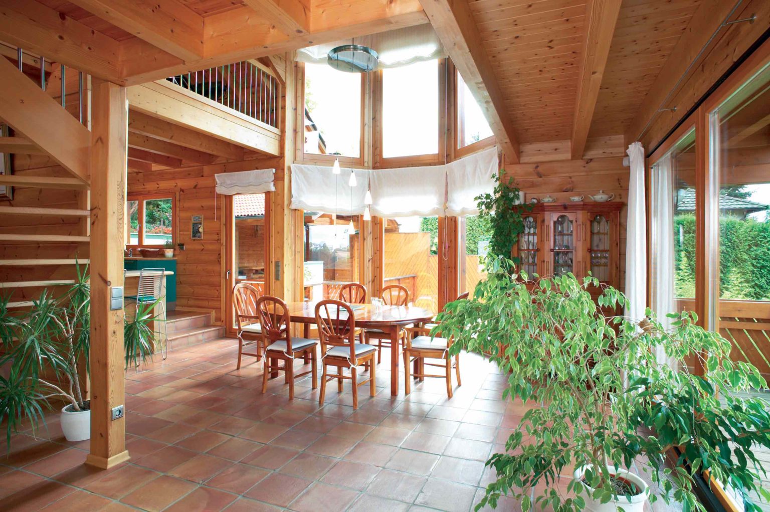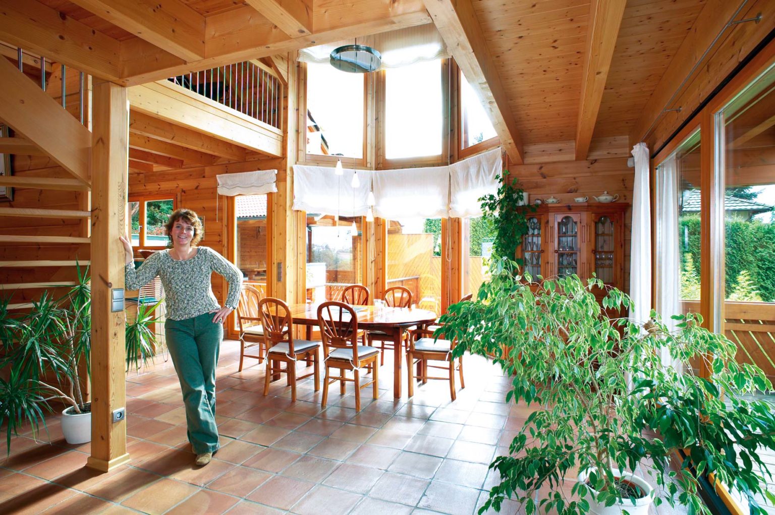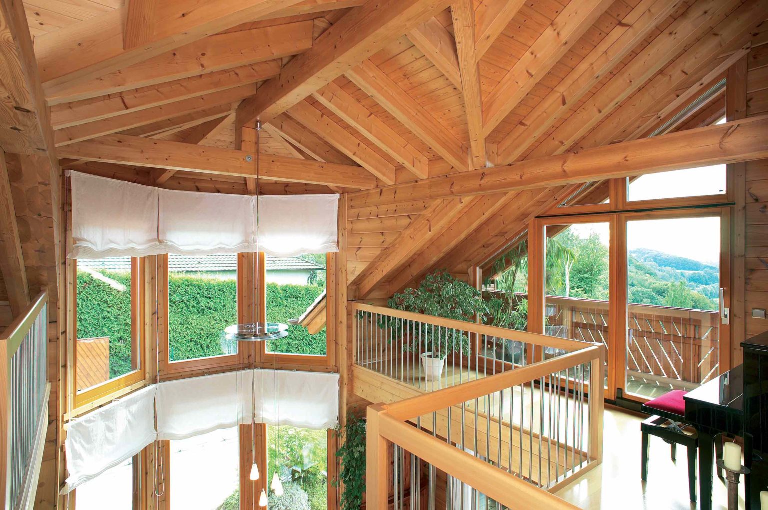 Hell und luftig geht es zu im "Holzhaus Aggerblick", dessen Bewohner die Aussicht hinunter ins Tal genießen. Zentrum des Wohngeschehens ist eine Galerie im dreigeschossigen, offenen Glaserker, der das Holzhaus besondes schön macht. Große Fensterflächen im Holzhaus, geräumige Loggien und eine Terrasse auf dem Carport sorgen für innige Nähe zur umgebenden Landschaft.
