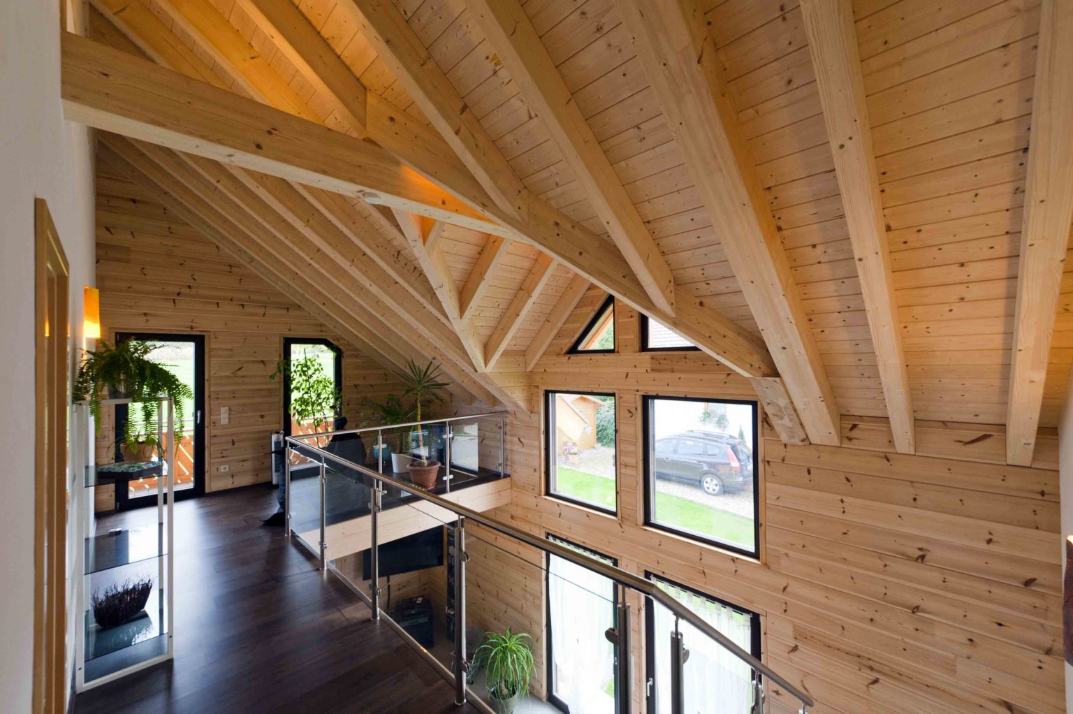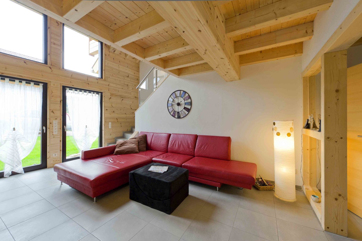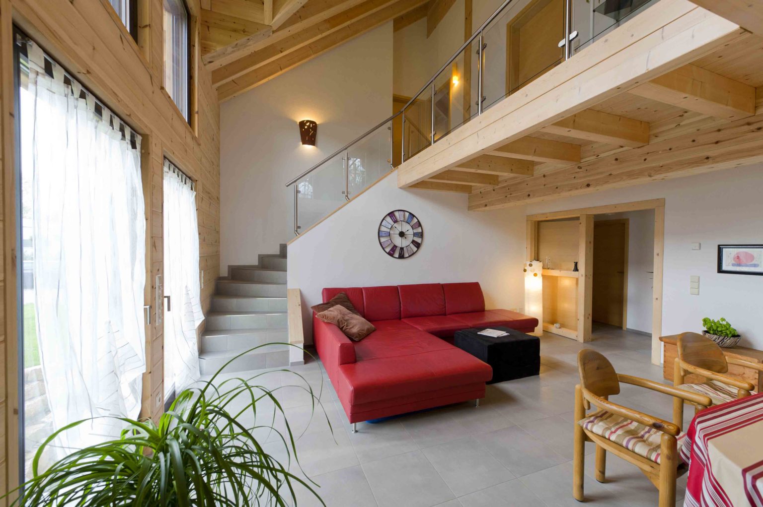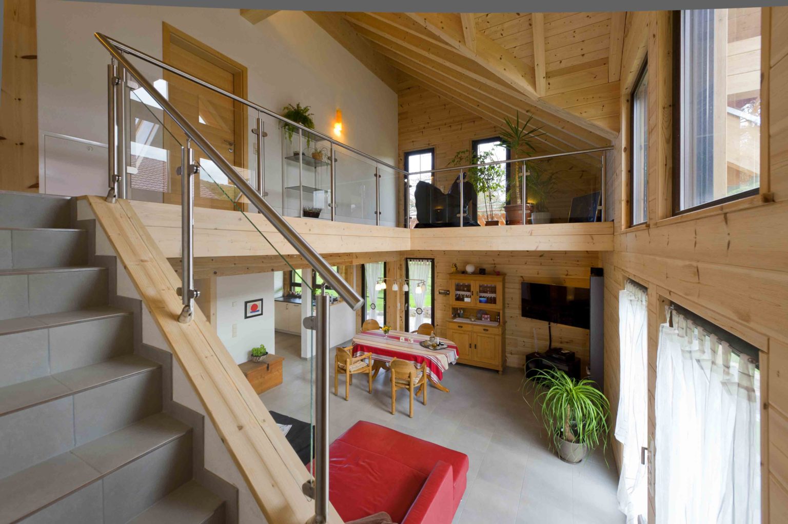 Im Dachgeschoss befinden sich eine weitläufige Galerie, ein Schlafzimmer, ein Gästezimmer und ein geräumiges Badezimmer mit eingebauter Sauna. Da sich die Hauseigentümer viel Helligkeit und natürlichen Lichteinfall wünschten, behandelten sie die naturhellen Polarkiefernwände mit UV-Schutz, kombinierten weiß gestrichene Ständerbau-Trennwände dazu und ließen viele, größtenteils bodentiefe Fenster auf beiden Etagen einbauen. Der sich bis zum First erstreckende Luftraum über dem Großteil des Wohnbereiches sorgt zusätzlich für Luftigkeit und Helligkeit, zumal die Galerie mit einer lichtdurchlässigen Brüstung aus klaren Glasscheiben und Edelstahlrohren begrenzt ist. Der Sichtdachstuhl beeindruckt somit nicht nur in den oberen Räumen. Um auf Stützen im Wohnbereich verzichten zu können, wurde – unsichtbar – ein Stahlträger eingebaut. Die einheitlichen, hellgrauen Fliesenquadrate im gesamten Holzhaus betonen die helle, großflächige Innenarchitektur und schwarze Fensterrahmen steuern einen sachlich-modernen Kontrast bei. Lediglich auf der Galerie und in den Schlafzimmern schmeichelt fußwarmes, dunkel gebeiztes Walnussparkett den Füßen. Helle Buchenholtüren komplettieren den Look.