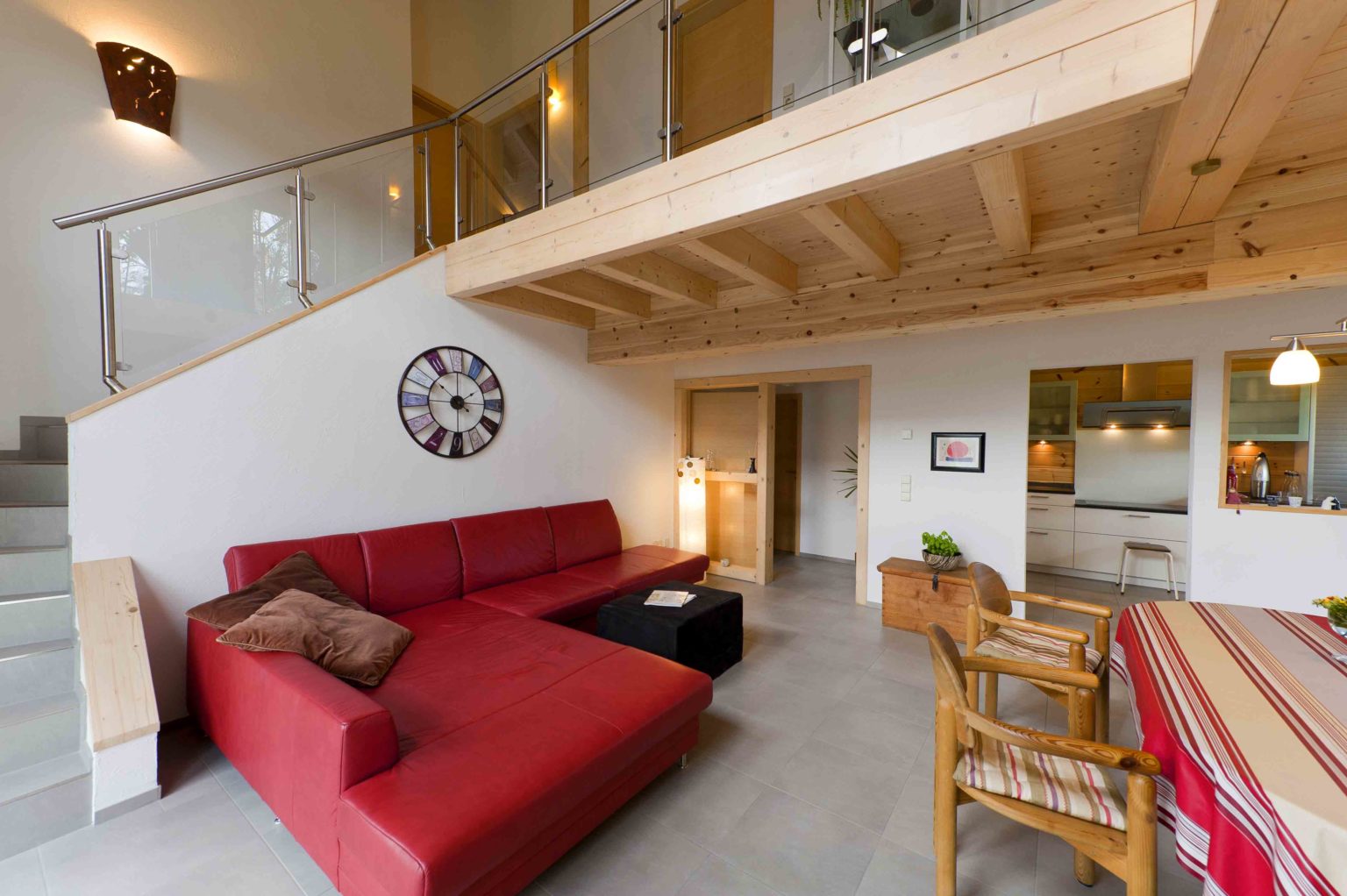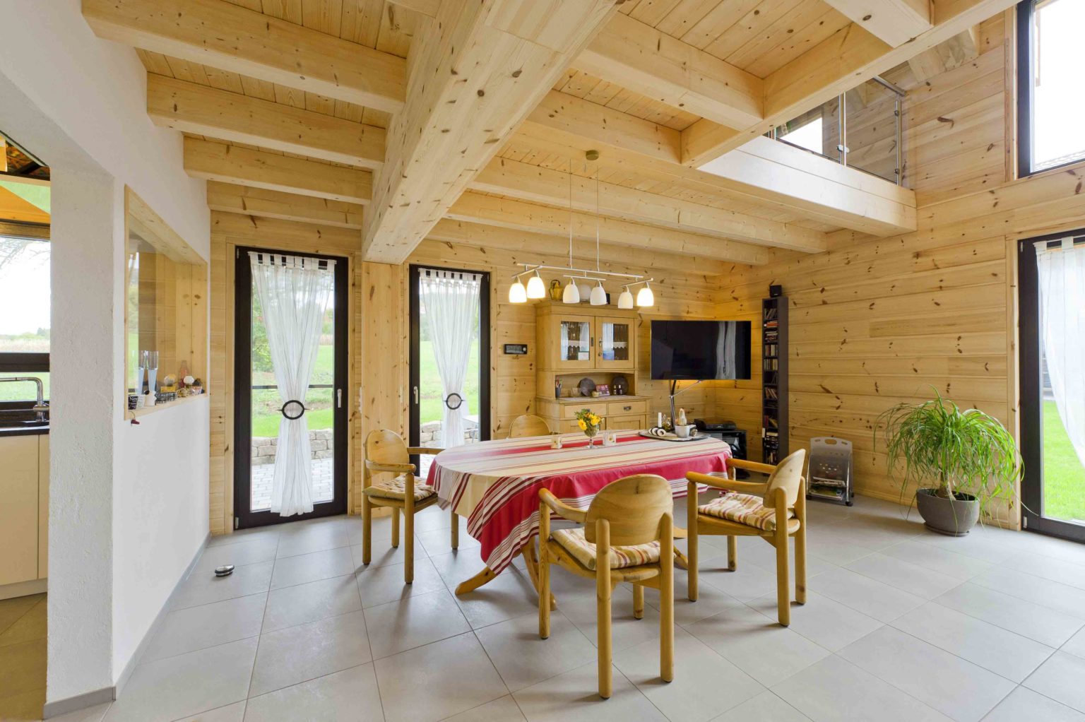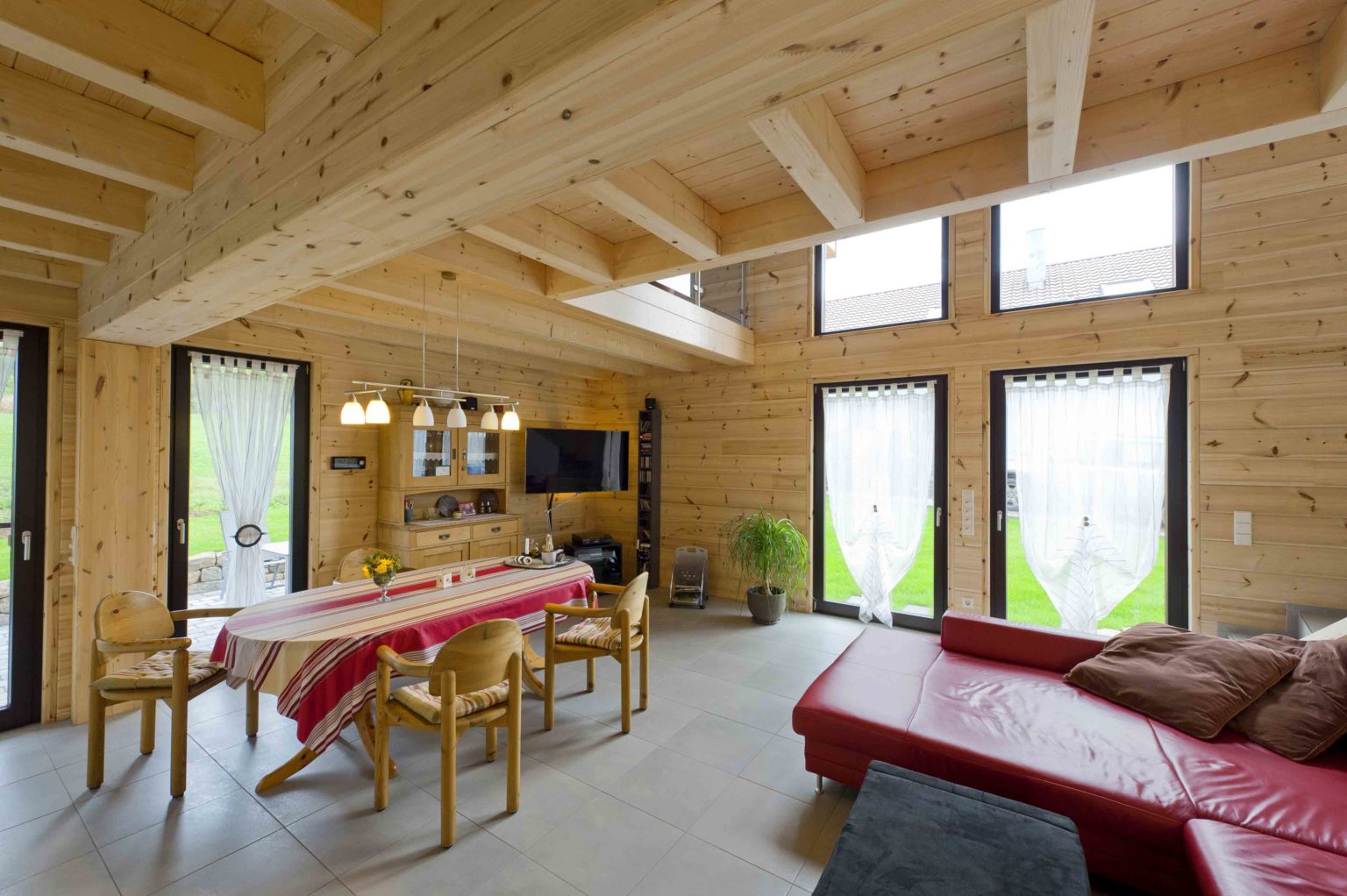 Im Dachgeschoss befinden sich eine weitläufige Galerie, ein Schlafzimmer, ein Gästezimmer und ein geräumiges Badezimmer mit eingebauter Sauna. Da sich die Hauseigentümer viel Helligkeit und natürlichen Lichteinfall wünschten, behandelten sie die naturhellen Polarkiefernwände mit UV-Schutz, kombinierten weiß gestrichene Ständerbau-Trennwände dazu und ließen viele, größtenteils bodentiefe Fenster auf beiden Etagen einbauen. Der sich bis zum First erstreckende Luftraum über dem Großteil des Wohnbereiches sorgt zusätzlich für Luftigkeit und Helligkeit, zumal die Galerie mit einer lichtdurchlässigen Brüstung aus klaren Glasscheiben und Edelstahlrohren begrenzt ist. Der Sichtdachstuhl beeindruckt somit nicht nur in den oberen Räumen. Um auf Stützen im Wohnbereich verzichten zu können, wurde – unsichtbar – ein Stahlträger eingebaut. Die einheitlichen, hellgrauen Fliesenquadrate im gesamten Holzhaus betonen die helle, großflächige Innenarchitektur und schwarze Fensterrahmen steuern einen sachlich-modernen Kontrast bei. Lediglich auf der Galerie und in den Schlafzimmern schmeichelt fußwarmes, dunkel gebeiztes Walnussparkett den Füßen. Helle Buchenholtüren komplettieren den Look.