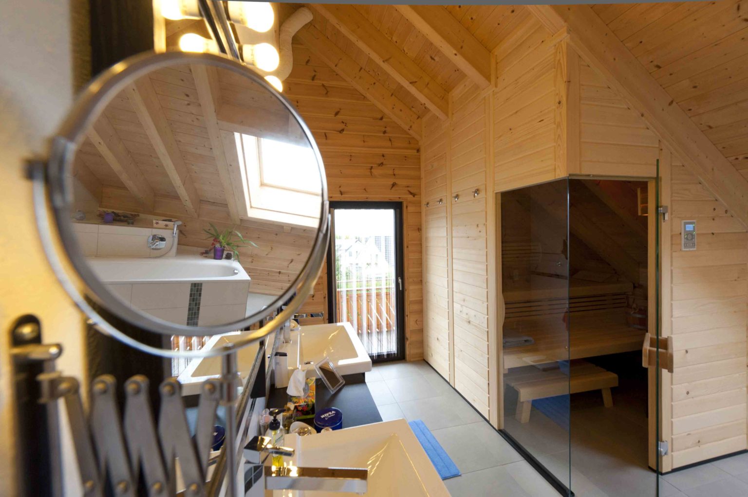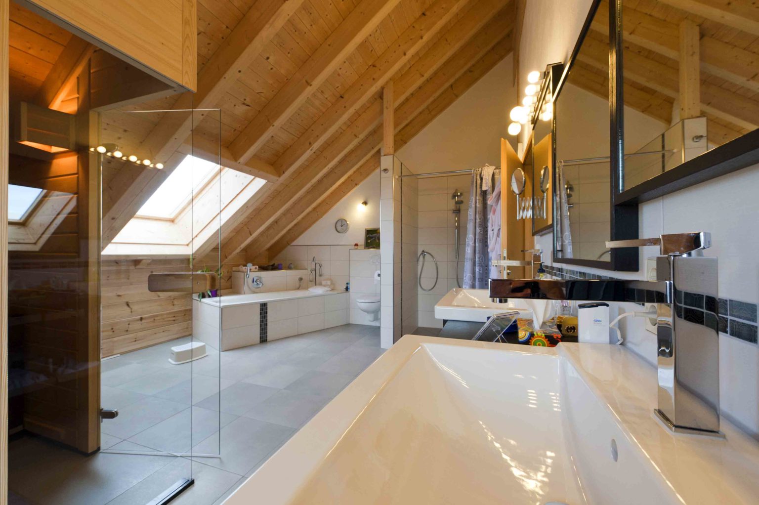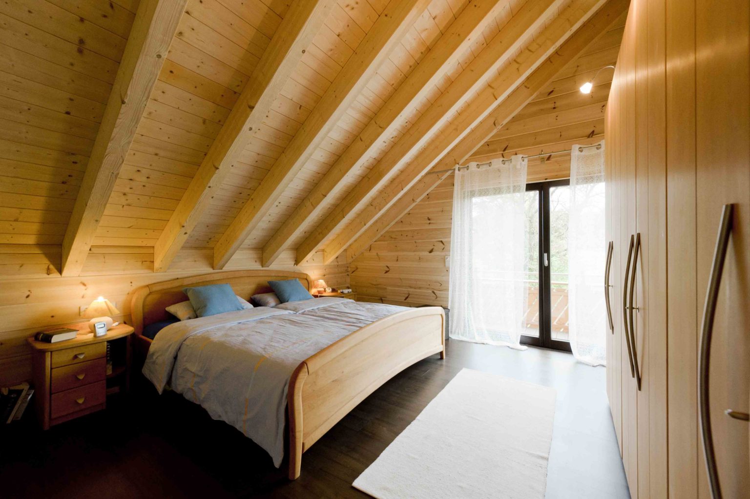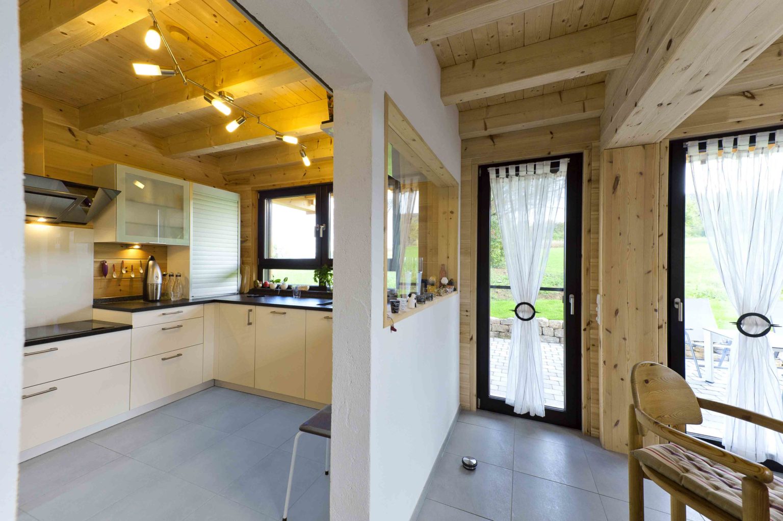Im Dachgeschoss befinden sich eine weitläufige Galerie, ein Schlafzimmer, ein Gästezimmer und ein geräumiges Badezimmer mit eingebauter Sauna. Da sich die Hauseigentümer viel Helligkeit und natürlichen Lichteinfall wünschten, behandelten sie die naturhellen Polarkiefernwände mit UV-Schutz, kombinierten weiß gestrichene Ständerbau-Trennwände dazu und ließen viele, größtenteils bodentiefe Fenster auf beiden Etagen einbauen. Der sich bis zum First erstreckende Luftraum über dem Großteil des Wohnbereiches sorgt zusätzlich für Luftigkeit und Helligkeit, zumal die Galerie mit einer lichtdurchlässigen Brüstung aus klaren Glasscheiben und Edelstahlrohren begrenzt ist. Der Sichtdachstuhl beeindruckt somit nicht nur in den oberen Räumen. Um auf Stützen im Wohnbereich verzichten zu können, wurde – unsichtbar – ein Stahlträger eingebaut. Die einheitlichen, hellgrauen Fliesenquadrate im gesamten Holzhaus betonen die helle, großflächige Innenarchitektur und schwarze Fensterrahmen steuern einen sachlich-modernen Kontrast bei. Lediglich auf der Galerie und in den Schlafzimmern schmeichelt fußwarmes, dunkel gebeiztes Walnussparkett den Füßen. Helle Buchenholtüren komplettieren den Look.