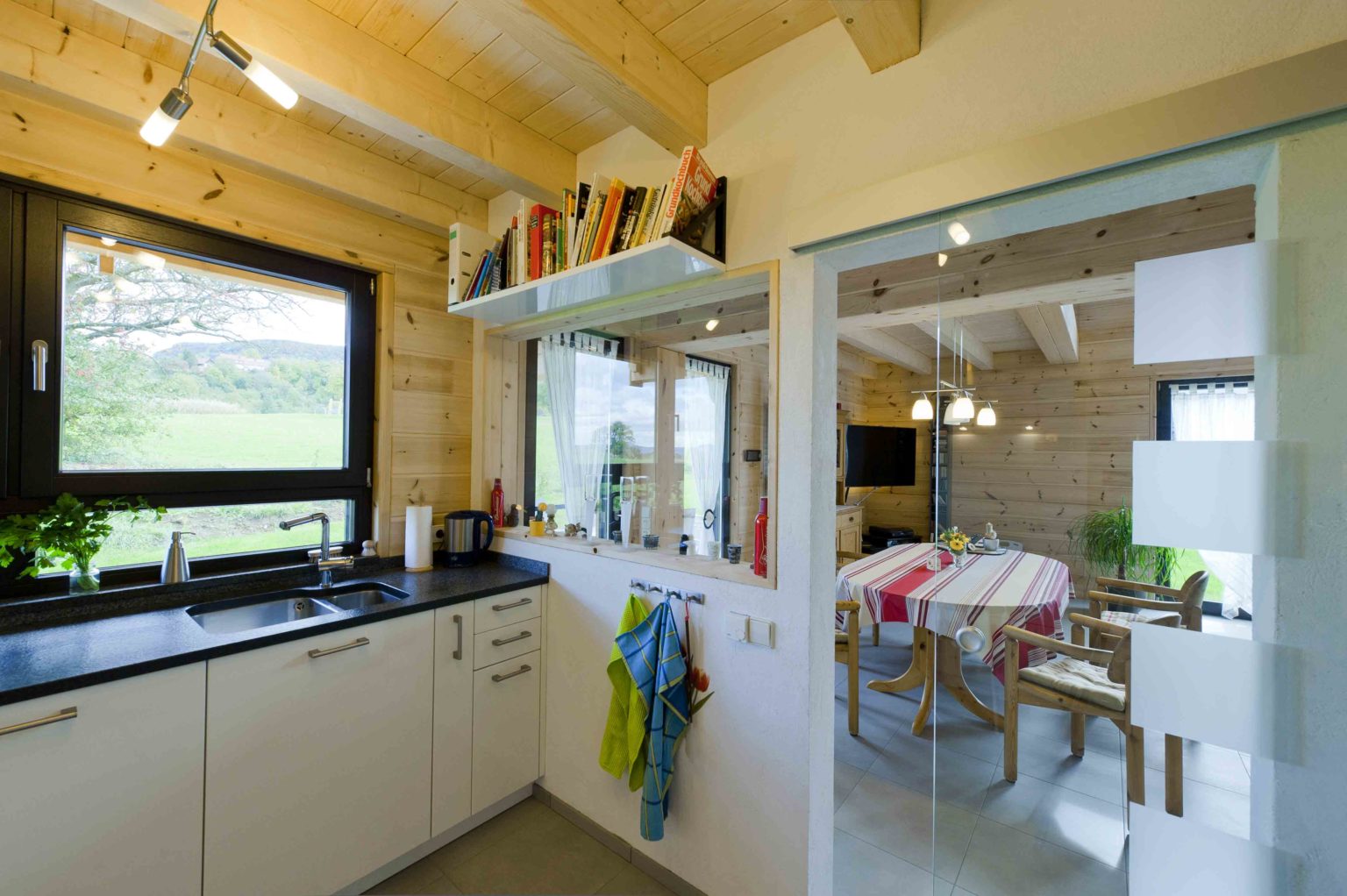 Der Grundriss entspricht einem Rechteck mit ausgespartem Windfang an der Nordseite, dort wo die Eingangstüre ist. Daran angebaut ist eine quadratische Doppelgarage, unmittelbar neben dem Windfang. Zwei einander gegenüberliegende Zwerchhäuser mit Dreiecksgauben an den Traufseiten erweitern das Platzangebot im Dachgeschoss, und zwei an den Giebelseiten befindliche Balkone unterstützen das freundliche Erscheinungsbild. Damit das helle Kiefernholz nicht vergraut, strichen die Hauseigentümer die Außenwände mit Witterungsschutz und lasierten die Kiefernholzwände mit dem hellen Farbton „Lärche“. Behütet wird das Gebäude von einem Satteldach im ortsüblichen Ziegelrot. Knapp ein Drittel des Erdgeschosses beansprucht der Arbeitsteil (Westseite), inklusive zwei Büros, kleinem Flur und WC. Die Wohnung beinhaltet ebenfalls einen kleinen Flur mit angeschlossenem Gäste-WC, von wo es in einen großen, vertikal offenen Wohn-Essbereich geht. Die geschlossene (!) Küche erreicht man nur von hier aus. Da die Hausherrin keine komplett offene Küche, wie sie vorher eine hatte, mehr wollte, entschied man sich für einen praktischen und schönen Kompromiss: Der breite Zugang zur Küche ist mit einer durchsichtigen Glasschiebetür verschließbar, und ein großes Fenster in der Trennwand lässt Blickkontakt und Lichtweiterleitung zu. Störende Geräusche und Gerüche sind kein Thema.