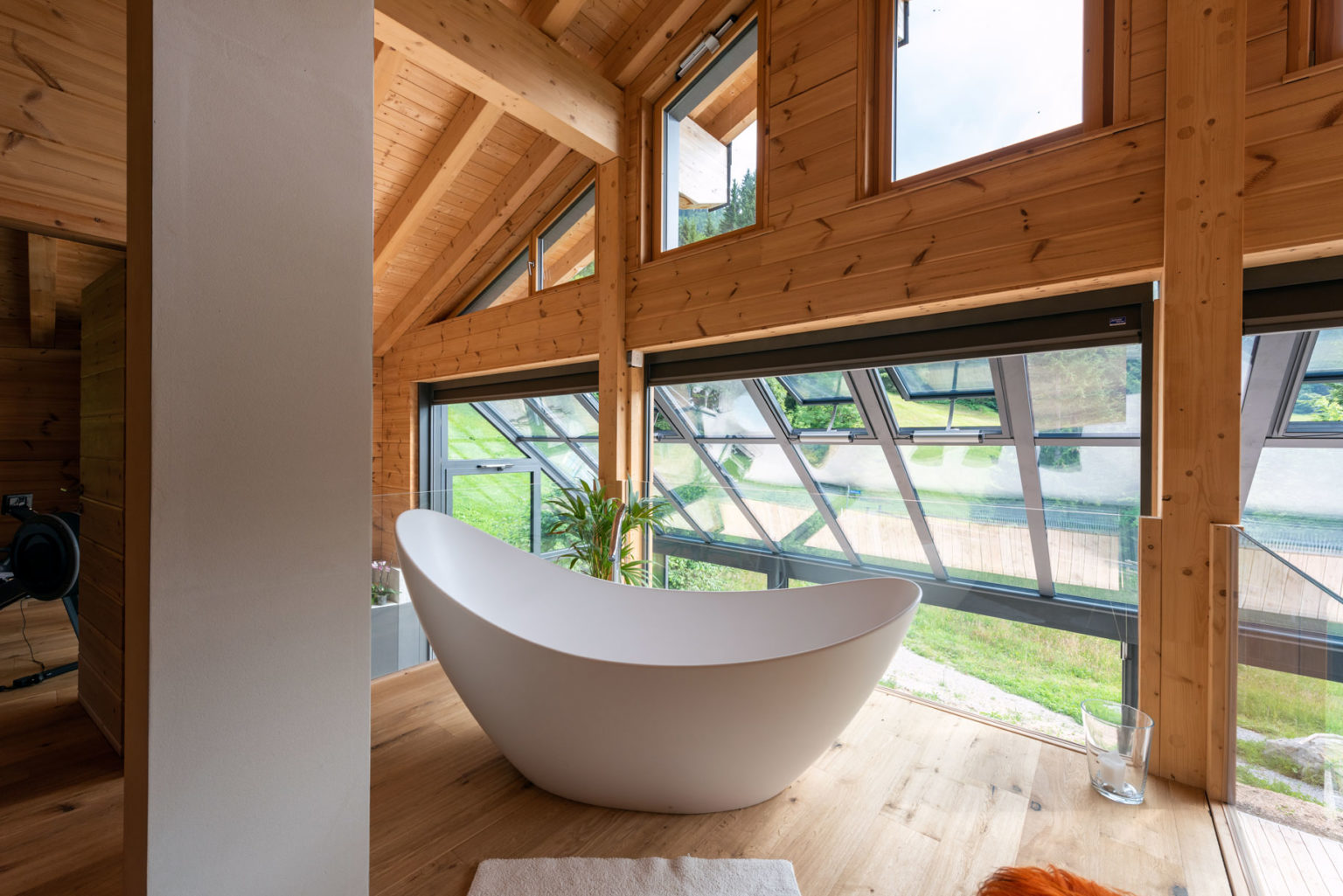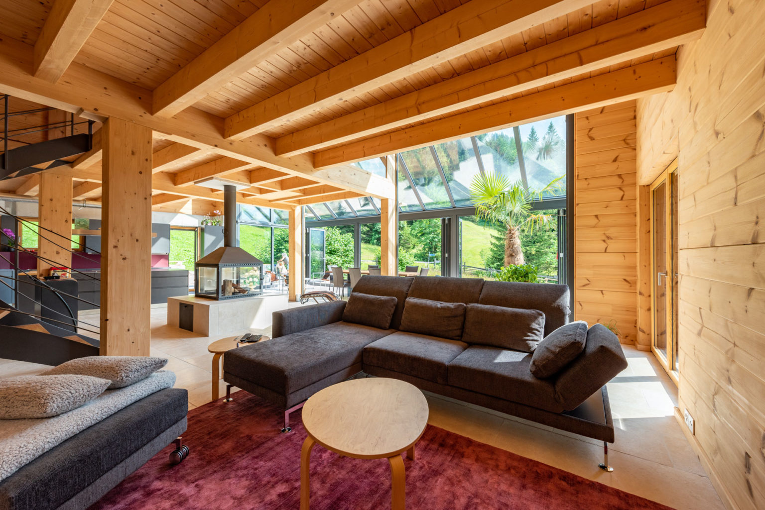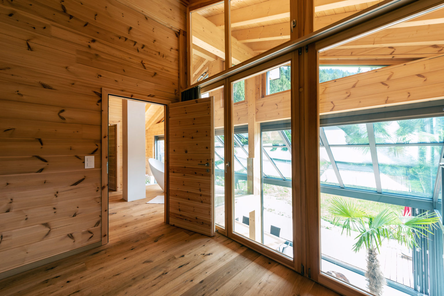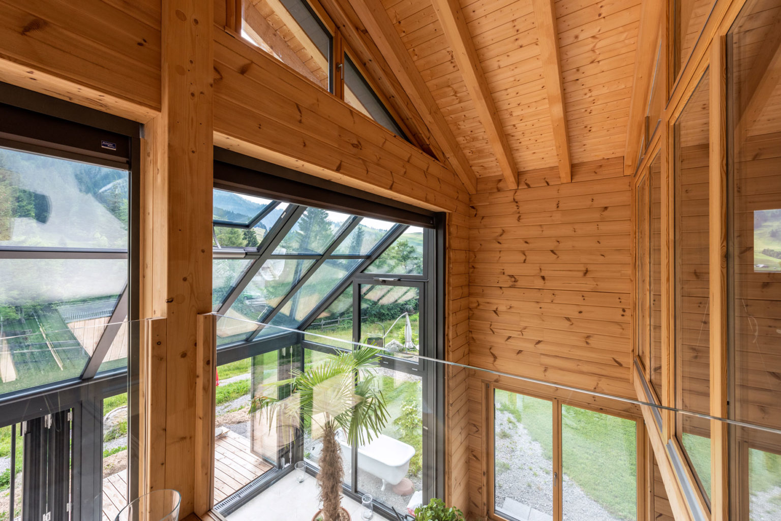 „Mir ist, neben einer ästhetischen Architektur, gesundes Wohnen wichtig. Deshalb habe ich mich für diesen herrlichen, ruhigen Standort mit frischer Bergluft entschieden und für massive, schadstofffreie Wände aus Kiefernholz.“, sagt der unabhängige Unternehmer. Eine UV-Schutz-Lasur für die Holzwände und Decken im Innern kam nicht infrage „um das Raumklima nicht zu beeinflussen“. „Fullwood meinte zwar, dass es nicht nötig sei, aber ich wollte die Hauswände außen dennoch vor dem harten Klima auf knapp 1400m ü. M. schützen. Außerdem möchte ich nicht, dass das Holz vergraut. Deshalb habe ich drei Hausseiten mit Schieferelementen verkleidet, und vor die südliche Giebelfront einen zweistöckigen Wintergarten aus Glas und Alu setzen lassen.“, erklärt er weiter. Abgesehen davon, dass die diffusionsoffenen Massivholzwände seines Hauses „atmen“, trägt eine Holzumgebung nachweislich zur Entspannung bei und bewirkt eine 2-3 Grad höher gefühlte Raumtemperatur.