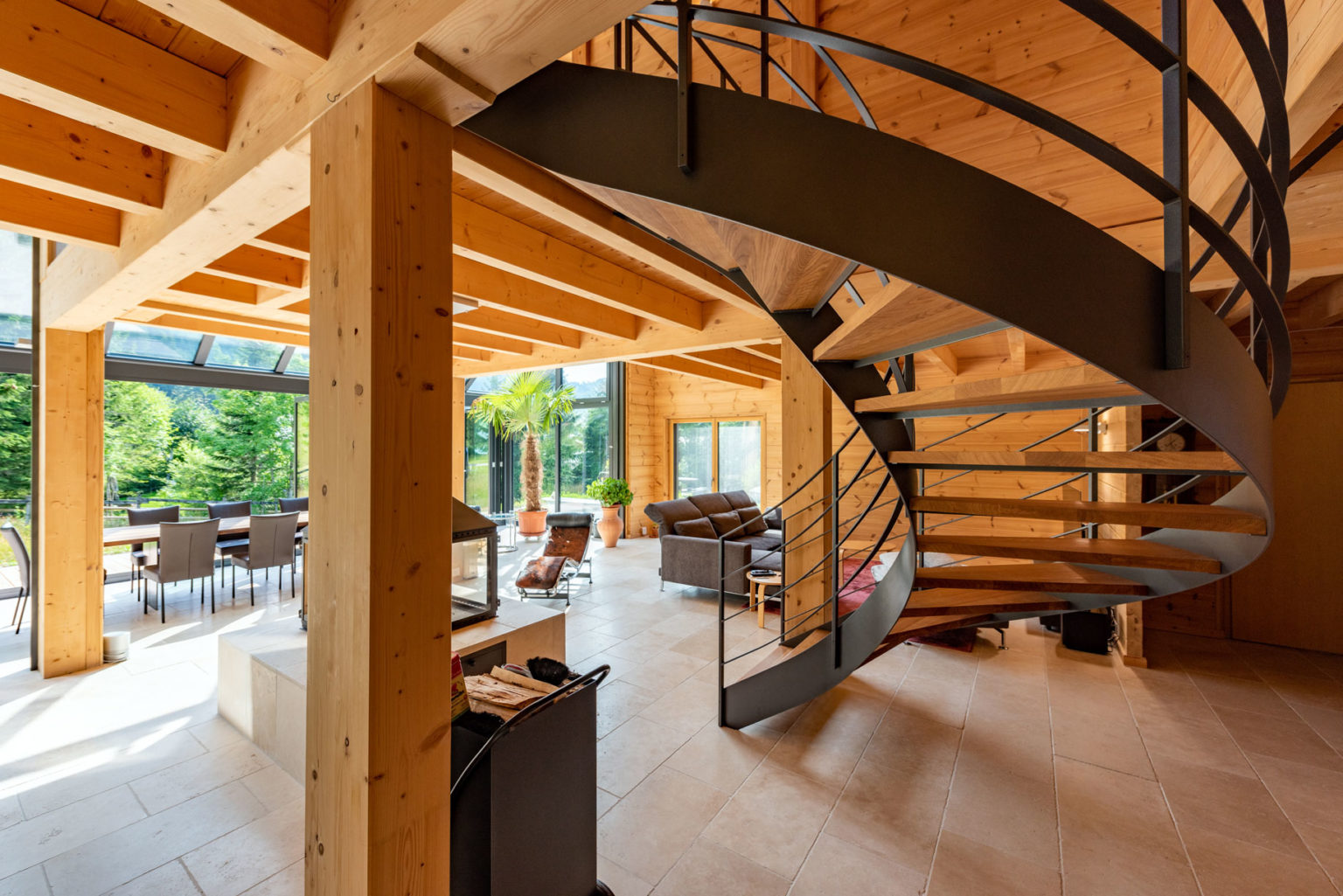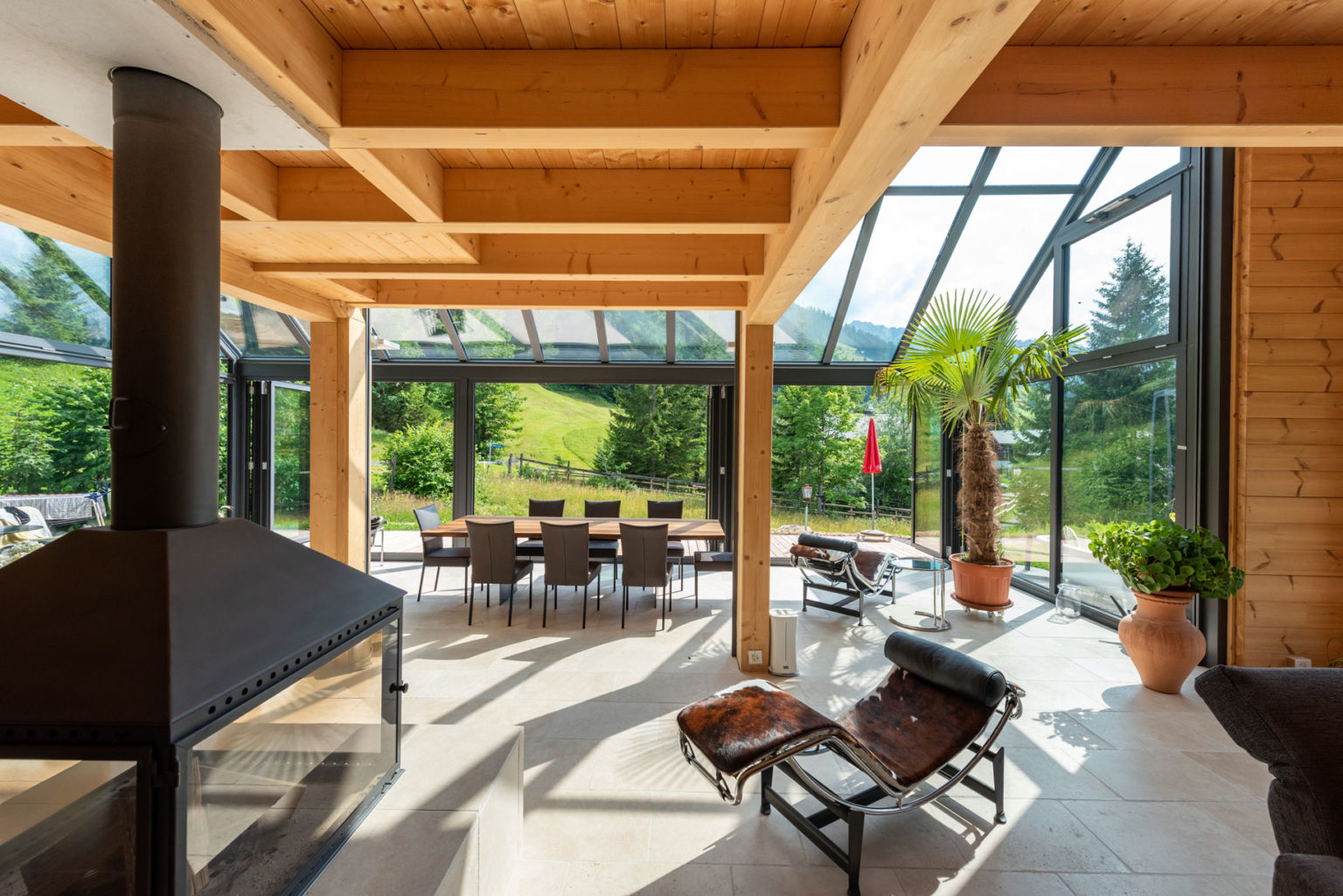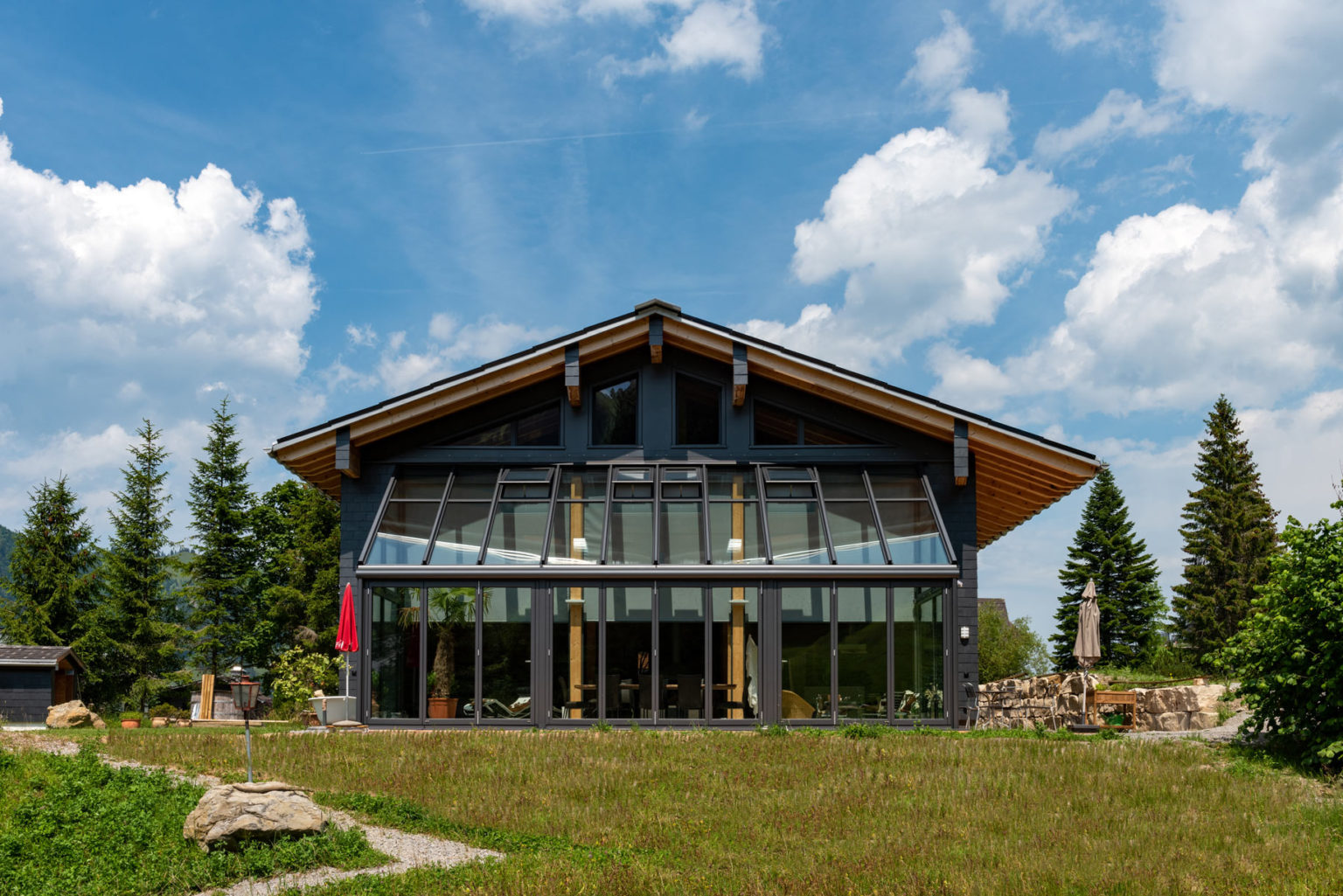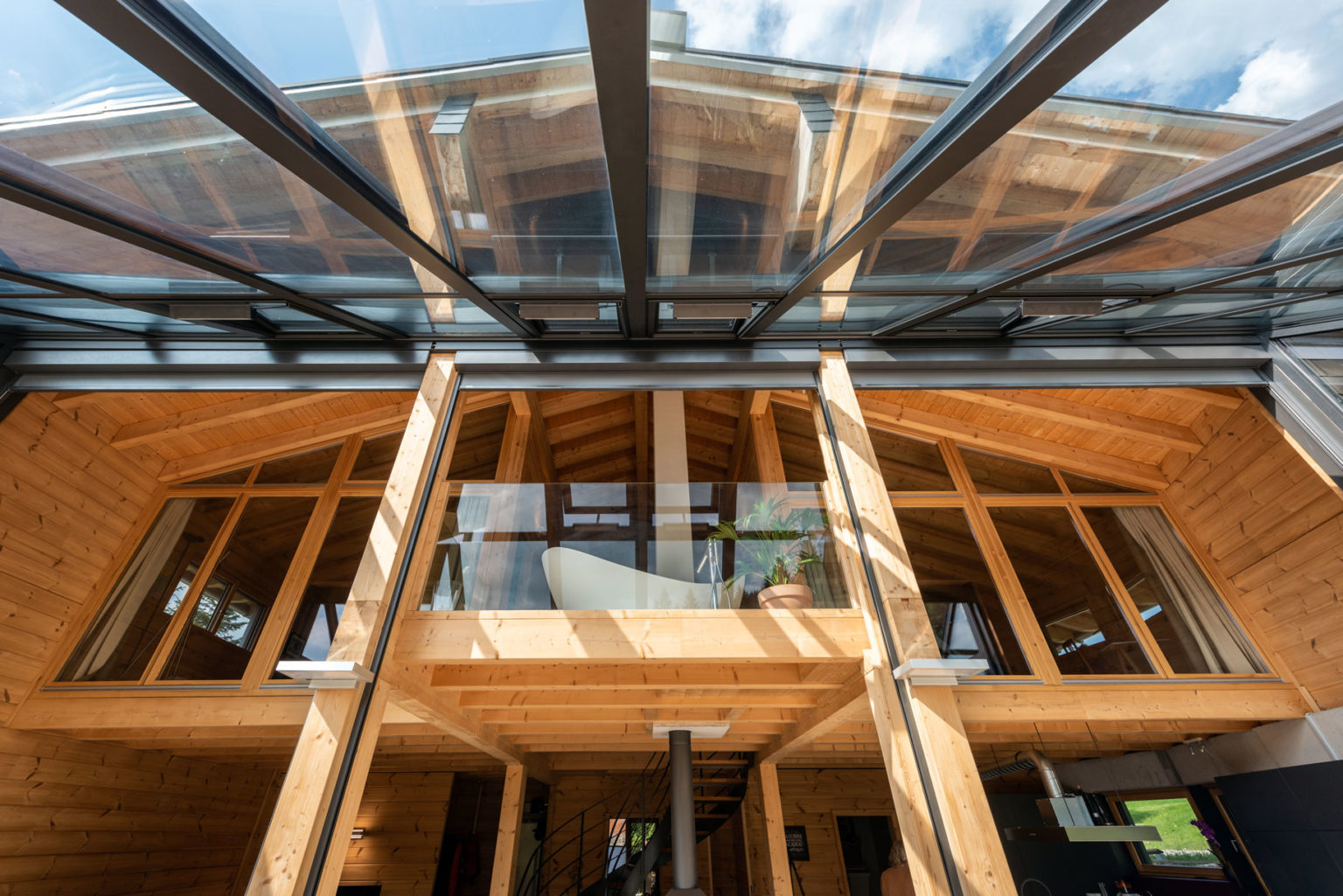 „Mir ist, neben einer ästhetischen Architektur, gesundes Wohnen wichtig. Deshalb habe ich mich für diesen herrlichen, ruhigen Standort mit frischer Bergluft entschieden und für massive, schadstofffreie Wände aus Kiefernholz.“, sagt der unabhängige Unternehmer. Eine UV-Schutz-Lasur für die Holzwände und Decken im Innern kam nicht infrage „um das Raumklima nicht zu beeinflussen“. „Fullwood meinte zwar, dass es nicht nötig sei, aber ich wollte die Hauswände außen dennoch vor dem harten Klima auf knapp 1400m ü. M. schützen. Außerdem möchte ich nicht, dass das Holz vergraut. Deshalb habe ich drei Hausseiten mit Schieferelementen verkleidet, und vor die südliche Giebelfront einen zweistöckigen Wintergarten aus Glas und Alu setzen lassen.“, erklärt er weiter. Abgesehen davon, dass die diffusionsoffenen Massivholzwände seines Hauses „atmen“, trägt eine Holzumgebung nachweislich zur Entspannung bei und bewirkt eine 2-3 Grad höher gefühlte Raumtemperatur.