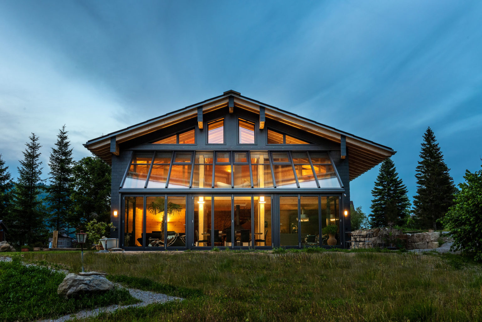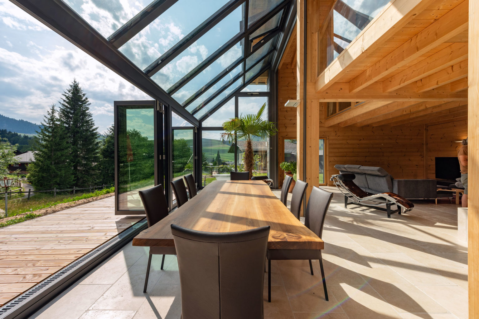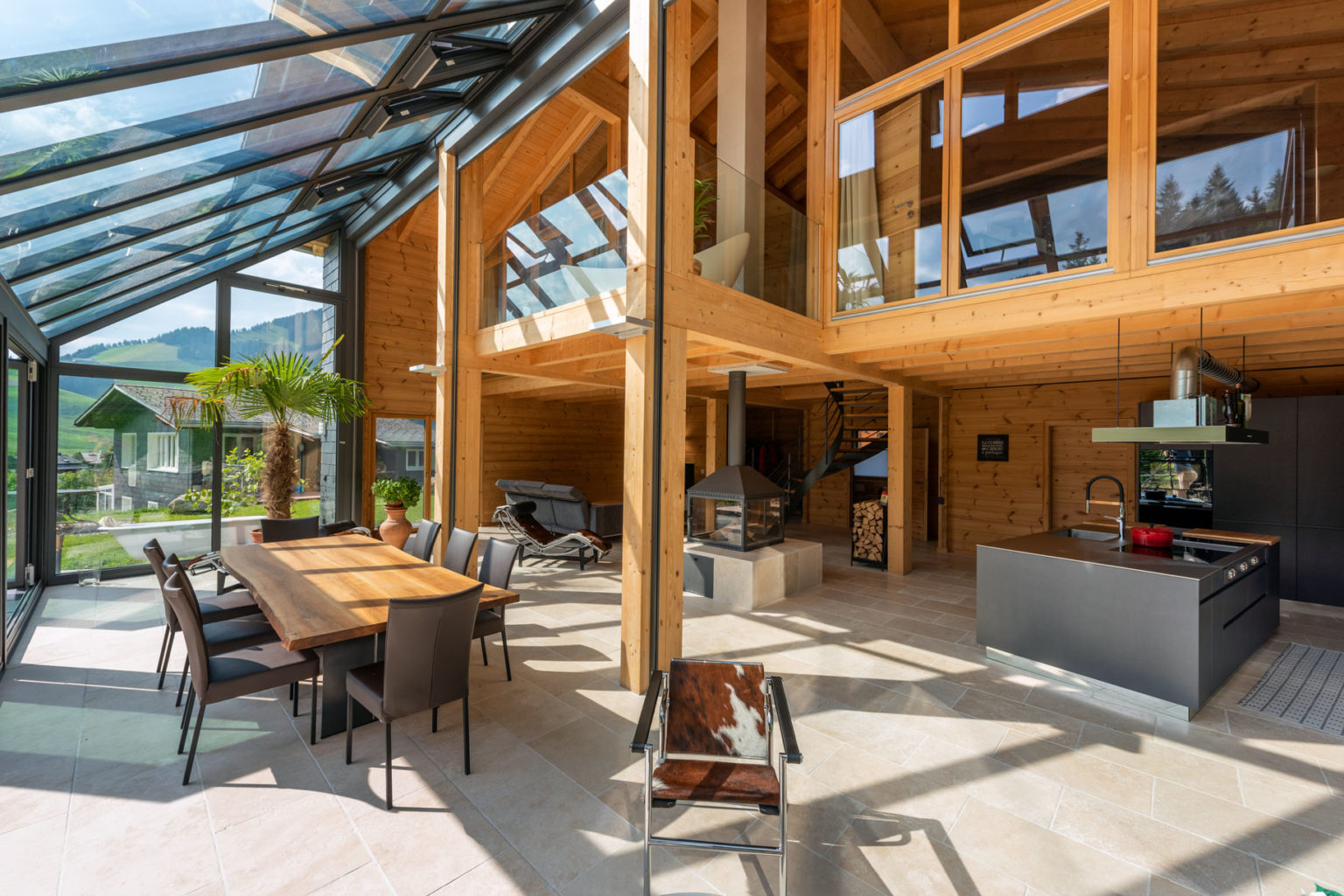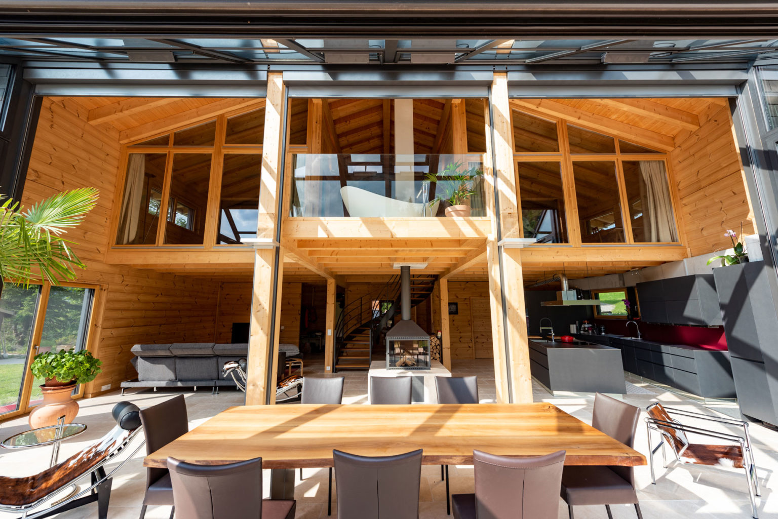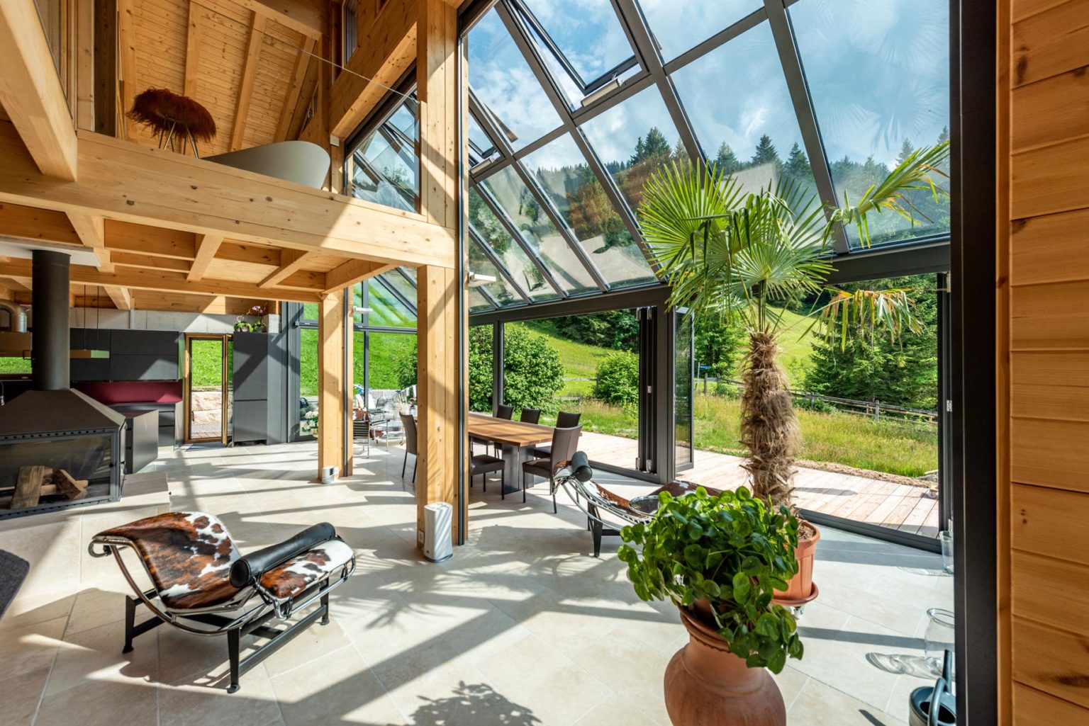 „Mir ist, neben einer ästhetischen Architektur, gesundes Wohnen wichtig. Deshalb habe ich mich für diesen herrlichen, ruhigen Standort mit frischer Bergluft entschieden und für massive, schadstofffreie Wände aus Kiefernholz.“, sagt der unabhängige Unternehmer. Eine UV-Schutz-Lasur für die Holzwände und Decken im Innern kam nicht infrage „um das Raumklima nicht zu beeinflussen“. „Fullwood meinte zwar, dass es nicht nötig sei, aber ich wollte die Hauswände außen dennoch vor dem harten Klima auf knapp 1400m ü. M. schützen. Außerdem möchte ich nicht, dass das Holz vergraut. Deshalb habe ich drei Hausseiten mit Schieferelementen verkleidet, und vor die südliche Giebelfront einen zweistöckigen Wintergarten aus Glas und Alu setzen lassen.“, erklärt er weiter. Abgesehen davon, dass die diffusionsoffenen Massivholzwände seines Hauses „atmen“, trägt eine Holzumgebung nachweislich zur Entspannung bei und bewirkt eine 2-3 Grad höher gefühlte Raumtemperatur.