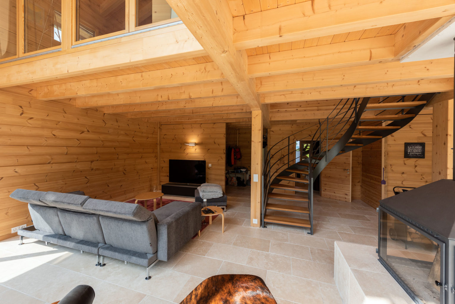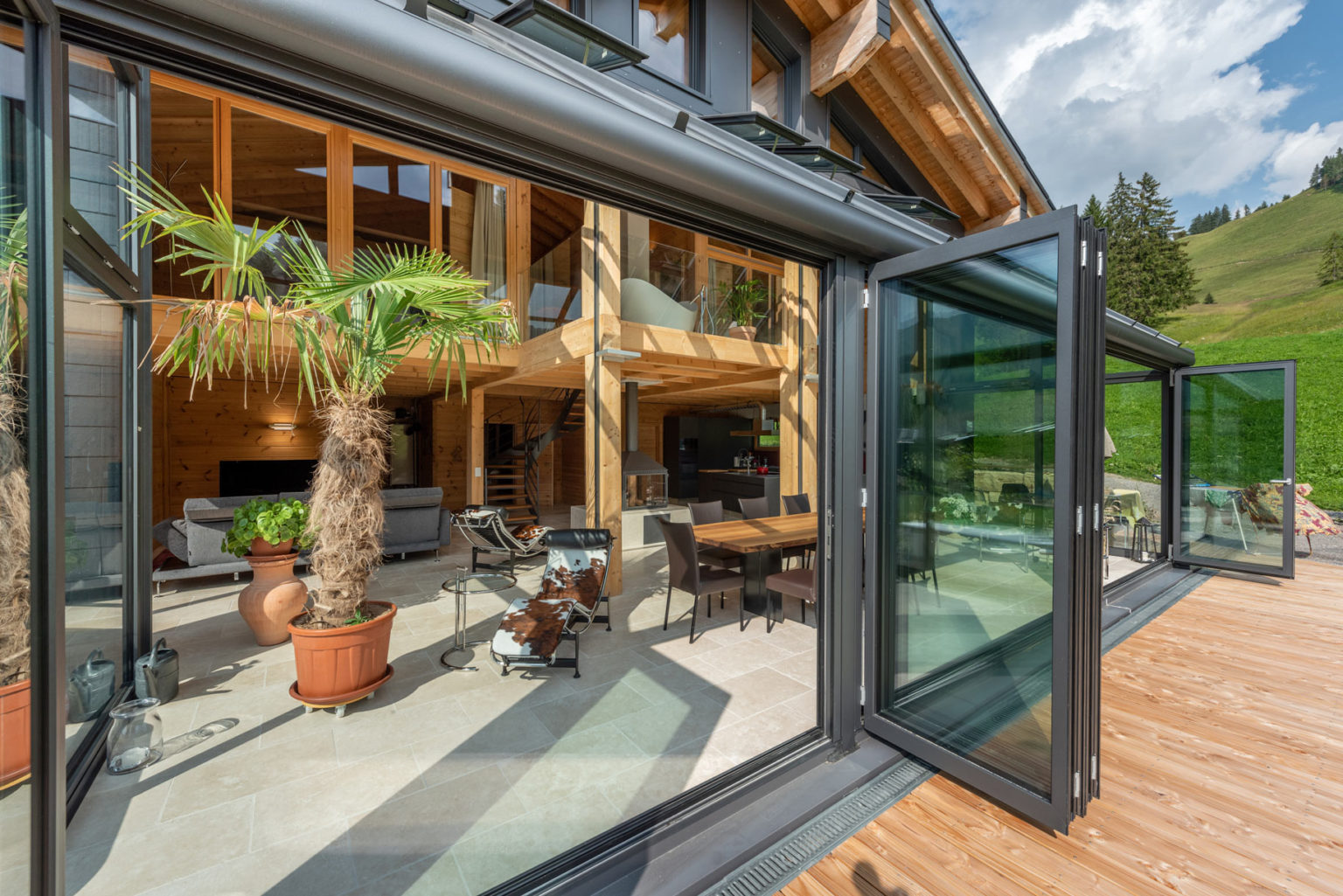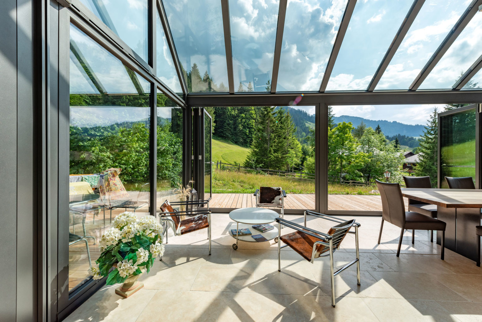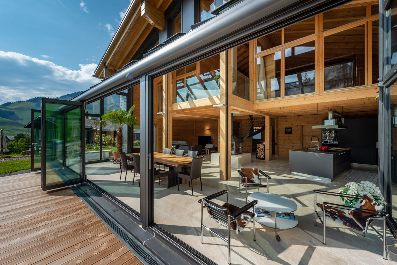 „Mir ist, neben einer ästhetischen Architektur, gesundes Wohnen wichtig. Deshalb habe ich mich für diesen herrlichen, ruhigen Standort mit frischer Bergluft entschieden und für massive, schadstofffreie Wände aus Kiefernholz.“, sagt der unabhängige Unternehmer. Eine UV-Schutz-Lasur für die Holzwände und Decken im Innern kam nicht infrage „um das Raumklima nicht zu beeinflussen“. „Fullwood meinte zwar, dass es nicht nötig sei, aber ich wollte die Hauswände außen dennoch vor dem harten Klima auf knapp 1400m ü. M. schützen. Außerdem möchte ich nicht, dass das Holz vergraut. Deshalb habe ich drei Hausseiten mit Schieferelementen verkleidet, und vor die südliche Giebelfront einen zweistöckigen Wintergarten aus Glas und Alu setzen lassen.“, erklärt er weiter. Abgesehen davon, dass die diffusionsoffenen Massivholzwände seines Hauses „atmen“, trägt eine Holzumgebung nachweislich zur Entspannung bei und bewirkt eine 2-3 Grad höher gefühlte Raumtemperatur.