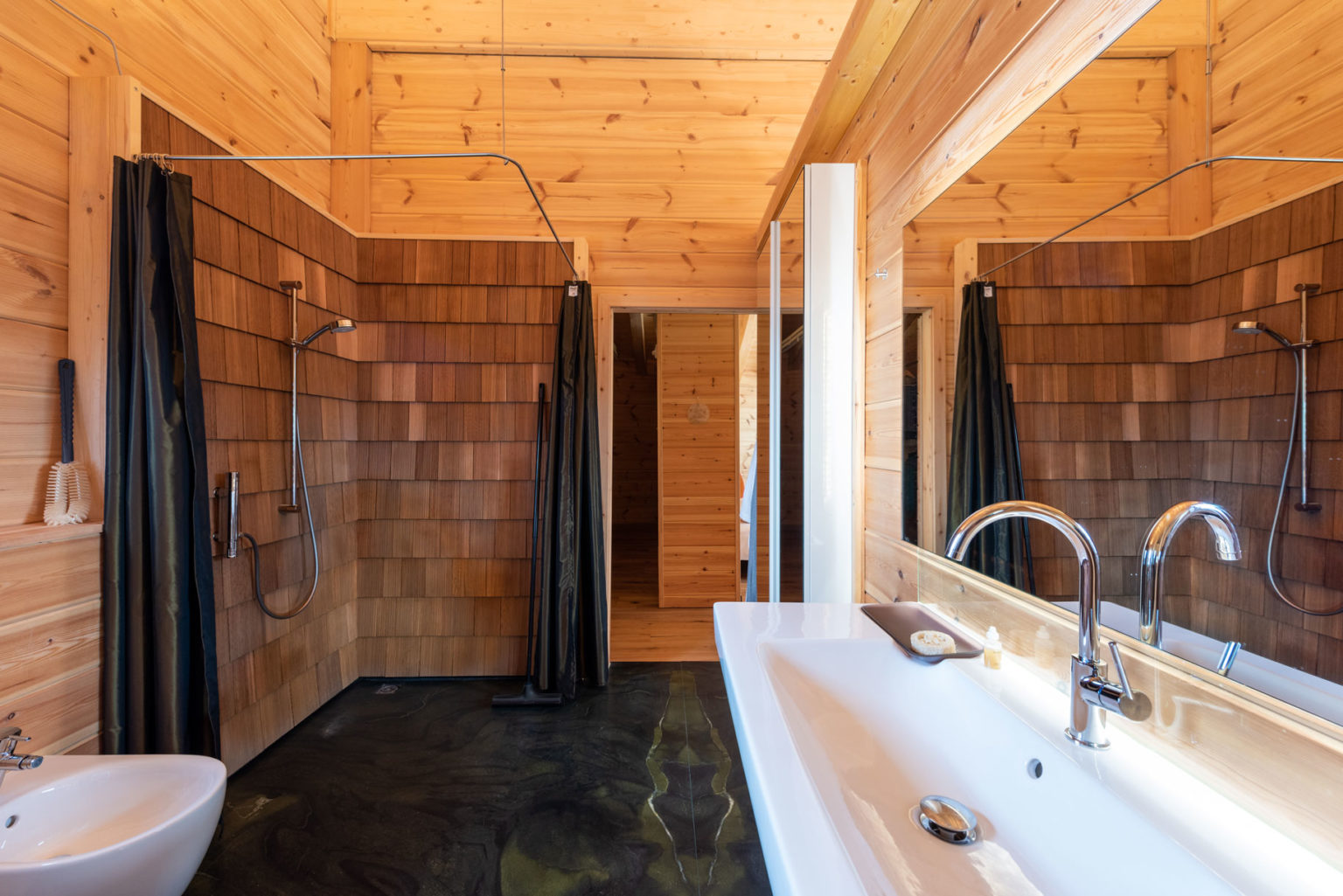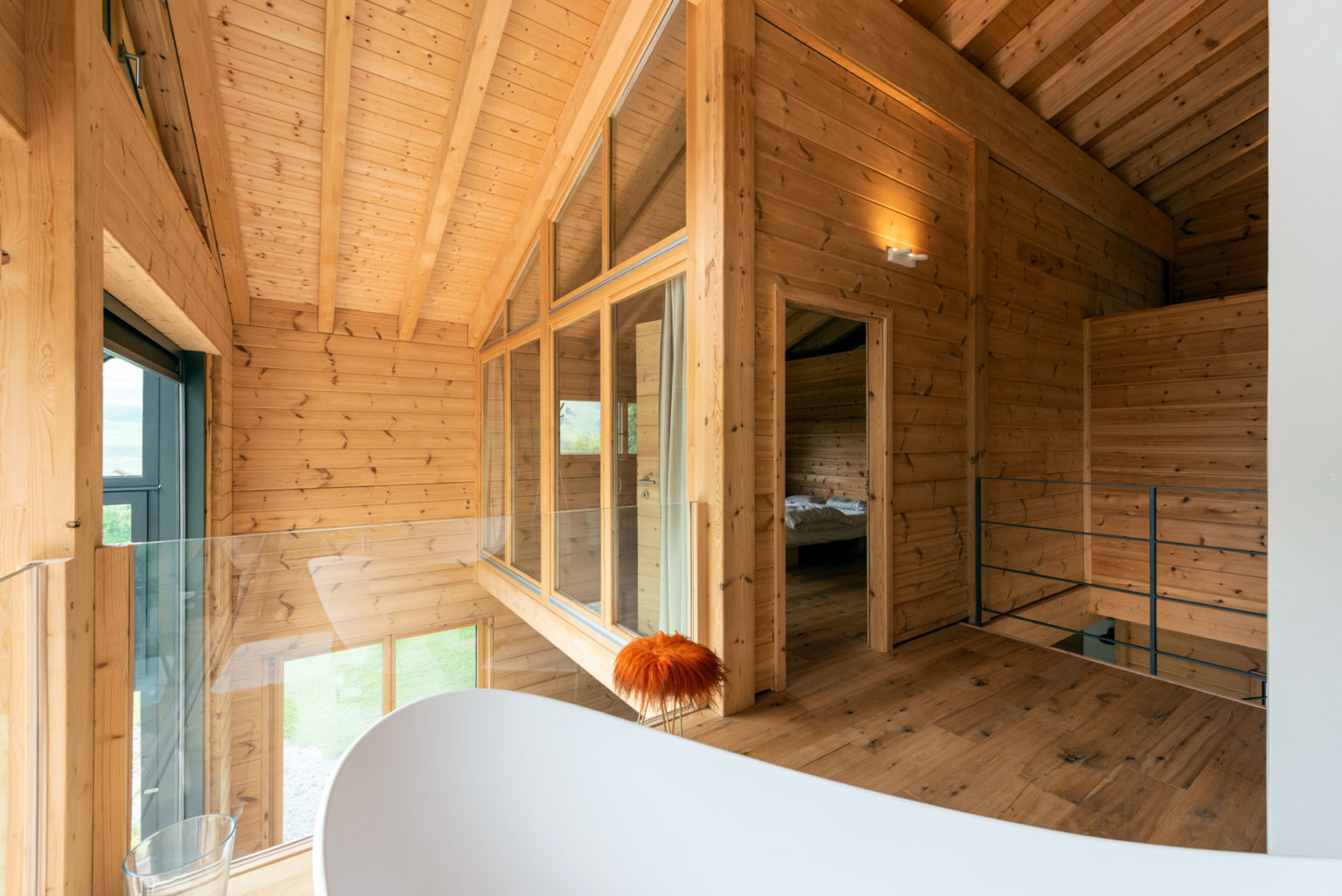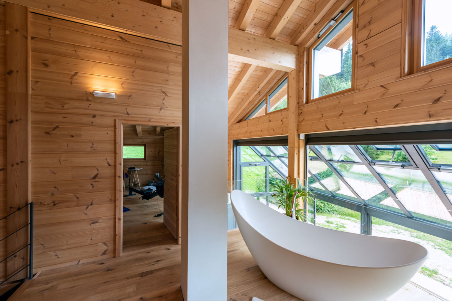 Dank des reichlich einfallenden natürlichen Lichts erstrahlt drinnen alles wunderbar hell; die Kiefernwände leuchten warm und die sandfarbenen Bodenfliesen aus Travertin reflektieren die Sonnenstrahlen gen offener Balkendecke. Sofern eine Geschossdecke vorhanden ist, denn etwa ein Viertel des Erdgeschosses ist bis zur Firstpfette offen: Der Luftraum erstreckt sich bis hinauf auf circa 7,50m! Das komplette Obergeschoss des zweigeschossigen Gebäudes ist bis zum imposanten Sichtdachstuhl offen und die Galerie nur mit Glasscheiben begrenzt, so dass man von einem Teil des Erdgeschosses und von Garten und Terrasse aus die beeindruckende Holzkonstruktion bewundern kann. Auch die Trennwände zwischen den Schlafzimmern im Obergeschoss und dem offenen Luftraum sind nur verglast und ermöglichen wundervolle Ausblicke in die Berglandschaft und den sich stets wandelnden Himmel darüber. So lieben es die Hausbewohner besonders, von ihrer Design-Badewanne auf der „Wellnessgalerie“ aus das Licht und die Farben der Tages- und Jahreszeiten zu genießen – ein wahrhaft himmlisches Vergnügen. Der Hausgrundriss entspricht einem schlichten Rechteck, das an einer der kurzen Seiten mittig einen flachen Winkel besitzt. Diese Form schützt das Holzhaus dort, an der östlichen „Wetterseite“, vor der harten Witterung, unterstützt durch den auf dieser Seite größeren Dachüberstand. Hier befindet sich auch die erwähnte Betonwand. Der Hauseingang empfangt an der Nordseite. Von dort gelangt man in einen geschlossenen Windfang und weiter in den Eingangsbereich (inklusive Garderobe) mit Zugang zur Gäste-Dusche/WC und Übergang zum komplett offenen Wohnbereich. Hier gehen Wohnzimmer, Küche, Esszimmer und Wintergarten fließend und barrierefrei auf einer Ebene ineinander über. Vier Holzstützen gliedern den weitläufigen Wohnbereich in wenige Teilbereiche. Die Geschosstreppe ist gleichzeitig eine Art Sichtschutz zum Eingangsbereich und zwischen Küche und Wohnzimmer. In der Hausmitte befindet sich als Herzstück der nach allen vier Seiten verglaste Kaminofen, so dass man von jedem Bereich aus ins Feuer blicken kann. Direkt von der Küche geht es in einen geräumigen Heizungs- und Vorratsraum, der einen separaten Zugang von draußen hat und somit kurze Wege für den Transport von Einkäufen bietet. Im Obergeschoss befinden sich die privaten Rückzugsorte in Form von zwei Schlafzimmern (das eins davon mit angeschlossener Ankleide, das andere mit abgetrenntem Arbeitsbereich) und einem luxuriösem Duschbad. Zugänglich sind die Zimmer von der Galerie aus, auf der auch besagte Badewanne steht. Von hier kann man den Blick in den Wohnbereich der Holzhaus Villa oder ins wundervolle Grüne schweifen lassen.