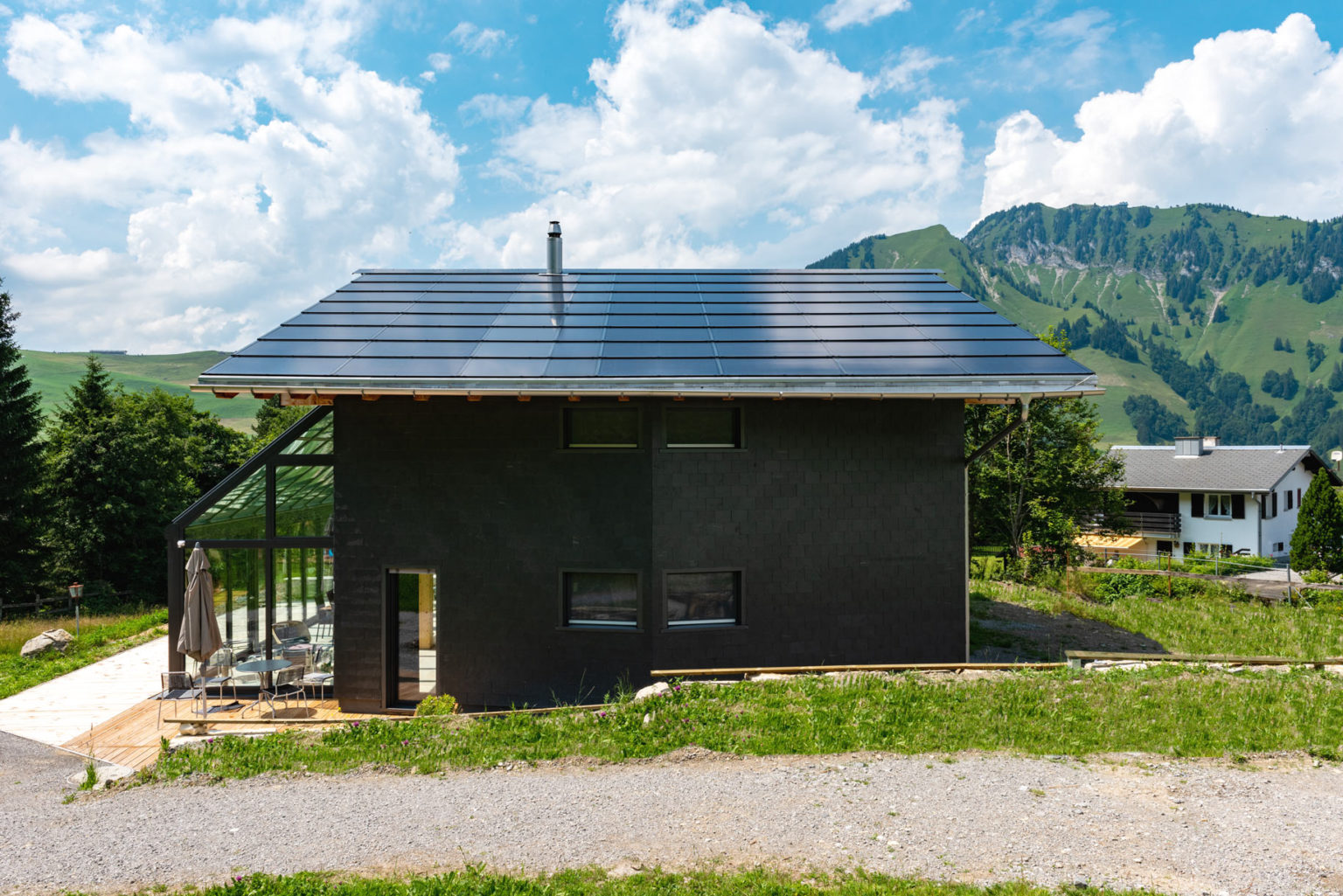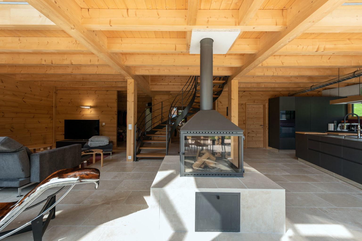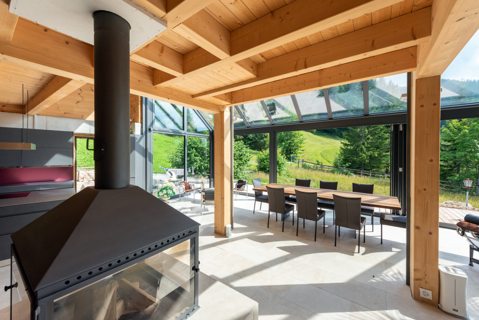 Nicht nur der natürliche Baustoff Holz ist regenerativ, auch zur Stromproduktion nutzt der Hauseigentümer erneuerbare Energie: Holzhaus „am Ächerli“ besitzt eine hochmoderne Indach-Photovoltaikanlage. Diese wandelt die aufgefangene Sonnenenergie in 29 kW Strom um, das ist deutlich mehr, als der Zweipersonenhaushalt (plus Gäste) benötigt und reicht für insgesamt sechs Haushalte. Die mit 19,5 Grad relativ flache Neigung des Satteldachs ist ideal um tagsüber möglichst viel Sonneneinstrahlung zu erhalten. „Im Winter profitieren wir sogar noch von der tiefstehenden Sonne. Die scheint durch die verglaste Süd-Front ins Haus hinein und bringt zusätzliche Wärme.“, freut sich der Hauseigner. Beheizt wird das Holzhaus mit einer Fußbodenheizung und einem zu allen vier Seiten verglasten Kaminofen, der sich mitten im offenen Wohnbereich befindet. „Die Strahlungswärme ist besonders angenehmen und das Flammenspiel sehr meditativ.“, schwärmt er. Betrieben wird die Fußbodenheizung mit einer Wärmepumpe.