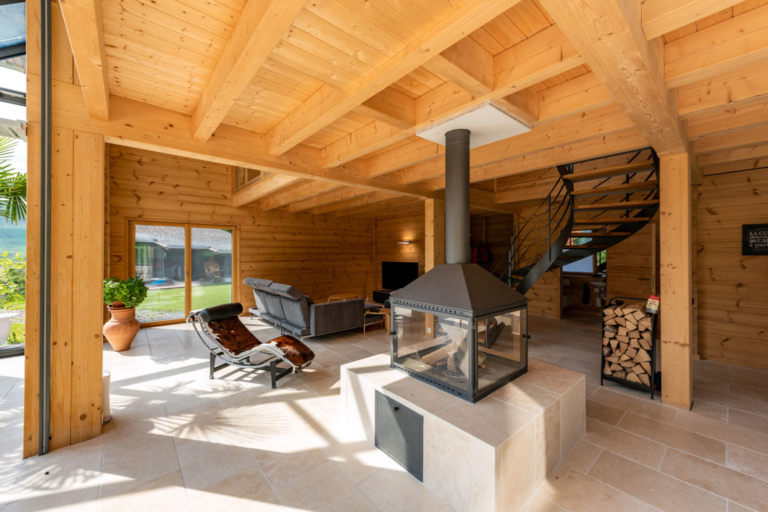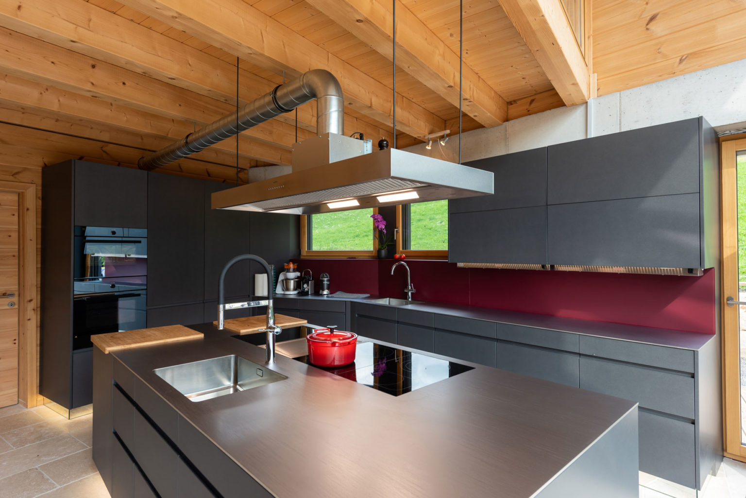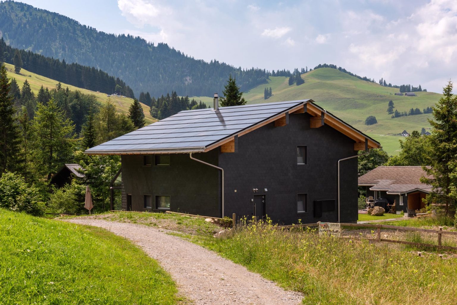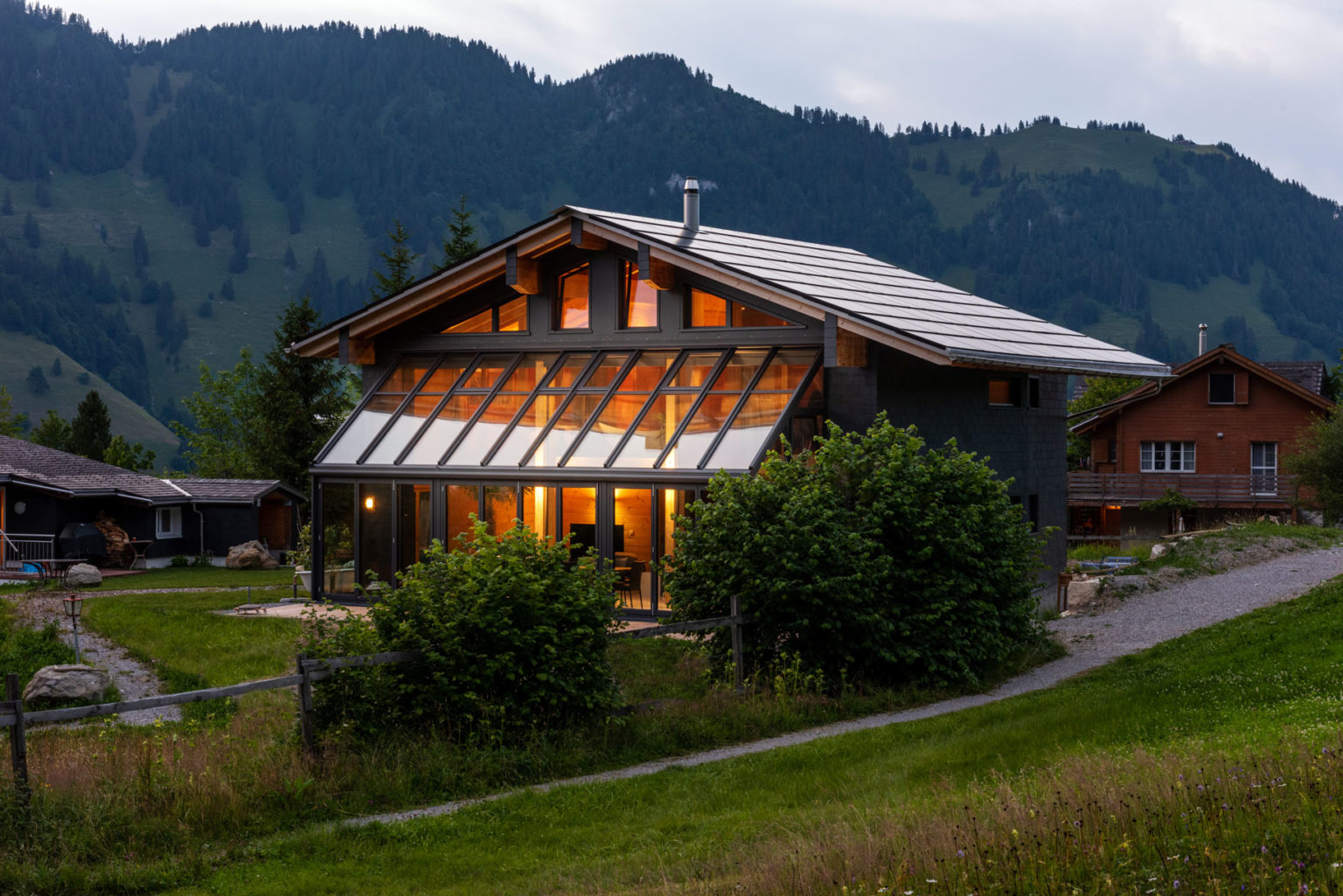 Nicht nur der natürliche Baustoff Holz ist regenerativ, auch zur Stromproduktion nutzt der Hauseigentümer erneuerbare Energie: Holzhaus „am Ächerli“ besitzt eine hochmoderne Indach-Photovoltaikanlage. Diese wandelt die aufgefangene Sonnenenergie in 29 kW Strom um, das ist deutlich mehr, als der Zweipersonenhaushalt (plus Gäste) benötigt und reicht für insgesamt sechs Haushalte. Die mit 19,5 Grad relativ flache Neigung des Satteldachs ist ideal um tagsüber möglichst viel Sonneneinstrahlung zu erhalten. „Im Winter profitieren wir sogar noch von der tiefstehenden Sonne. Die scheint durch die verglaste Süd-Front ins Haus hinein und bringt zusätzliche Wärme.“, freut sich der Hauseigner. Beheizt wird das Holzhaus mit einer Fußbodenheizung und einem zu allen vier Seiten verglasten Kaminofen, der sich mitten im offenen Wohnbereich befindet. „Die Strahlungswärme ist besonders angenehmen und das Flammenspiel sehr meditativ.“, schwärmt er. Betrieben wird die Fußbodenheizung mit einer Wärmepumpe.