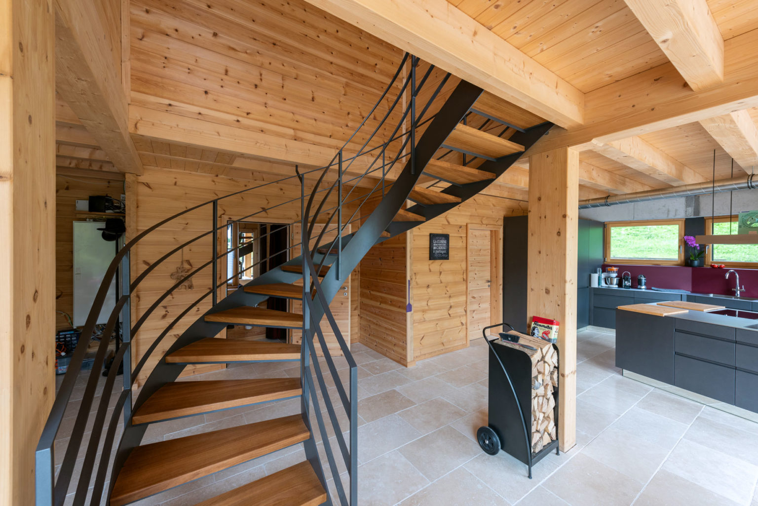 Passend zu den tragenden Elementen des Wintergartens sind auch die Fensterrahmen außen aus anthrazitfarbenen Aluminium. Drinnen jedoch sind sie aus hellem Kiefernholz, und entsprechen den Wänden, Balkendecken, Sichtdachstuhl und Zimmertüren. „Die Türen habe ich eigens von einem Schreiner aus Halbbohlen des Hausherstellers bauen lassen, so dass sie sich fast unsichtbar in die Holzwände einfügen.“, äußert der ideenreiche Hausbesitzer. „Und in der Dusche habe ich anstatt Wandfliesen wasserfeste Zedernholzschindeln montiert.“ Der Boden im Bad ist mit einem dunkelgrünen afrikanischen Stein ausgestattet, der in riesengroße Platten aufgeschnitten und gespiegelt ausgelegt wurde. Die Fußböden im Obergeschoss sind ansonsten mit fußwarmen Holzdielen verkleidet. „Da wir schon so viel Holz im Haus haben, wollte ich nicht auch noch eine Holztreppe, sondern habe mich lieber für eine anthrazitfarbene Wendeltreppe aus Stahl entschieden, ebenfalls ein Unikat. Nur die Tritte sind aus Holz.“, fährt der Hausherr fort. Farblich passend zu den vereinzelten anthrazitfarbenen Elementen sind auch die hochmoderne Küche mit großer Kochinsel, das Sofa sowie die Esszimmerstühle. Im Kontrast und als ausgewogene Ergänzung zu dem haptisch und olfaktorisch sehr sinnlichen und präsenten Naturstoff Holz steht das transparente, fast unsichtbare Glas und das sachliche, kühlende Metall. Alles in allem bewirkt diese Kombination eine sehr kurzweilige, harmonische Atmosphäre, die sowohl modern als auch behaglich ist. Genossen wird dies alles wiederum in echter Teammanier vom Hauseigentümer und seiner Lebensgefährtin gemeinsam.