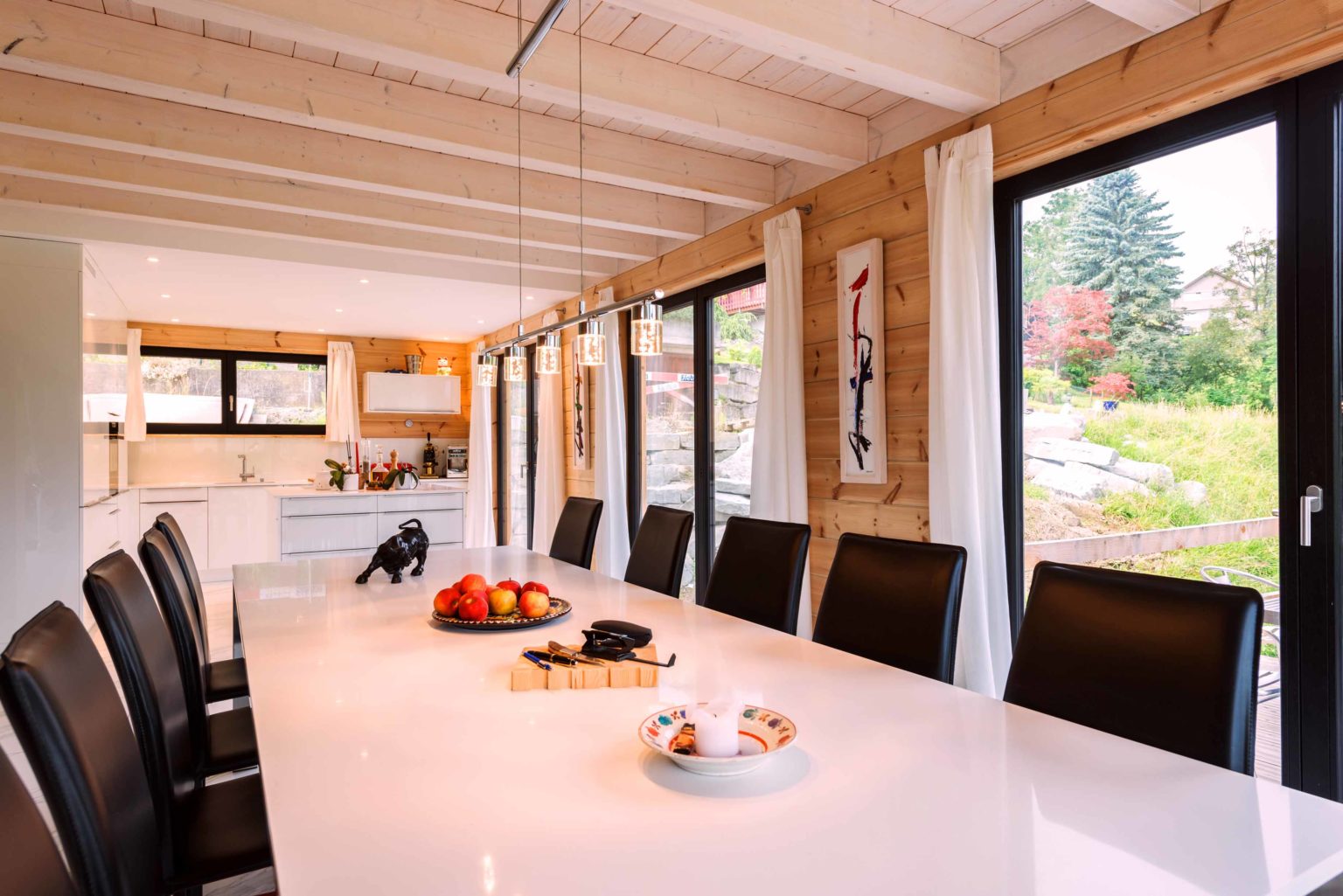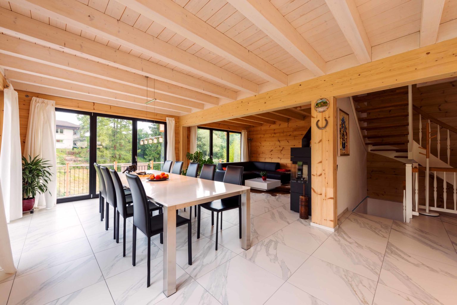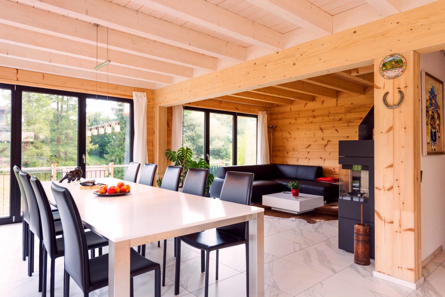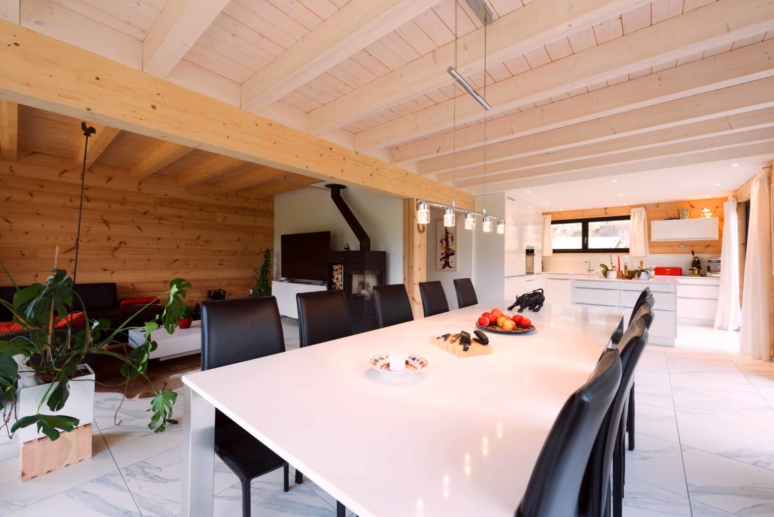 Man betritt den rechteckigen Grundriss an der Ostseite (Bergseite) und gelangt in eine große, lichte Empfangshalle mit bis zum Firstbalken hohen Luftraum. Von dort schwingt sich eine helle Holztreppe hinauf auf die Galerie, die zum Büro, zum Schlafzimmer und zum Wohnbad führt. Bleibt man in der Diele im Erdgeschoss findet man ein Gäste-Bad/WC vor, den Abgang ins Untergeschoss sowie den doppelflügeligen, offenen Zugang zum Wohnbereich. Dieser ist ebenfalls offen und sehr großzügig gehalten: Küche, Esszimmer und Wohnzimmer befinden sich in dem L-förmigen Raum und gehen fließend ineinander über. Allein der offene Wohnbereich nimmt drei Viertel des Erdgeschosses ein. Im ganzen Holzhaus legt Boris Frischknecht viel Wert auf maximale Helligkeit und hat deshalb alle Holzwände mit UV-Schutz vor dem Nachdunkeln bewahrt; weiß verputzte Trennwände (Leichtbau) zu den tragenden Massivholzwänden kombiniert; weiße, leicht marmorierte Bodenfliesenrechtecke verlegen lassen; die offene Sichtbalkendecke im Essbereich mit milchiger Lasur aufgehellt; weiß glänzende Küchenmöbel ausgewählt und über der Küche viele Lichtspots in die dort glatte, weiß gestrichene Zimmerdecke integriert. Das reichlich einfallende Tageslicht bringt alles zum Strahlen. Die moderne Einrichtung in weiß und schwarz harmoniert hervorragend mit dem bodenständigen, naturhellen Holz und nimmt dem Holzhaus nicht seinen typischen Charakter. Den wollte der Hausherr unbedingt erhalten, nur eben in zeitgemäßen Stil. Als Trumpf wartet Holzhaus „am Bächli“ mit einem einzigartigen, gesunden Raumklima auf, das seinesgleichen sucht.