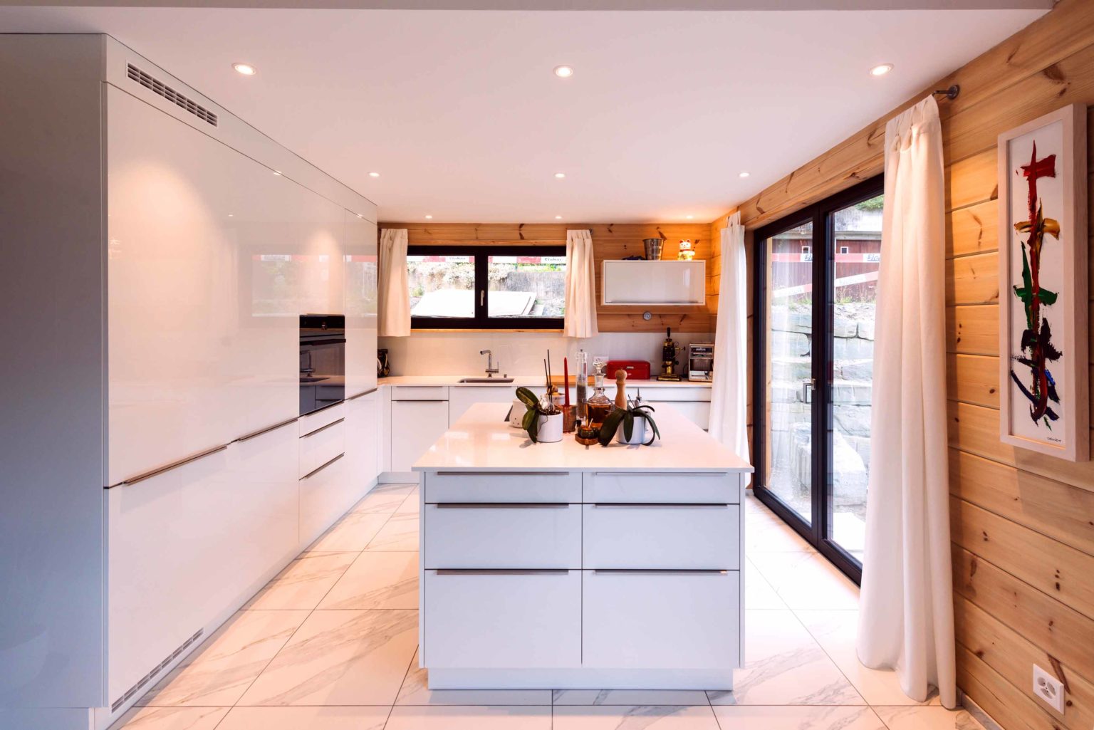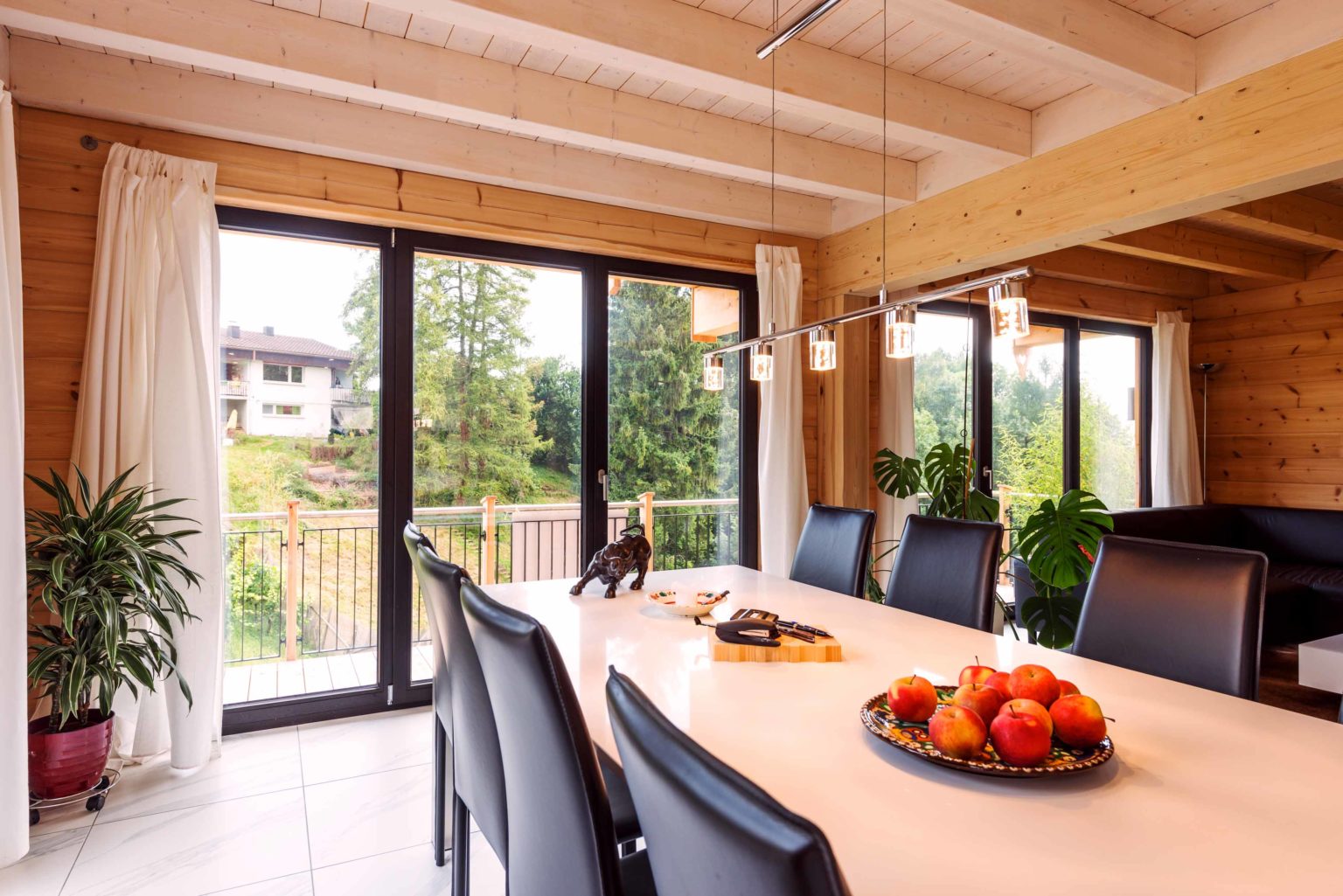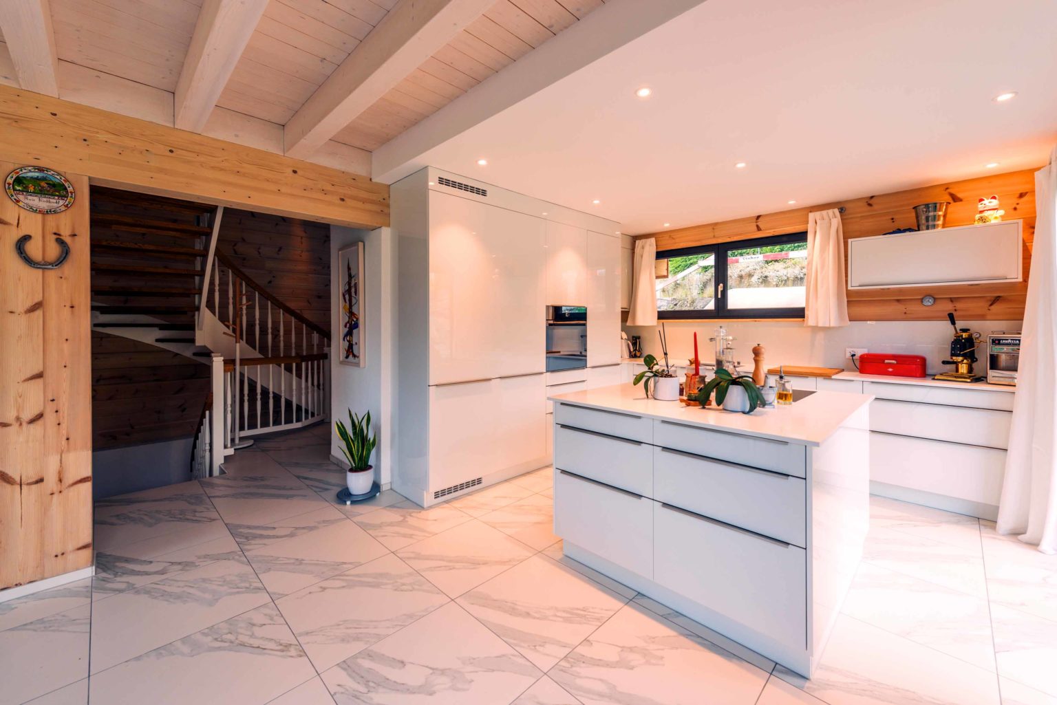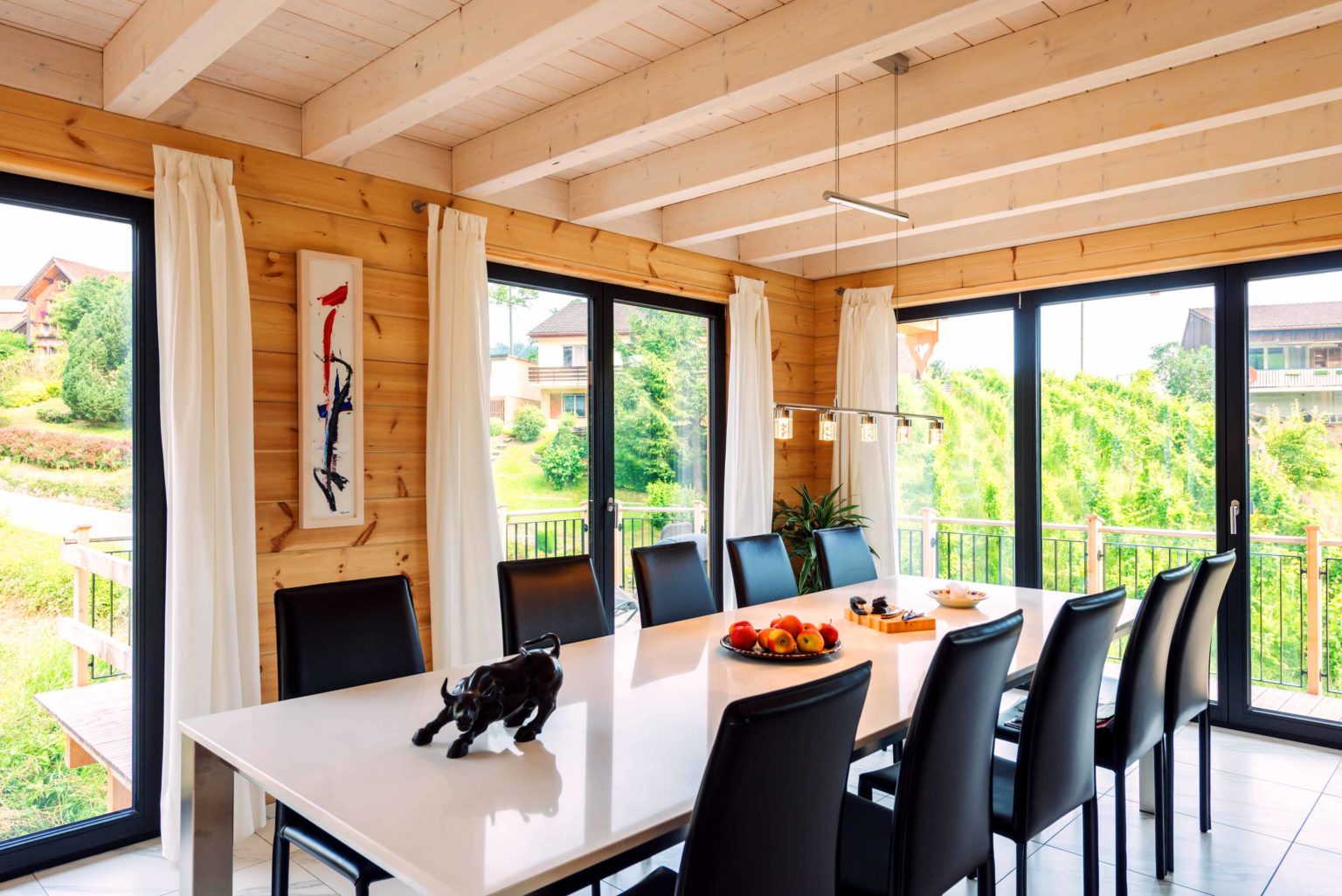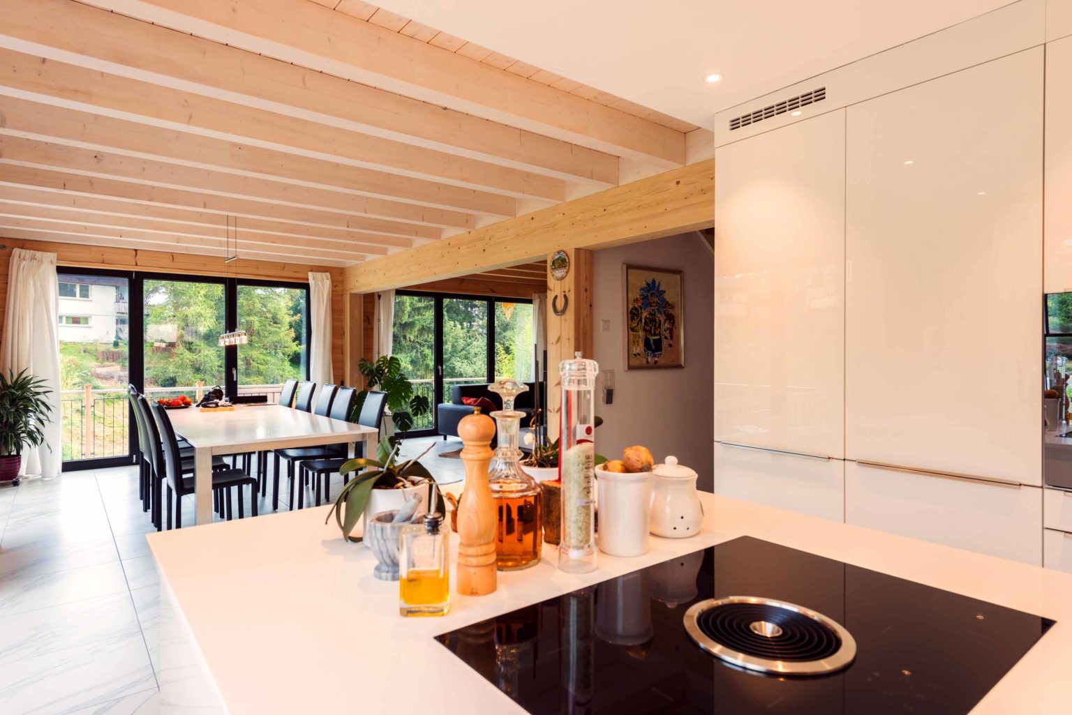Man betritt den rechteckigen Grundriss an der Ostseite (Bergseite) und gelangt in eine große, lichte Empfangshalle mit bis zum Firstbalken hohen Luftraum. Von dort schwingt sich eine helle Holztreppe hinauf auf die Galerie, die zum Büro, zum Schlafzimmer und zum Wohnbad führt. Bleibt man in der Diele im Erdgeschoss findet man ein Gäste-Bad/WC vor, den Abgang ins Untergeschoss sowie den doppelflügeligen, offenen Zugang zum Wohnbereich. Dieser ist ebenfalls offen und sehr großzügig gehalten: Küche, Esszimmer und Wohnzimmer befinden sich in dem L-förmigen Raum und gehen fließend ineinander über. Allein der offene Wohnbereich nimmt drei Viertel des Erdgeschosses ein. Im ganzen Holzhaus legt Boris Frischknecht viel Wert auf maximale Helligkeit und hat deshalb alle Holzwände mit UV-Schutz vor dem Nachdunkeln bewahrt; weiß verputzte Trennwände (Leichtbau) zu den tragenden Massivholzwänden kombiniert; weiße, leicht marmorierte Bodenfliesenrechtecke verlegen lassen; die offene Sichtbalkendecke im Essbereich mit milchiger Lasur aufgehellt; weiß glänzende Küchenmöbel ausgewählt und über der Küche viele Lichtspots in die dort glatte, weiß gestrichene Zimmerdecke integriert. Das reichlich einfallende Tageslicht bringt alles zum Strahlen. Die moderne Einrichtung in weiß und schwarz harmoniert hervorragend mit dem bodenständigen, naturhellen Holz und nimmt dem Holzhaus nicht seinen typischen Charakter. Den wollte der Hausherr unbedingt erhalten, nur eben in zeitgemäßen Stil. Als Trumpf wartet Holzhaus „am Bächli“ mit einem einzigartigen, gesunden Raumklima auf, das seinesgleichen sucht.