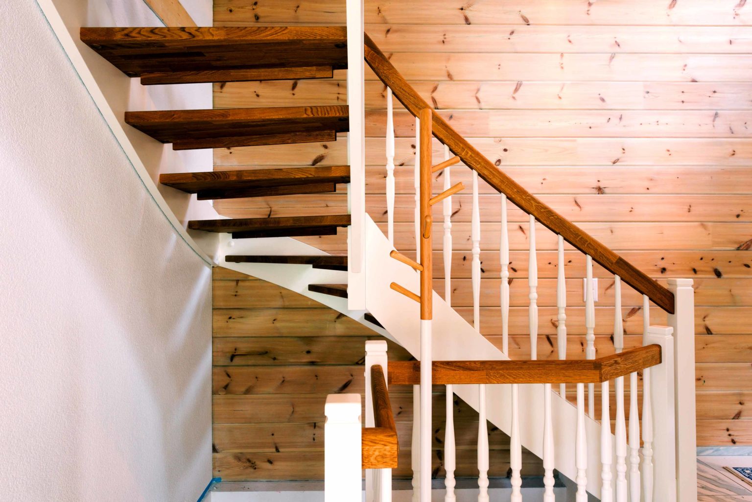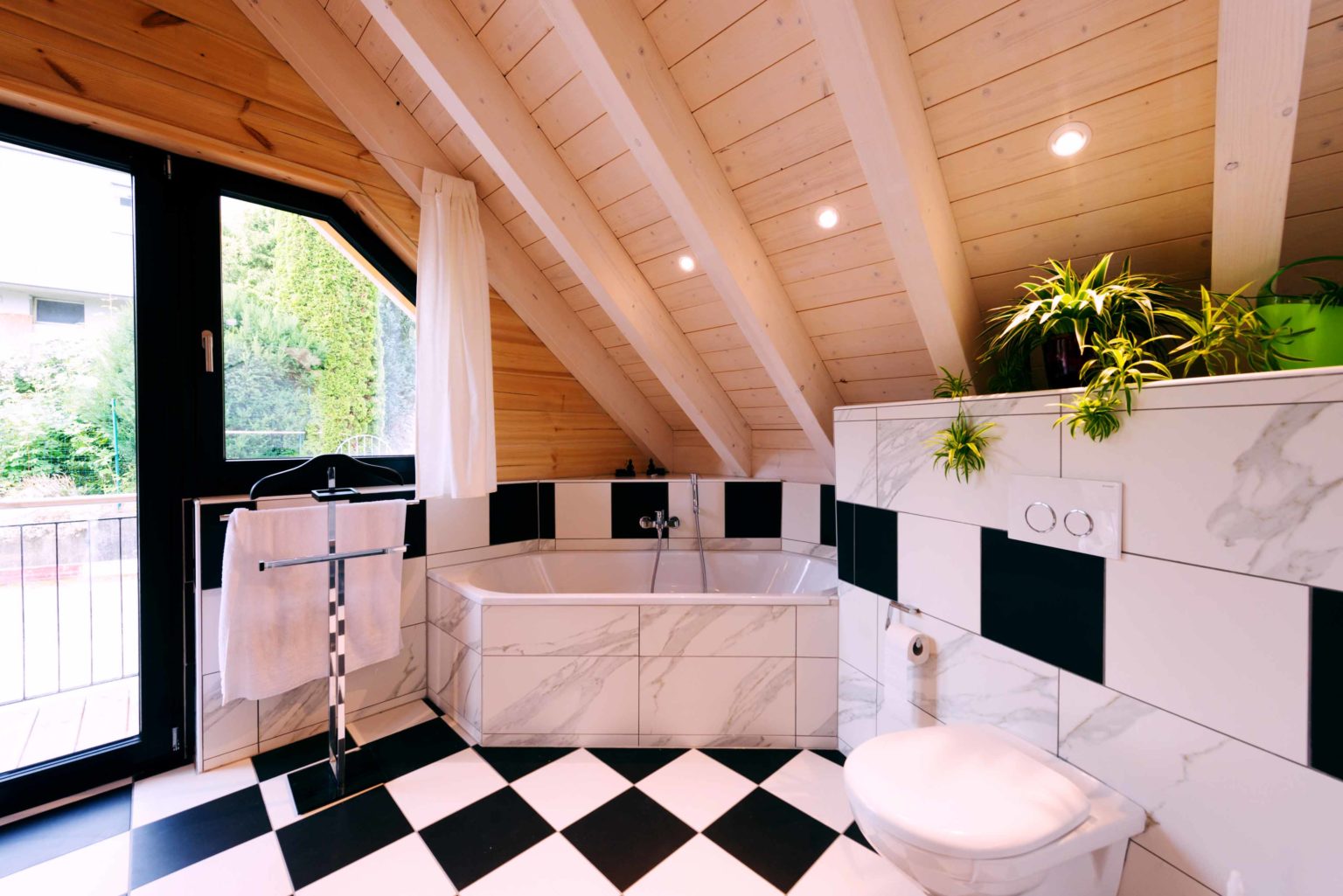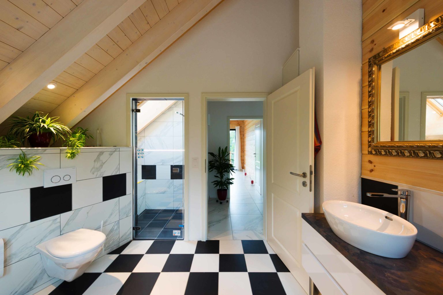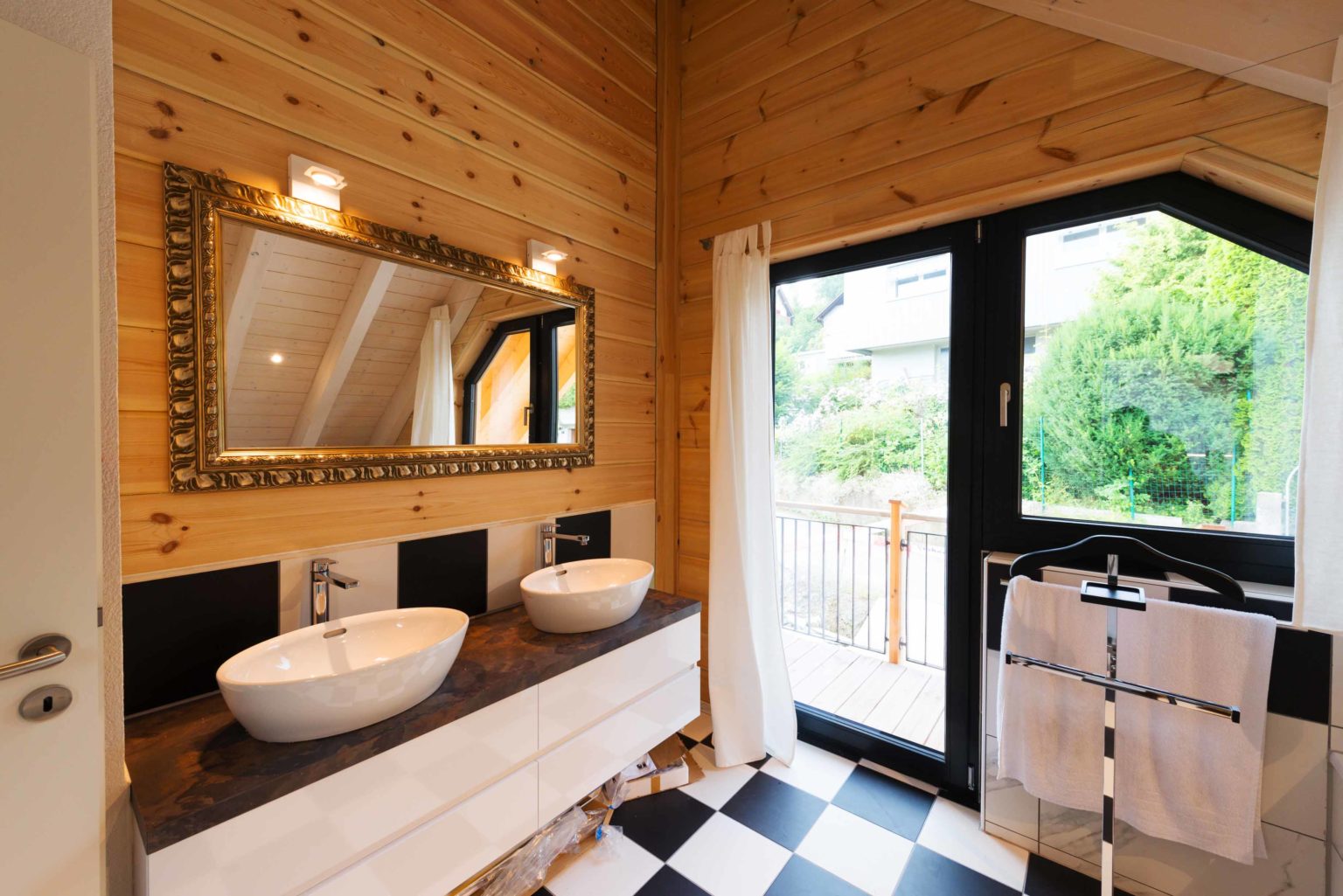 Man betritt den rechteckigen Grundriss an der Ostseite (Bergseite) und gelangt in eine große, lichte Empfangshalle mit bis zum Firstbalken hohen Luftraum. Von dort schwingt sich eine helle Holztreppe hinauf auf die Galerie, die zum Büro, zum Schlafzimmer und zum Wohnbad führt. Bleibt man in der Diele im Erdgeschoss findet man ein Gäste-Bad/WC vor, den Abgang ins Untergeschoss sowie den doppelflügeligen, offenen Zugang zum Wohnbereich. Dieser ist ebenfalls offen und sehr großzügig gehalten: Küche, Esszimmer und Wohnzimmer befinden sich in dem L-förmigen Raum und gehen fließend ineinander über. Allein der offene Wohnbereich nimmt drei Viertel des Erdgeschosses ein. Im ganzen Holzhaus legt Boris Frischknecht viel Wert auf maximale Helligkeit und hat deshalb alle Holzwände mit UV-Schutz vor dem Nachdunkeln bewahrt; weiß verputzte Trennwände (Leichtbau) zu den tragenden Massivholzwänden kombiniert; weiße, leicht marmorierte Bodenfliesenrechtecke verlegen lassen; die offene Sichtbalkendecke im Essbereich mit milchiger Lasur aufgehellt; weiß glänzende Küchenmöbel ausgewählt und über der Küche viele Lichtspots in die dort glatte, weiß gestrichene Zimmerdecke integriert. Das reichlich einfallende Tageslicht bringt alles zum Strahlen. Die moderne Einrichtung in weiß und schwarz harmoniert hervorragend mit dem bodenständigen, naturhellen Holz und nimmt dem Holzhaus nicht seinen typischen Charakter. Den wollte der Hausherr unbedingt erhalten, nur eben in zeitgemäßen Stil. Als Trumpf wartet Holzhaus „am Bächli“ mit einem einzigartigen, gesunden Raumklima auf, das seinesgleichen sucht.