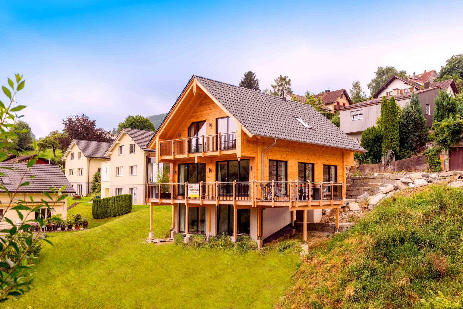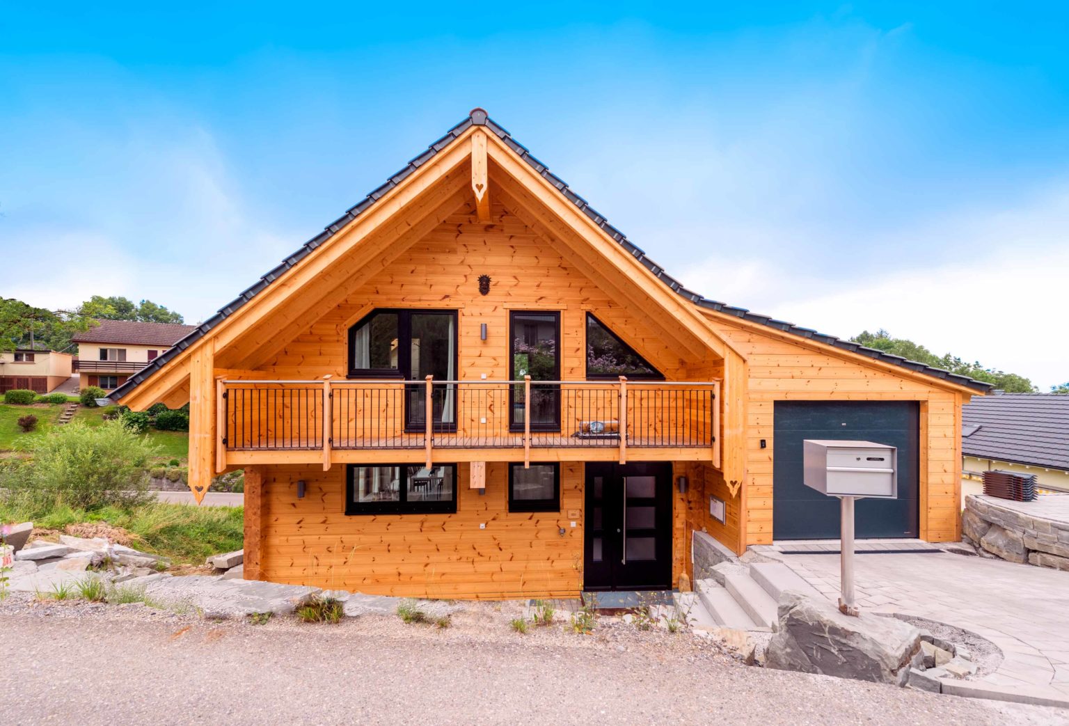 Die Vorliebe für das Einmalige, Nichtalltägliche in Verbindung mit Natur bewog Boris Frischknecht ein echtes, ganz massives Holzhaus zu bauen. Da er aus voller Überzeugung auch Vertriebsmitarbeiter von Fullwood in der Schweiz ist, kam für ihn natürlich ausschließlich ein Holzhaus seines erfahrenen Holzhaus Spezialisten infrage. Bisher empfing der engagierte Holzhaus Fan Bauinteressenten in einem angemieteten Büro, nun kann er von zu Hause aus arbeiten und den Besuchern auch gleich sein eigenes Fullwood als Anschauungsobjekt zeigen. Natürlich nur nach telefonischer Terminvereinbarung, denn Holzhaus „am Bächli“ ist schließlich auch sein privates Wohnhaus. Architektonisch ist Holzhaus „am Bächli“ geradlinig und ganz klassisch gehalten, mit einem einzigen verspielten Element in Form von zwei hölzernen Zierherzen am Balkon.