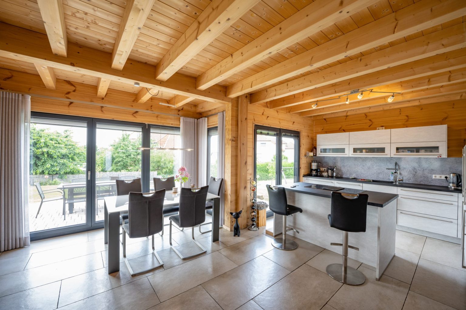 Holzhaus „am Deister“ ist eineinhalbgeschossig und besitzt einen annähernd quadratischen Grundriss, aus dem an der Gartenseite ein zweigeschossiger, rechteckiger Erker mit eigenem Satteldach hervorragt. Im Erdgeschoss erweitert dieser Erker den offenen Wohnbereich und im Dachgeschoss das Schlafzimmer. Da er an der Front bodentief verglast ist, sorgt er in beiden Bereichen für zusätzlichen Lichteinfall von draußen. „Unser Haus ist lichtdurchflutet, besonders der Wohnbereich und das Schlafzimmer, genauso, wie wir uns das gewünscht haben. Die weiß gestrichenen Innenwände reflektieren das Sonnenlicht und die Blockwände leuchten durch das einfallende Tageslicht hell und warm.“, schwärmt Hauseigentümerin Pascale Kerner. Auch den unvergleichlichen, dezenten Kiefernduft in ihrem Heim liebt sie sehr – bewusst wahrnehmen kann sie ihn aber nur noch, wenn sie nach längerer Abwesenheit nach Hause kommt. Ihrem Mann geht es ebenso – die Nase gewöhnt sich an Gerüche. „Die angenehme, warme Atmosphäre unseres Hauses und das wohltuende Raumklima nehmen wir aber noch tagtäglich wahr, ein wenig Achtsamkeit reicht da aus und wir fühlen uns hier bestimmt nicht grundlos so wohl.“, meint Michael Kerner. Unterteilt ist das Erdgeschoss in eine geräumige Diele, die zum Wohnbereich hin offen ist; den großen Wohnbereich, in dem Küche, Esszimmer und Wohnzimmer ineinander übergehen; Arbeitszimmer; Technikraum/HWR mit Durchgang zur angeschlossenen Garage sowie Gäste-Dusche/WC. Über eine offene Treppe aus Eschenholz und Stahl gelangt man von der Diele auf den Flur im Dachgeschoss, von wo es zum großen Schlafzimmer, ins große Badezimmer und in einen Gymnastikraum geht.