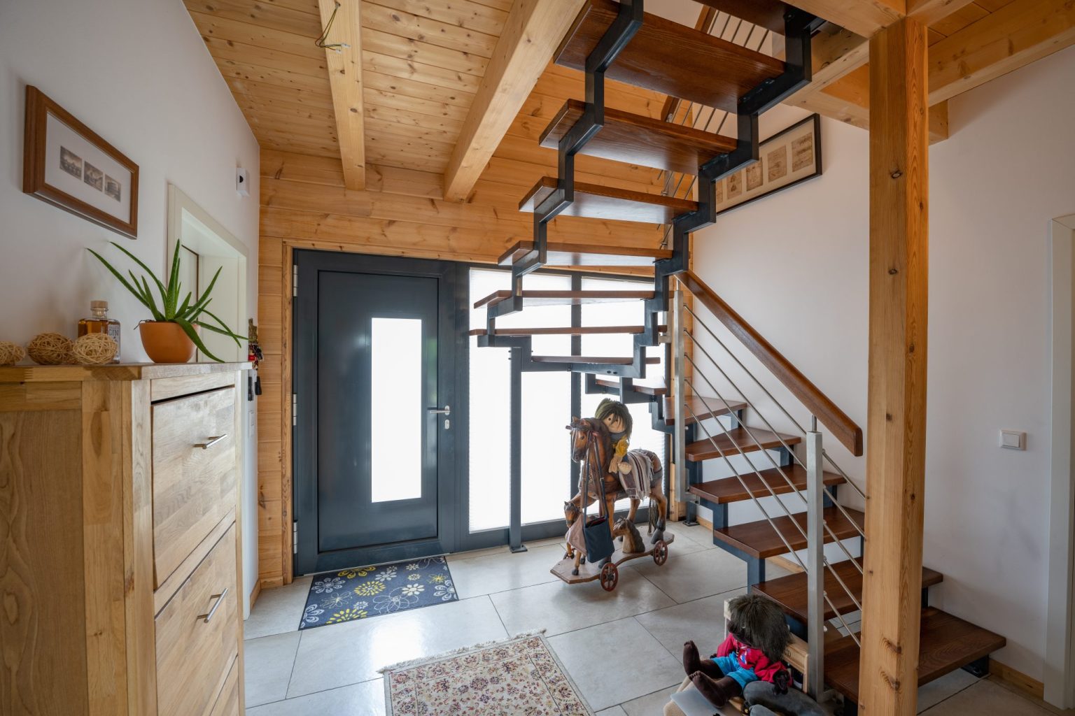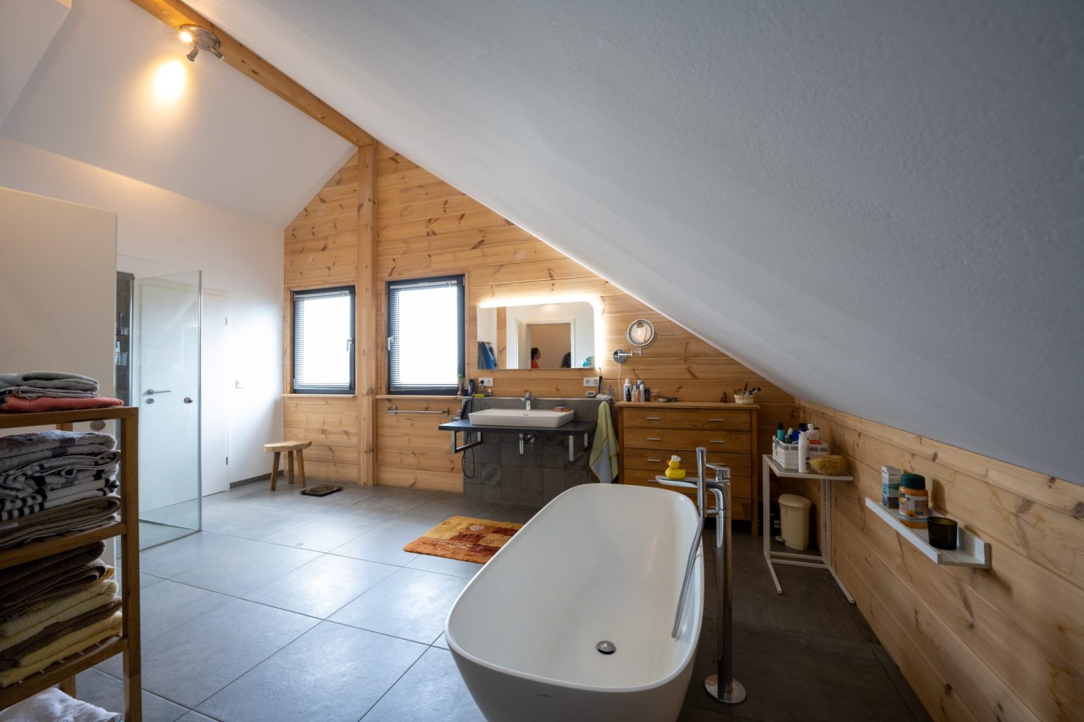 Michael und Pascale Kerner wählten eine Richtmeistermontage. Das Aufstellen des Hauses inklusive Dachstuhl und für den Dachdecker vorbereitetes Dach dauerte eine Woche, danach war der externe Dachdecker mit seiner Arbeit innerhalb von zwei Tagen fertig. „Wir haben beim Hausaufbau geholfen, wo wir konnten. Das meiste hat aber der Richtmeister und sein Team gemacht. Den Innenausbau haben wir dann an örtliche Fachhandwerksfirmen übergeben, nur die Malerarbeiten, Fußleisten und teilweise auch die Elektrik hat mein Mann allein gemacht., „erzählt Pascale Kerner. Im Erdgeschoss besitzt Holzhaus „am Deister“ offene Sichtbalkendecken und auch die Firstpfette ist im Dachgeschoss zu sehen, aber einen offenen Sichtdachstuhl wollte das Ehepaar nicht haben. Im ganzen Haus befinden sich pflegeleichte Fliesen, unten in sehr heller Sandfarbe, oben in anthrazit – lediglich der Gymnastikraum wurde mit fußwarmen Eichendielen ausgestattet, um Bodenübungen behaglicher zu machen. Beheizt und gekühlt wird das Holzhaus via Fußbodenheizung mit einer Luft/Wasser-Wärmepumpe und die Gartenbewässerung wird von einer Regenwasserzisterne unterstützt. „Es ist sehr angenehm, dass die Fußbodenheizung nicht nur heizt, sondern bei großer Hitze auch kühlen kann. Das können wir sehr empfehlen!“, meint der Hausherr. Freilich dämmen die einschaligen Blockwände von Fullwood per se hervorragend und auch die Dachdämmung sowie die Wärmeschutzfenster leisten ihren Beitrag zur Wohlfühl-Raumtemperatur bei jeder Außentemperatur.