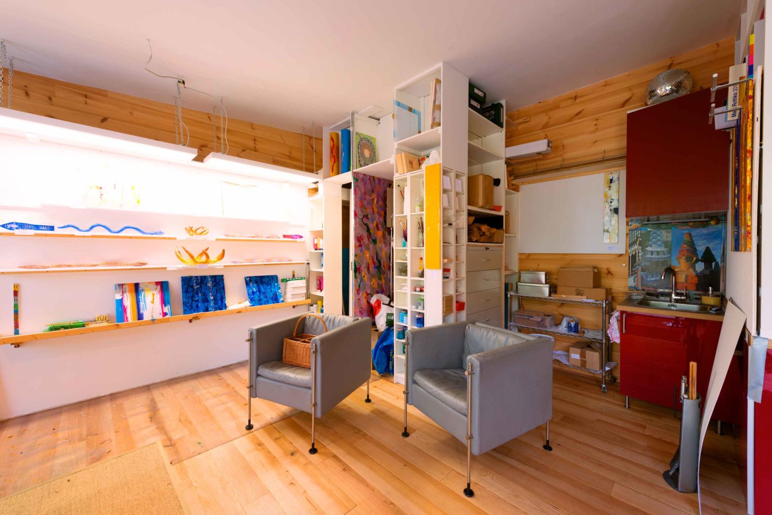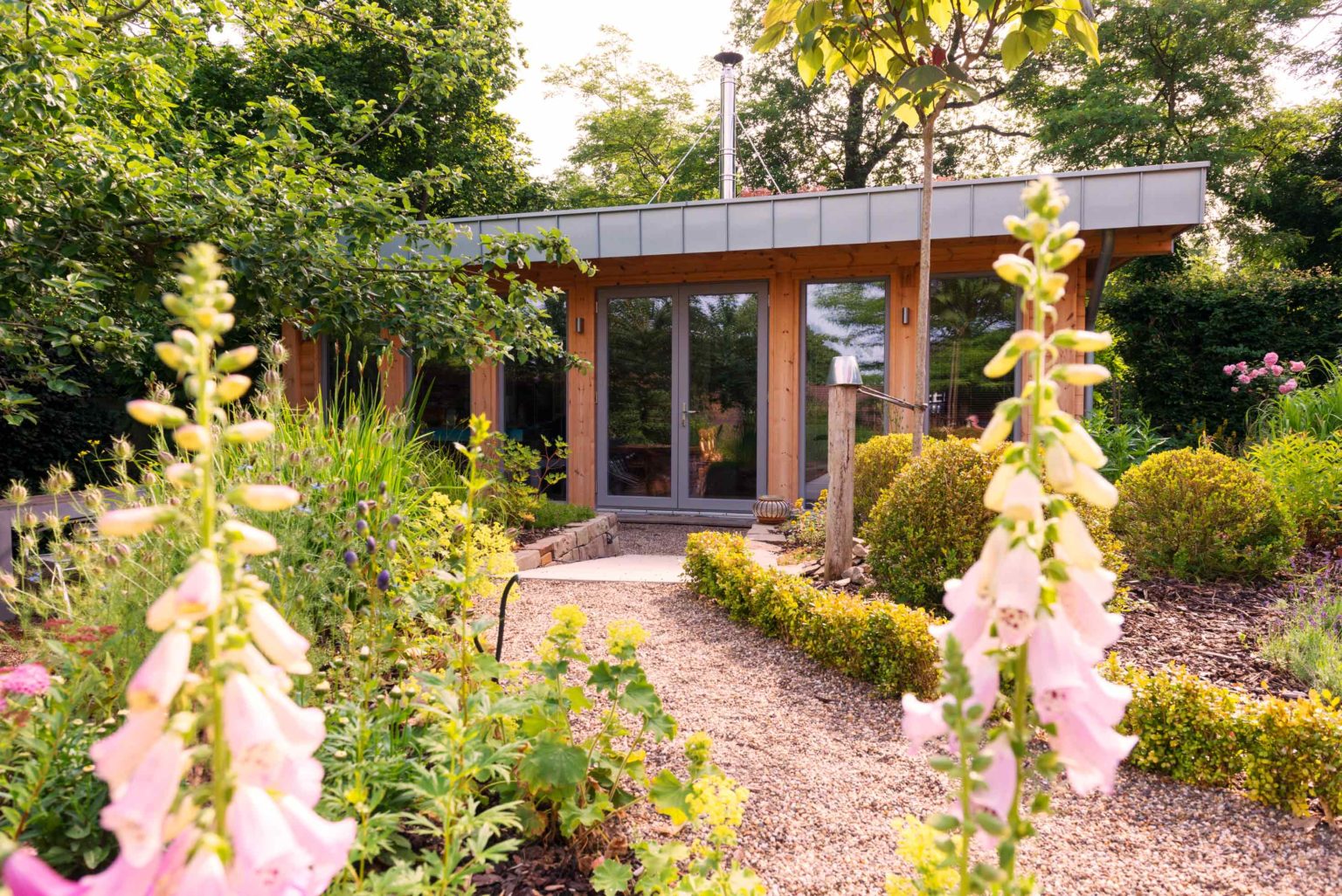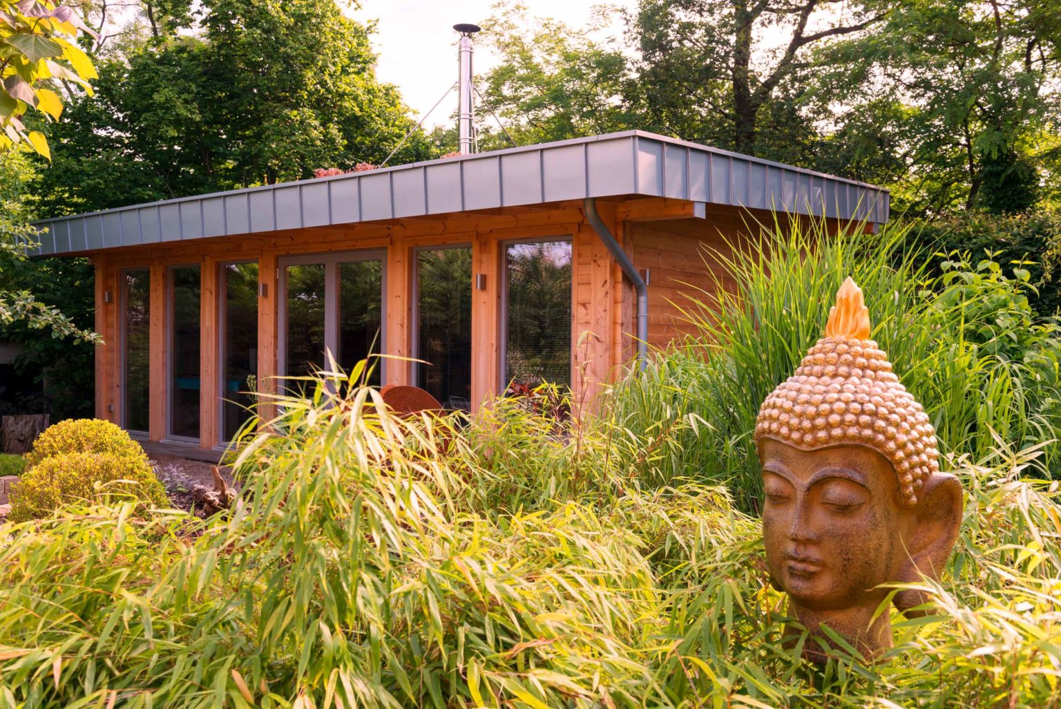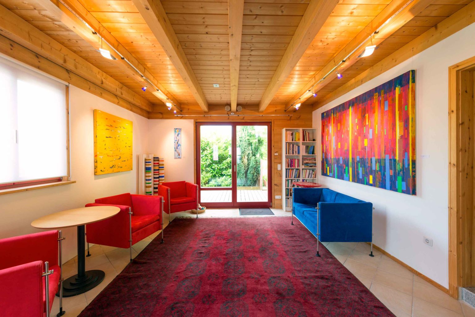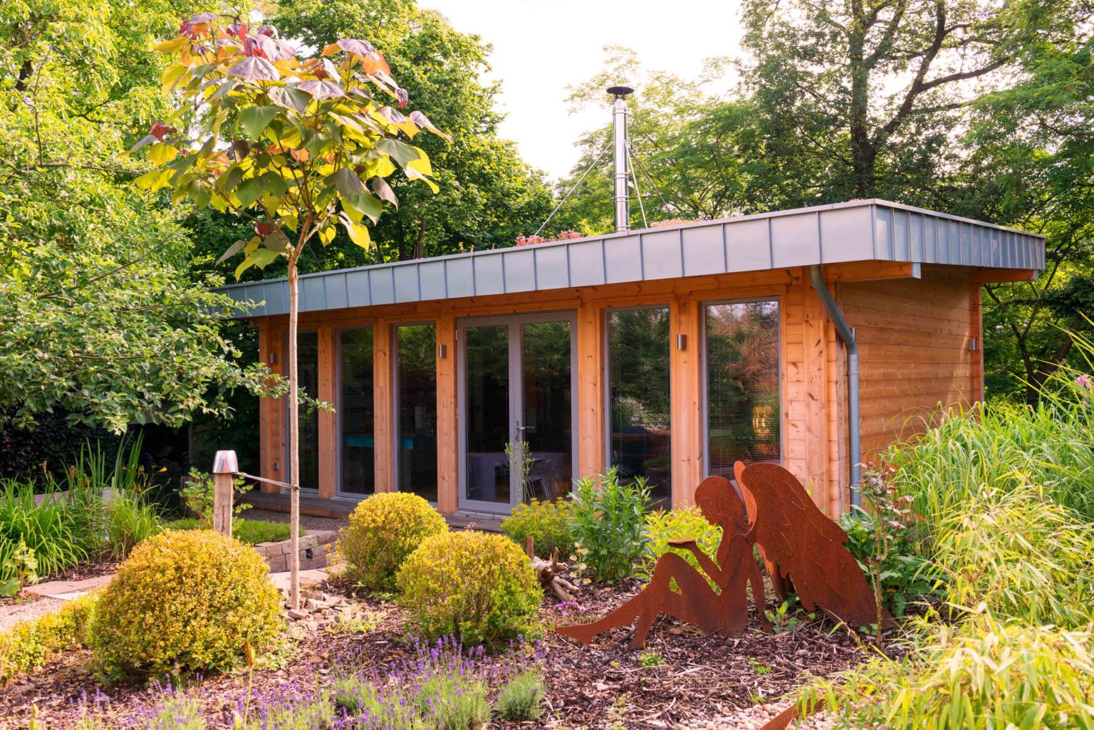 Das gut eingespielte Ehe-Team kaufte einen fast fertigen Holzhaus Rohbau – den es ursprünglich anmieten wollte – baute diesen nach den eigenen Wünschen um und zu Ende aus, errichtete ein kleines Atelier-Holzhaus mit demselben Holzhaus Hersteller, der auch das Haupthaus herstellte, und gestaltete eine paradiesische Gartenoase um das Ganze. „Gärten entwerfen und anlegen ist seit jeher Frauensache in meiner Familie.“, erzählt Hausherrin Kirsten Siefer, die neben Zier- auch viele Heilpflanzen, Kräuter und Salat in „ihrem“ Gartenreich integriert hat. Nachdem wir den Park eingehend bewundert und genossen haben, führt uns Hausherr Thomas Siefer in sein kreatives Zentrum, das Atelierhaus. „Genau wie im Wohnhaus habe ich mich für 20cm dicke Blockbohlenwände aus Skandinavischer Polarkiefer entschieden. Das Raumklima ist einfach toll, und ich habe einen guten Schallschutz gegen den Geräuschpegel der angrenzenden Bahnlinie.“, sagt der vielseitig begabte Mann. „Da ich viel im Stehen arbeite, habe ich hier einen gelenkschonenden „Schwingboden“ einbauen lassen und darauf Eschendielen verlegt, die perfekt zu den hellen Kiefernwänden passen.“, fährt er fort. Ganz modern wirkt das schnörkellose Gebäude mit seinem hellgrauen, leicht geneigten Pultdach, den hellgrauen Fensterrahmen und den bodentiefen Fensterflächen, welche den Großteil der massiven, naturhellen Holzfassade einnehmen. „Dank der großen Glasfront, die sich über die gesamte Breite zieht, habe ich hier viel natürliches Licht und einen inspirierenden Blick in den Garten. Um das Atelier weiter aufzuhellen, habe ich die Zimmerdecke mit Naturgipsfaserplatten verkleidet und weiß gestrichen“, erklärt Thomas Siefer. Beheizt wird das Atelier mit einem drehbaren Kaminofen, der schnelle Wärme bringt, aus jeder Position einen Blick in die Flammen erlaubt und mit seinen klaren Linien perfekt zum modernen Inventar des Großraumes passt.