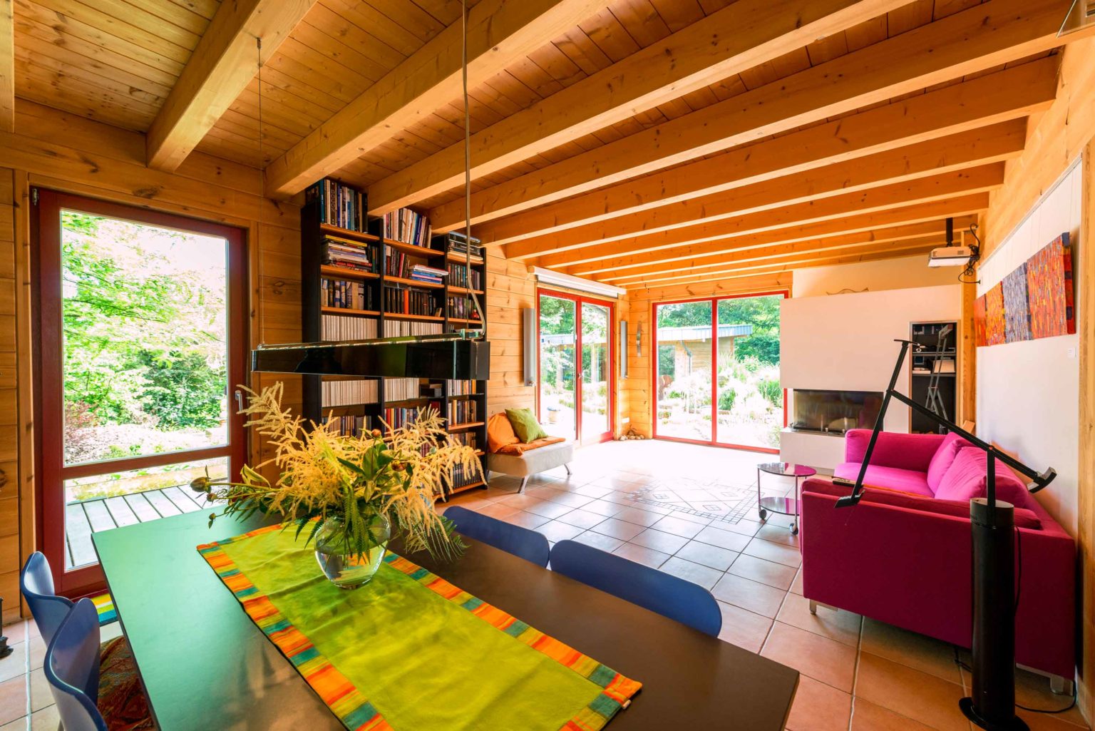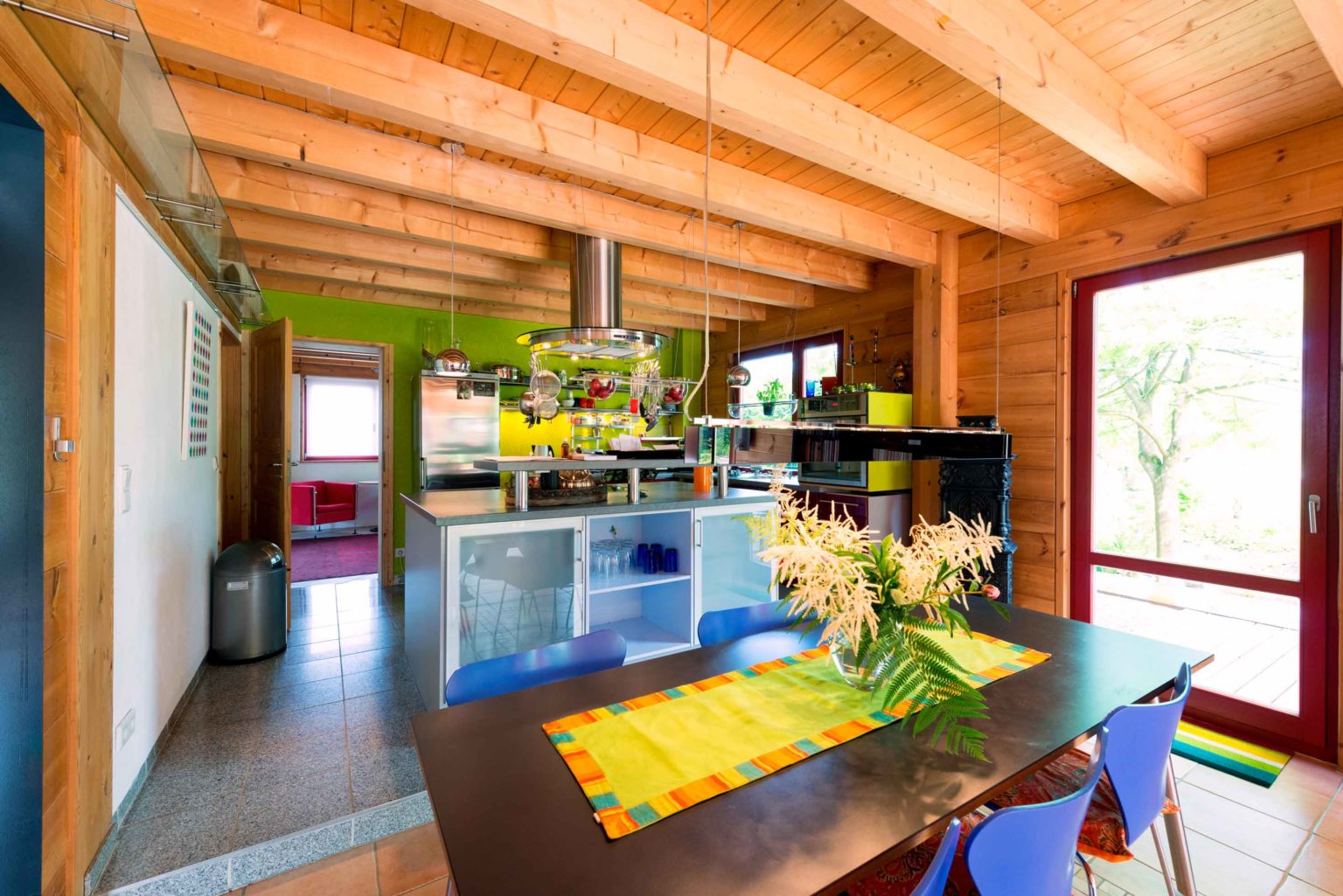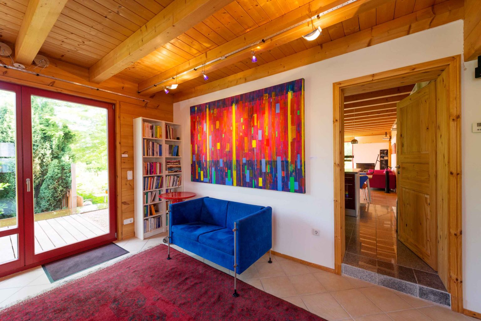 Warmes Holzhaus Ambiente mit expressiven Farben