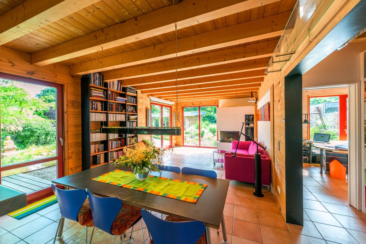 Auf geschwungenen Pfaden gelangen wir zurück zum Wohnhaus, welches zur Gartenseite (Nord/Ost) in einer hellen, warmen Holzfarbe gestrichen ist (die auch vor Vergrauung schützt) und mit roten Fensterrahmen und rot gedecktem Dach sehr freundlich und einladend wirkt. Parallel zur Nordseite, steht in der Länge des Holzhauses zwischen Terrasse und Garten ein schmales Wasserbassin, das Dank Pflanzen und Steinen („biologische Klärung“) ohne Umwälzanlage auskommt – ganz im Sinne der Naturheilverfahren praktizierenden Hausherrin. Unter der Terrasse dient eine Regenwasser-Zisterne der Gartenbewässerung und kann sogar WCs und Waschmaschine mit Wasser versorgen. „Ursprünglich war unser Holzhaus für eine vierköpfige Familie mit Einliegerwohnung für die Oma geplant worden. Dann sollte es wegen finanzieller Engpässe vermietet werden – unser Glück -, und nach 6 Wochen als Mieter, bot man es uns zum Kauf an.“, berichtet Kirsten Siefer. „Wir haben sehr viel verändert: Die Geschosstreppe in der kleineren Wohneinheit wurde herausgerissen und das Treppenloch geschlossen, die Geschossdecken wurden schallisoliert, eine neue Treppe nach unserem Geschmack eingebaut und die Galerie im Eingangsbereich erweitert.“, zählt sie auf. Nun umfasst der Wohnteil des Gebäudes einen großflächigen, offenen Wohnbereich, in dem Kochen, Essen und Wohnen ineinander fließen. Von dort ist auch der Übergang auf die Terrasse und in den Garten – also ins Freiluft-Wohnzimmer der Siefers – naheliegend. Zur Küche geht es eine Stufe hinauf; dadurch, und durch zwei verschiedene Bodenbeläge, wird der Wohnbereich optisch gliedert. Von der Küche gelangt man in den Hauswirtschaftsraum und in den beruflich genutzten Hausteil. Die Eingangshalle öffnet sich ohne Türen zum Wohnbereich und liegt auf demselben Niveau. Vertikal erstreckt sich ein hoher Luftraum über ihr bis zum First hinauf. Eine Geschosstreppe aus Stahl mit Holztritten (Kirsche) führt auf die Galerie ins Dachgeschoss. „Die Treppe und die Galerie hängen zwischen Firstpfette und Außenwand.“, erklärt der Hausherr.