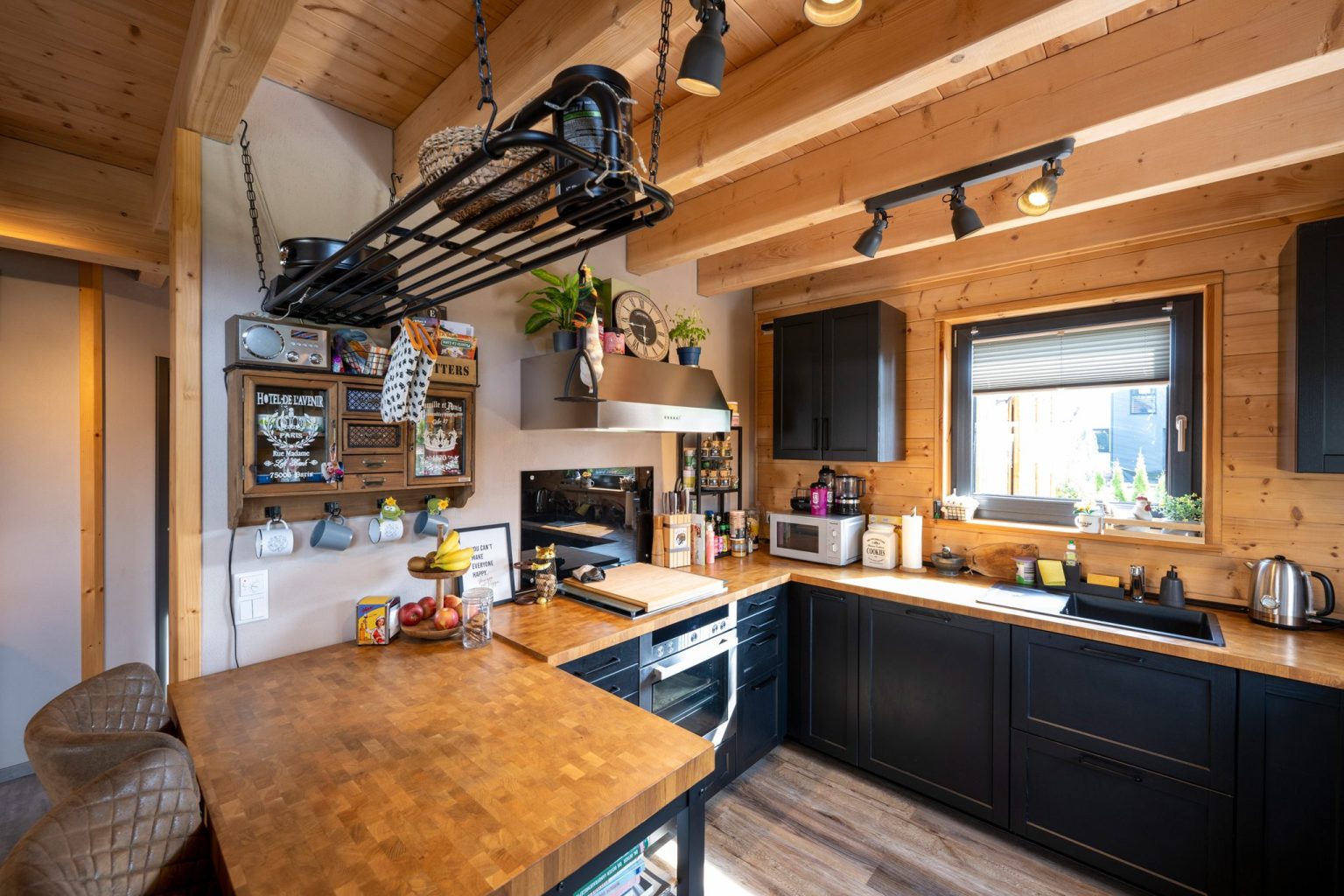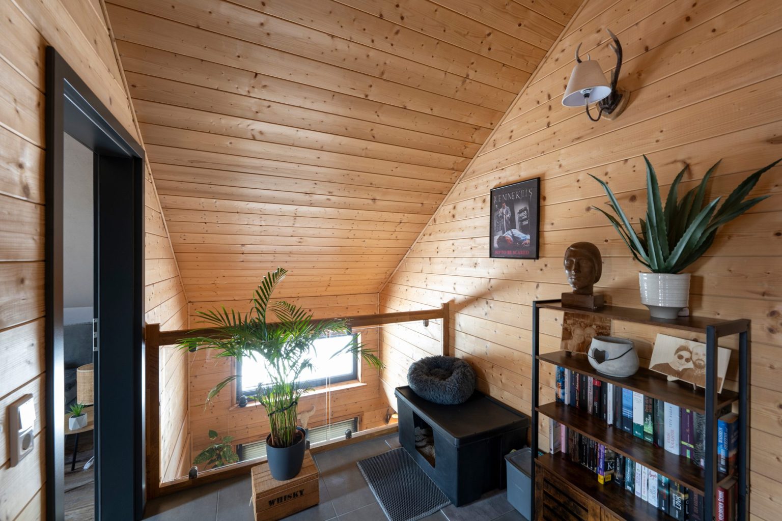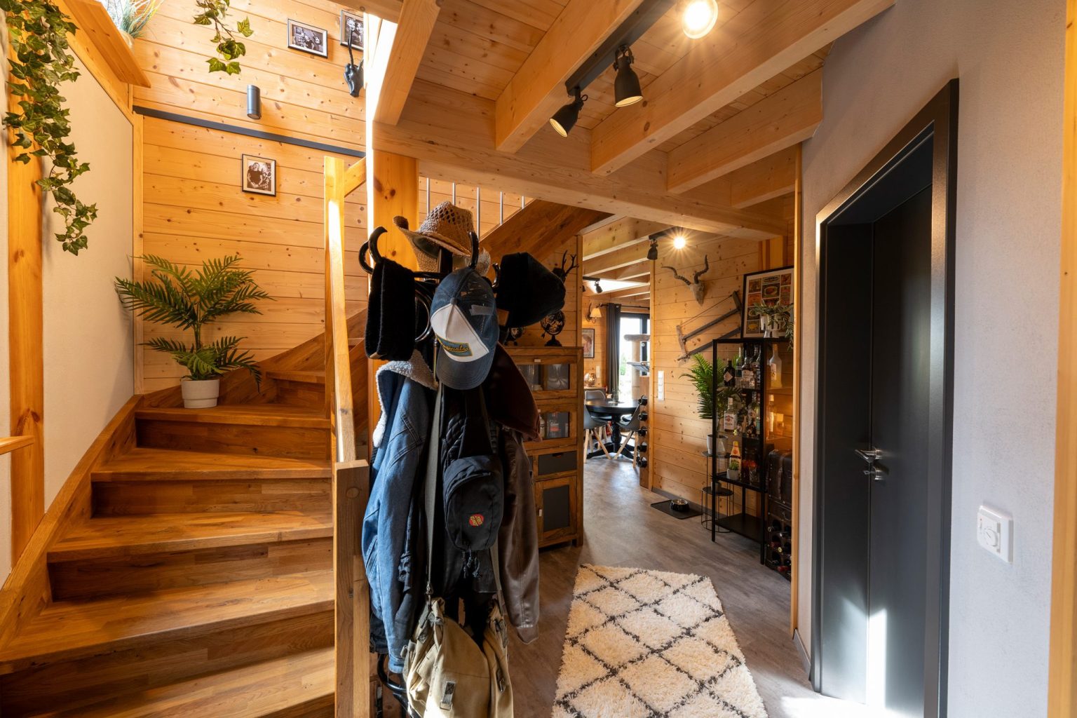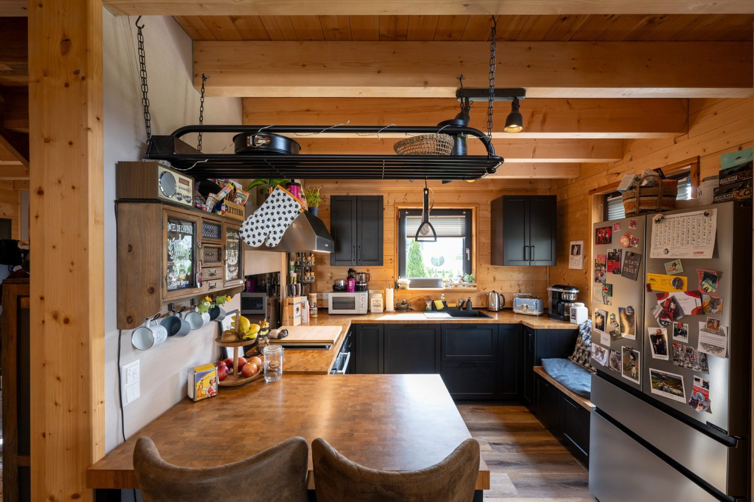 Für ihr Holzhaus „am Hopfengarten“ wählten die Eigentümer die im Kern gedämmte Kombiblockwand, welche Fullwood alternativ zur einschaligen Blockwand anbietet. „Mit dieser Wand sind wir sehr flexibel, nicht nur gestalterisch, sondern auch in Bezug auf die elektrischen Leitungen. Außerdem kostet sie etwas weniger, wenn man die Arbeitszeit fürs Dämmen nicht einrechnet.“, erklärt der Hausherr. Da er und seine Frau Willens und in der Lage waren viel Zeit und Eigenleistung zu investieren, rechnete sich die gewählte Wandvariante für die Bauherrschaft und auch in Punkto Dämmeigenschaft – steht sie der typischen 20er Blockbohlenwand in nichts nach. „Wir haben’s herrlich warm hier im Winter, ohne viel heizen zu müssen.“, schwärmt die Hausherrin. Beim Heizen setzen sie und ihr Mann auf eine moderne Luftwärmepumpe und für die Gemütlichkeit wurde noch ein kleiner aber feiner Holzofen integriert. Um die Stromkosten nicht in die Höhe zu treiben installierten sie noch eine 8,5 KW PV-Anlage auf ihrem Hausdach mit 10 KW Speicher. Dies alles sorgt für sehr niedrige Betriebskosten und ist darüber hinaus ökologisch korrekt und klimafreundlich. „Uns gefällt der Gedanke einen möglichst kleinen ökologischen Fußabdruck zu hinterlassen und wir handeln danach, wo es geht. Erneuerbare Energien nutzen, Ressourcen schonendes Verhalten kultivieren und eine nachhaltige Bauweise unterstützen gibt uns ein gutes Gefühl.“, so Sarah Posch. Dass das angenehme Wohngefühl in ihrem Holzhaus „am Hopfengarten“ in erster Linie von den schadstofffreien Wänden und (Aus)Baumaterialien herrührt und darüber hinaus dem körperlichen und geistigen Wohlbefinden sehr zuträglich ist, ist dem jungen Ehepaar bewusst. „Das Klima in unserem Zuhause tut gut und lädt zum Durchatmen ein.“, so Alex Posch. Den nachweislich entspannenden Effekt einer massiven Holzumgebung ergänzten die Hauseigentümer mit Möbeln und Deko in ruhigen, dunklen Erdtönen von braun über grau und anthrazit bis hin zu schwarz. Dem großen Trend sehr heller und stark lichtdurchfluteter Räume folgten sie somit nicht, wohl aber einem offenen Wohnkonzept von Wohnen, Essen und Kochen sowie einer kleinen, offene Galerie über dem Essbereich, welche dem oberen Stockwerk noch mehr Tageslicht bietet.