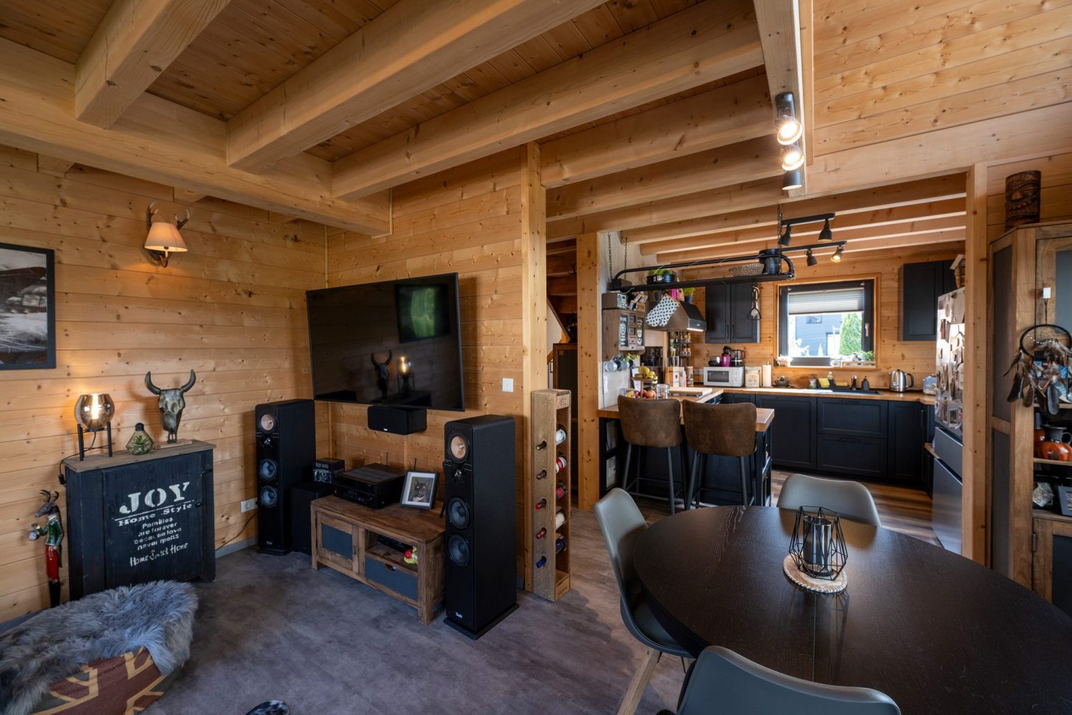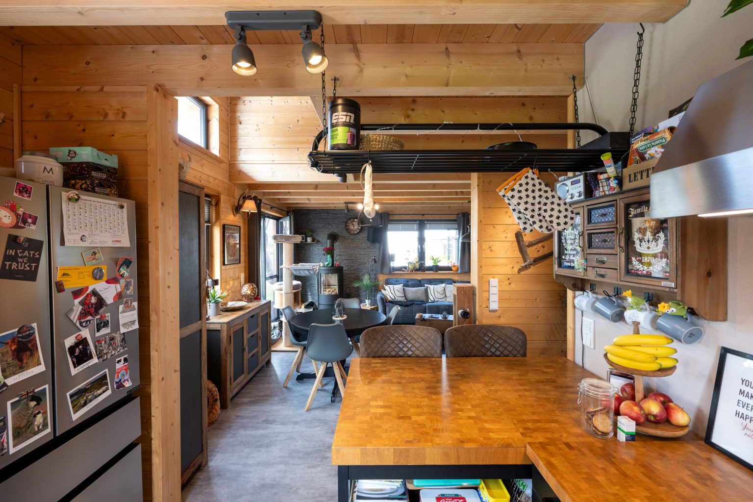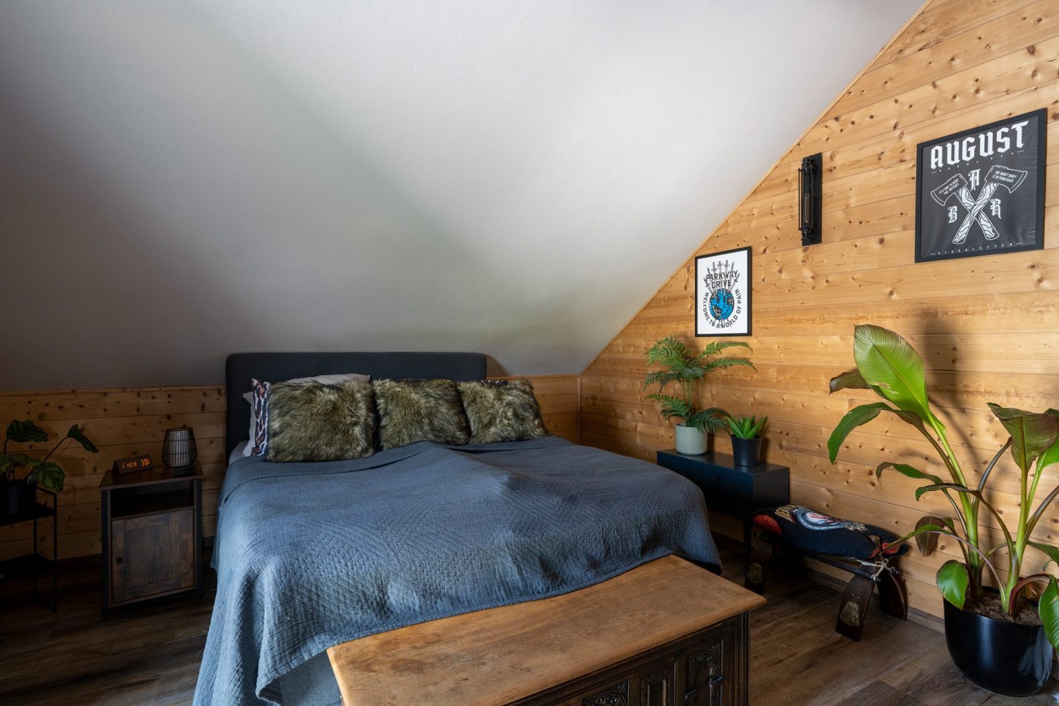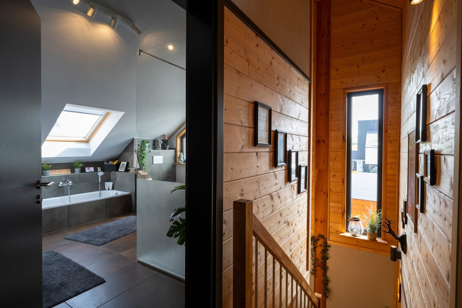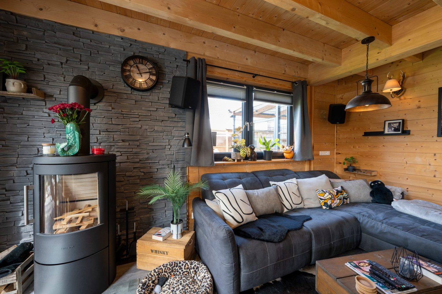 Für ihr Holzhaus „am Hopfengarten“ wählten die Eigentümer die im Kern gedämmte Kombiblockwand, welche Fullwood alternativ zur einschaligen Blockwand anbietet. „Mit dieser Wand sind wir sehr flexibel, nicht nur gestalterisch, sondern auch in Bezug auf die elektrischen Leitungen. Außerdem kostet sie etwas weniger, wenn man die Arbeitszeit fürs Dämmen nicht einrechnet.“, erklärt der Hausherr. Da er und seine Frau Willens und in der Lage waren viel Zeit und Eigenleistung zu investieren, rechnete sich die gewählte Wandvariante für die Bauherrschaft und auch in Punkto Dämmeigenschaft – steht sie der typischen 20er Blockbohlenwand in nichts nach. „Wir haben’s herrlich warm hier im Winter, ohne viel heizen zu müssen.“, schwärmt die Hausherrin. Beim Heizen setzen sie und ihr Mann auf eine moderne Luftwärmepumpe und für die Gemütlichkeit wurde noch ein kleiner aber feiner Holzofen integriert. Um die Stromkosten nicht in die Höhe zu treiben installierten sie noch eine 8,5 KW PV-Anlage auf ihrem Hausdach mit 10 KW Speicher. Dies alles sorgt für sehr niedrige Betriebskosten und ist darüber hinaus ökologisch korrekt und klimafreundlich. „Uns gefällt der Gedanke einen möglichst kleinen ökologischen Fußabdruck zu hinterlassen und wir handeln danach, wo es geht. Erneuerbare Energien nutzen, Ressourcen schonendes Verhalten kultivieren und eine nachhaltige Bauweise unterstützen gibt uns ein gutes Gefühl.“, so Sarah Posch. Dass das angenehme Wohngefühl in ihrem Holzhaus „am Hopfengarten“ in erster Linie von den schadstofffreien Wänden und (Aus)Baumaterialien herrührt und darüber hinaus dem körperlichen und geistigen Wohlbefinden sehr zuträglich ist, ist dem jungen Ehepaar bewusst. „Das Klima in unserem Zuhause tut gut und lädt zum Durchatmen ein.“, so Alex Posch. Den nachweislich entspannenden Effekt einer massiven Holzumgebung ergänzten die Hauseigentümer mit Möbeln und Deko in ruhigen, dunklen Erdtönen von braun über grau und anthrazit bis hin zu schwarz. Dem großen Trend sehr heller und stark lichtdurchfluteter Räume folgten sie somit nicht, wohl aber einem offenen Wohnkonzept von Wohnen, Essen und Kochen sowie einer kleinen, offene Galerie über dem Essbereich, welche dem oberen Stockwerk noch mehr Tageslicht bietet.