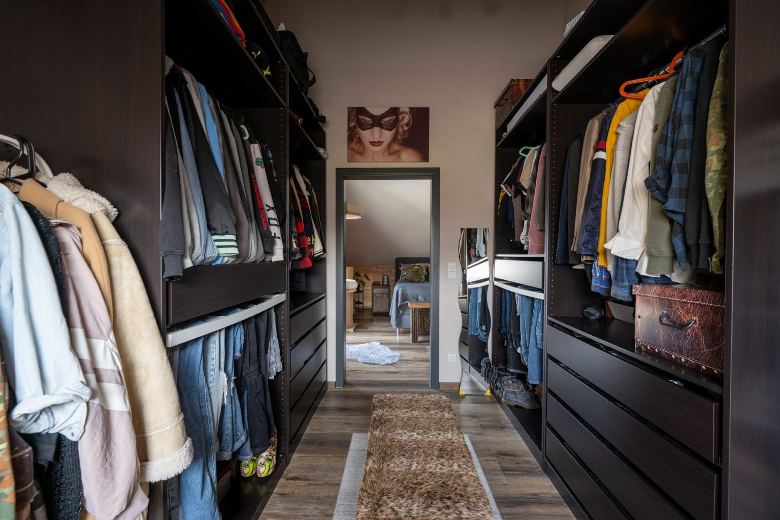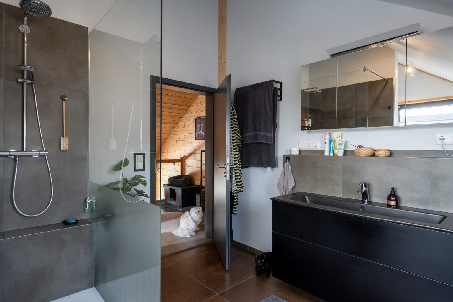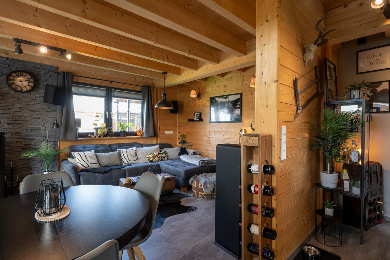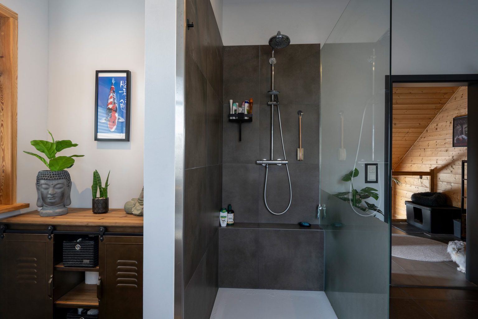 Für ihr Holzhaus „am Hopfengarten“ wählten die Eigentümer die im Kern gedämmte Kombiblockwand, welche Fullwood alternativ zur einschaligen Blockwand anbietet. „Mit dieser Wand sind wir sehr flexibel, nicht nur gestalterisch, sondern auch in Bezug auf die elektrischen Leitungen. Außerdem kostet sie etwas weniger, wenn man die Arbeitszeit fürs Dämmen nicht einrechnet.“, erklärt der Hausherr. Da er und seine Frau Willens und in der Lage waren viel Zeit und Eigenleistung zu investieren, rechnete sich die gewählte Wandvariante für die Bauherrschaft und auch in Punkto Dämmeigenschaft – steht sie der typischen 20er Blockbohlenwand in nichts nach. „Wir haben’s herrlich warm hier im Winter, ohne viel heizen zu müssen.“, schwärmt die Hausherrin. Beim Heizen setzen sie und ihr Mann auf eine moderne Luftwärmepumpe und für die Gemütlichkeit wurde noch ein kleiner aber feiner Holzofen integriert. Um die Stromkosten nicht in die Höhe zu treiben installierten sie noch eine 8,5 KW PV-Anlage auf ihrem Hausdach mit 10 KW Speicher. Dies alles sorgt für sehr niedrige Betriebskosten und ist darüber hinaus ökologisch korrekt und klimafreundlich. „Uns gefällt der Gedanke einen möglichst kleinen ökologischen Fußabdruck zu hinterlassen und wir handeln danach, wo es geht. Erneuerbare Energien nutzen, Ressourcen schonendes Verhalten kultivieren und eine nachhaltige Bauweise unterstützen gibt uns ein gutes Gefühl.“, so Sarah Posch. Dass das angenehme Wohngefühl in ihrem Holzhaus „am Hopfengarten“ in erster Linie von den schadstofffreien Wänden und (Aus)Baumaterialien herrührt und darüber hinaus dem körperlichen und geistigen Wohlbefinden sehr zuträglich ist, ist dem jungen Ehepaar bewusst. „Das Klima in unserem Zuhause tut gut und lädt zum Durchatmen ein.“, so Alex Posch. Den nachweislich entspannenden Effekt einer massiven Holzumgebung ergänzten die Hauseigentümer mit Möbeln und Deko in ruhigen, dunklen Erdtönen von braun über grau und anthrazit bis hin zu schwarz. Dem großen Trend sehr heller und stark lichtdurchfluteter Räume folgten sie somit nicht, wohl aber einem offenen Wohnkonzept von Wohnen, Essen und Kochen sowie einer kleinen, offene Galerie über dem Essbereich, welche dem oberen Stockwerk noch mehr Tageslicht bietet.