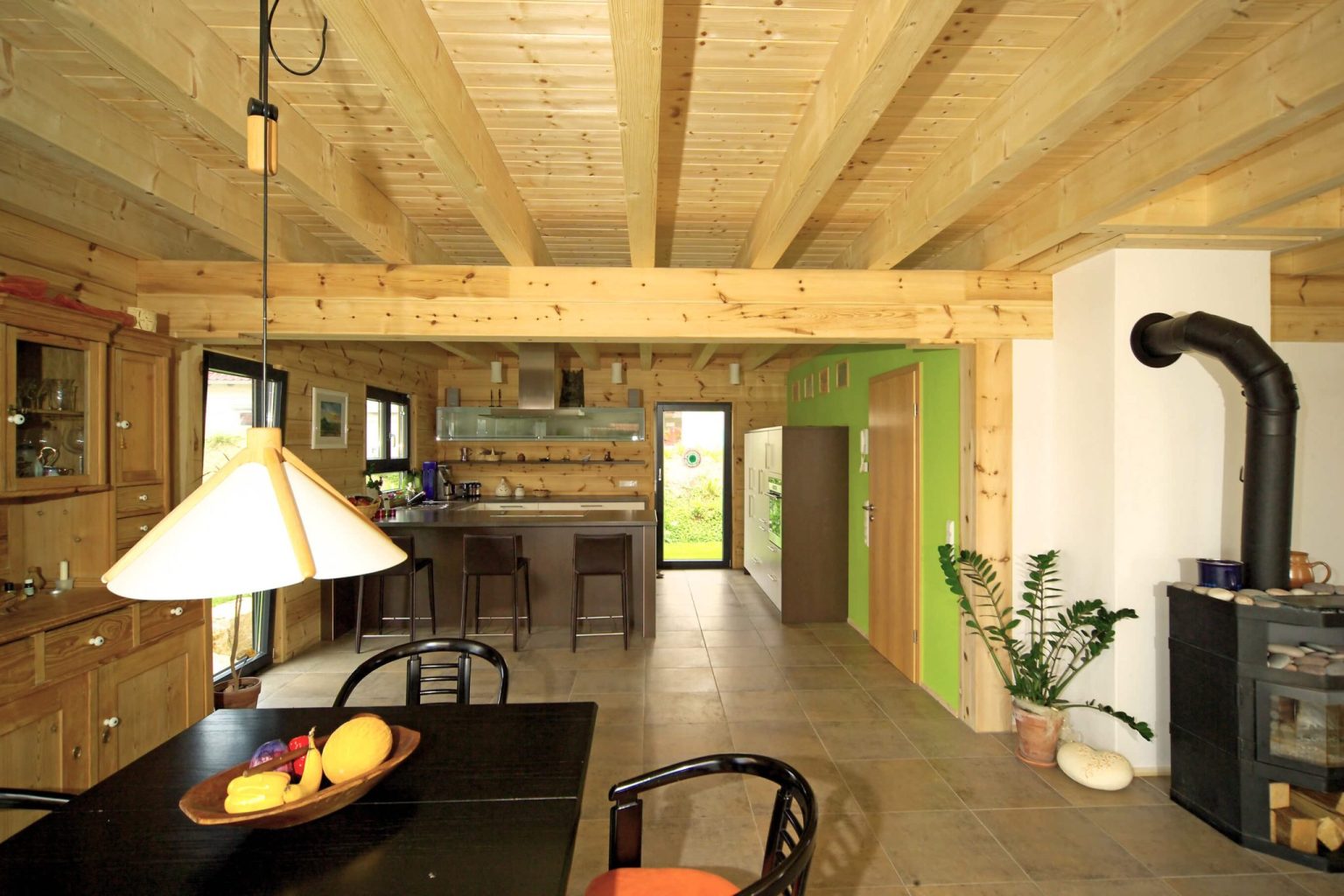 Fenstertüren führen von zwei Dachgeschossräumen auf den Balkon vor der Gaube – eine Metallkonstruktion mit weit vorgezogenen, aufgeständerten Trägern, die zusammen mit den Fensterrahmen und Rollladenkästen in Anthrazit einen modernen Akzent setzt. Auch der Sichtschutz im filigranen Balkongeländer ist anthrazit, ebenso das Sonnensegel, das zwischen die Tragkonstruktion des Balkons gespannt wurde. Darunter steht den Bewohnern des Holzhauses ein komfortabler Freisitz zur Verfügung – ideal, um an heißen Tagen in angenehmem Schatten den Aufenthalt im Garten zu genießen. Große Glasflächen rund ums massive Holzhaus machen die Natur auch in der kalten Jahreszeit zum Teil des Wohngeschehens. Dies vor allem in den offenen Wohnräumen. Hier bieten sich den Bewohnern gleich auf drei Seiten Ausblicke und Ausgänge in den Garten – vor allem vom Essplatz aus, der das Zentrum dieses Raumensembles bildet. Über Eck gegliedert, verbindet es Weite mit Geborgenheit, bietet seinen Bewohnern einerseits einen Essplatz mit freiem Blick in alle Richtungen, andererseits einen Wohnbereich in einer gemütlichen, vor Einblicken weitgehend geschützten Nische. Selbst die Küche ist vom Sofa aus praktisch nicht zu sehen. Wenn der Kaminofen den Raum in angenehmen Feuerschein taucht, ist er der ideale Rahmen für gemütliche Winterabende, die durch die warmen Farbtöne der Holzwände und die Holzbalkendecke noch stimmungsvoller werden. Als zusätzliches Gestaltungselement setzen kräftige Farben auch im Hausinneren moderne Akzente. Das gilt vor allem für die in hellem Grün gehaltene Wand seitlich der Küche, aber auch für die Fensterrahmen, die innen in leuchtendem Blau getönt sind. Höhepunkt dieser Gestaltungslinie ist eine topmoderne Küche in dunklem Braun, die sich bruchlos ins Holzblock-Ambiente einfügt – ein überzeugendes Beispiel dafür, wie eine gelungene Synthese zwischen modernem Lebensgefühl und traditioneller, hochwertiger Bauweise aussehen kann. Das offene Ensemble aus Küche, Essplatz und Wohnbereich nimmt fast die gesamte Erdgeschossfläche von Holzhaus „am Kaiserberg“ ein. Der Eingangsbereich mit Flur und das Gäste-WC vervollständigen das Raumangebot auf dieser Ebene.