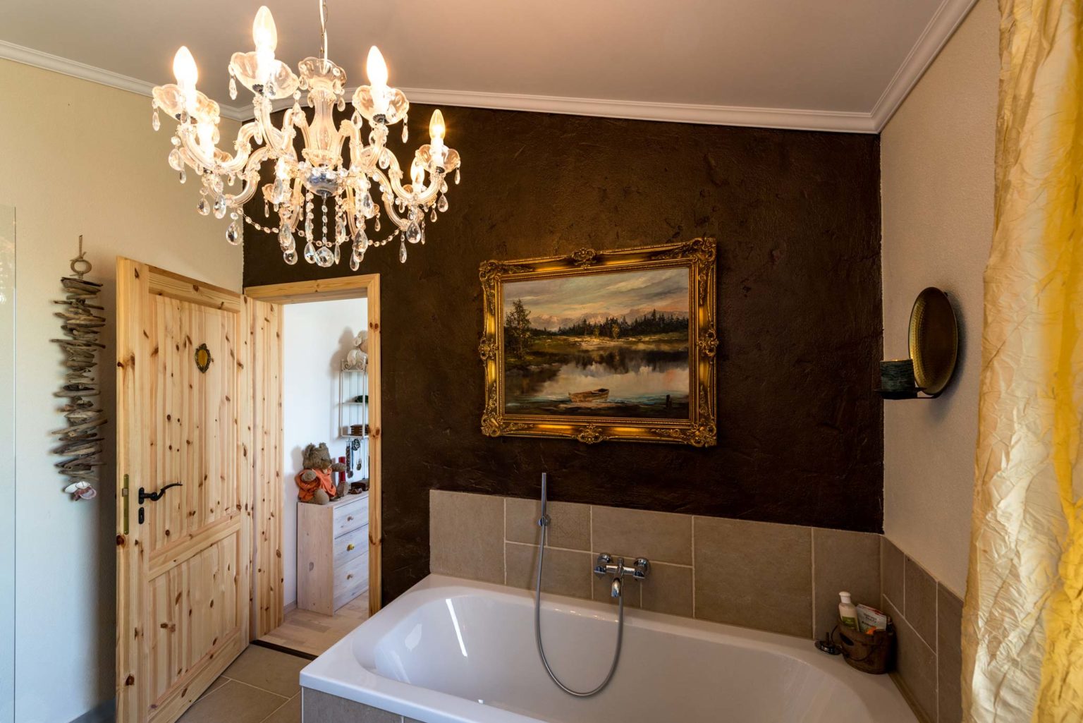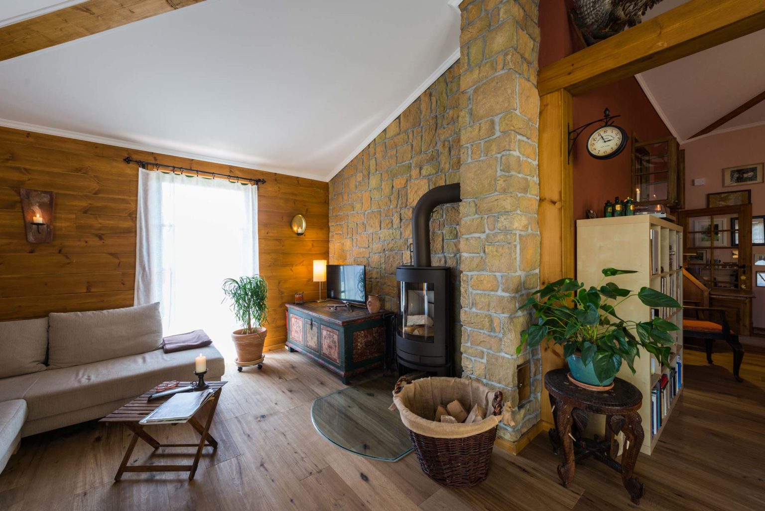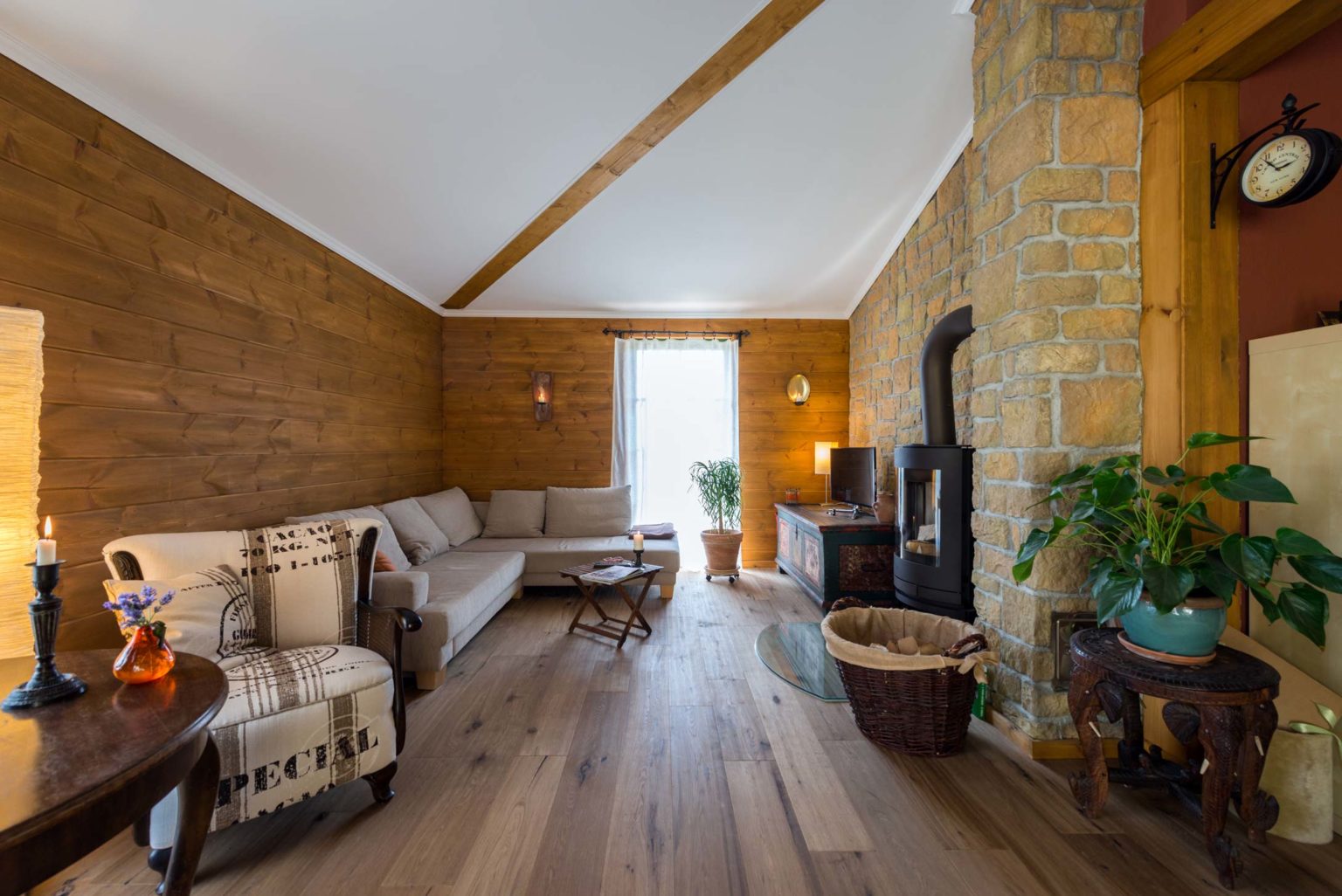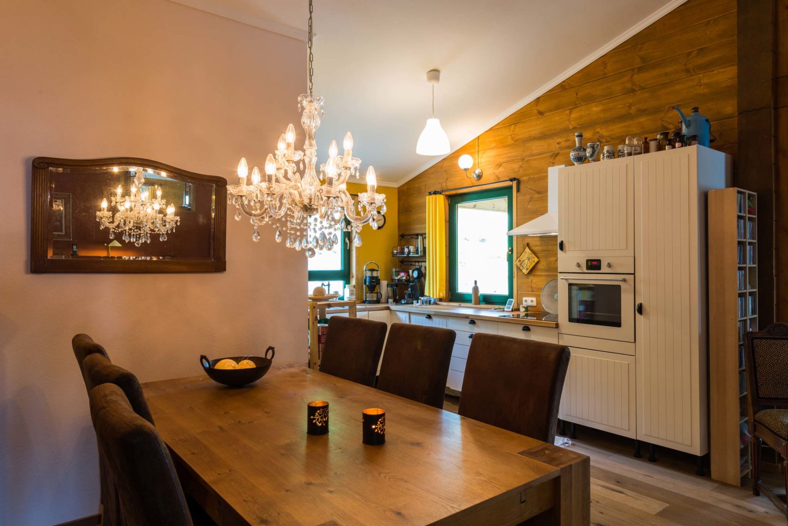 Beate Schweikert vereinbarte mit ihrem Haushersteller eine „Vollmontage“, bei der Fullwood die im Werk gefertigten Wandelemente zum Bauplatz transportiert und dort komplett montiert, inklusive Dachstuhl und Dachaufbau. Auch die Trennwände stellten die Profis auf und bauten Fenster und Türen ein. Das Dach ließ sie vom örtlichen Dachdeckerbetrieb decken und engagierte kleine, ortsansässige Sanitär-, Heizungs-, Elektro- und Fliesenlegerfirmen für den Innenausbau. „Ich war mit allen Handwerkern extrem zufrieden und hatte offenbar großes Glück während der gesamten Bauphase. Es gab keinerlei Verzögerungen oder Reklamationen, vor denen man so oft gewarnt wird als Bauherr.“, betont die voll berufstätige PTA. Beheizt wird ihr Bungalow mit Hilfe eines klassischen Kaminofens im Wohnzimmer und einer modernen Luftwärmepumpe (Fußbodenheizung). „Besonders liebe ich das angenehme Klima in meinem Holzhaus, und meinen Besuchern fällt immer sofort der zarte Kiefernduft auf, wenn sie hereinkommen.“, fasst Beate Schweikert zusammen.