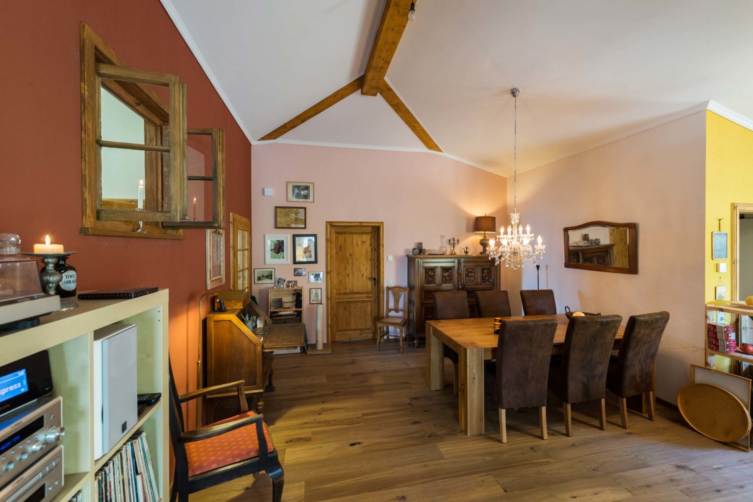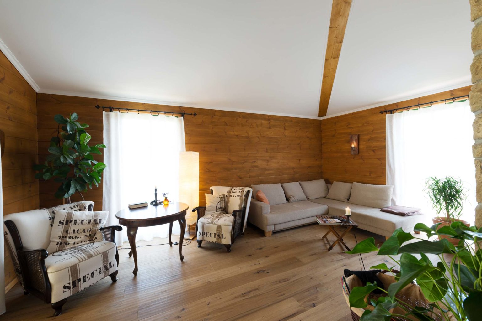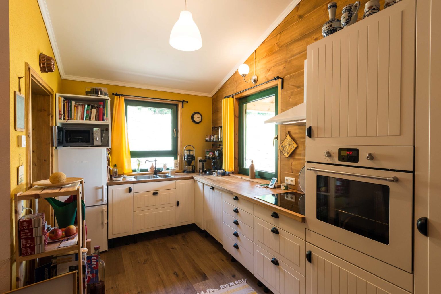Drinnen entschied sie sich für eine Mischung aus farbig gestrichenen Wänden und dunkler getönten Blockwänden. Anstatt der für Fullwood sonst üblichen offenen Holzbalkendecke wählte die Hausherrin weiß gestrichene Deckenverkleidungen und ließ nur wenige Balken sichtbar, unter anderem den imposanten Firstbalken. Dazu kombinierte sie Eichendielen im gesamten Holzhaus (außer in Diele und Bädern). „Fullwood konnte wirklich alles genau so umsetzen, wie ich es wollte. Zuerst prüfte man die Machbarkeit und gab mir hier und da sinnvolle Tipps.“, freut sich die Hauseigentümerin über den angenehmen Planungsablauf, bei dem sie sehr von der jahrzehntelangen Erfahrung des Holzhausspezialisten profitierte. Mut zur Farbe und ein Händchen dafür bewies sie beim Abstimmen der Wandtöne aufeinander – von weiß über vanillegelb, sonnengelb, altrosa und ziegelrot bis hin zu dunkelbraun mit Metalliceffekt (Badezimmer) reicht die Palette. Neben den mittelbraunen Kiefernwänden kam im Wohnzimmer noch eine Wand in gelber Bruchsteinoptik dazu. Summa summarum herrscht ein abwechslungsreiches aber dennoch harmonisches und warmes Ambiente im Holzhaus, in dem sich auch Katze „Naima“ sehr wohlfühlt.