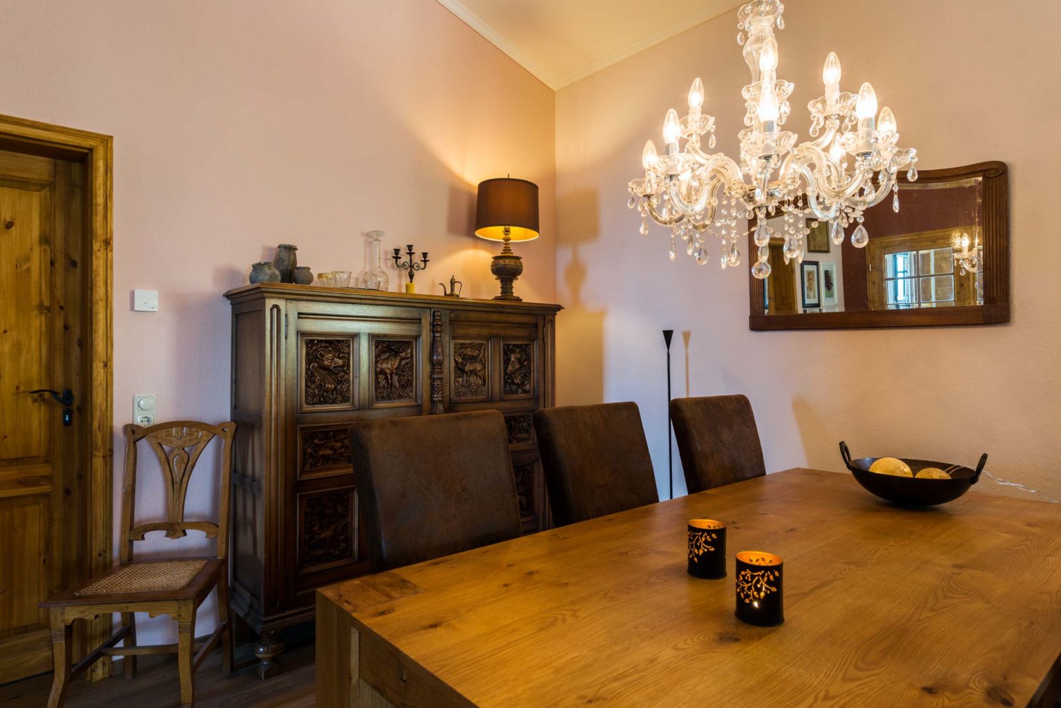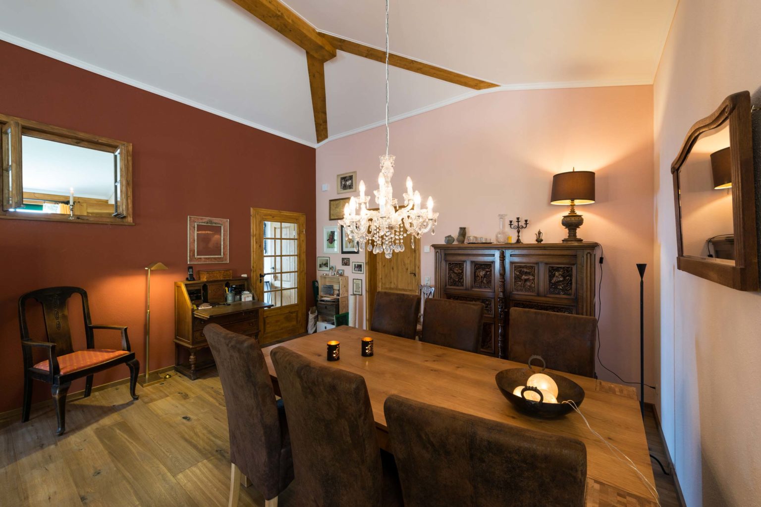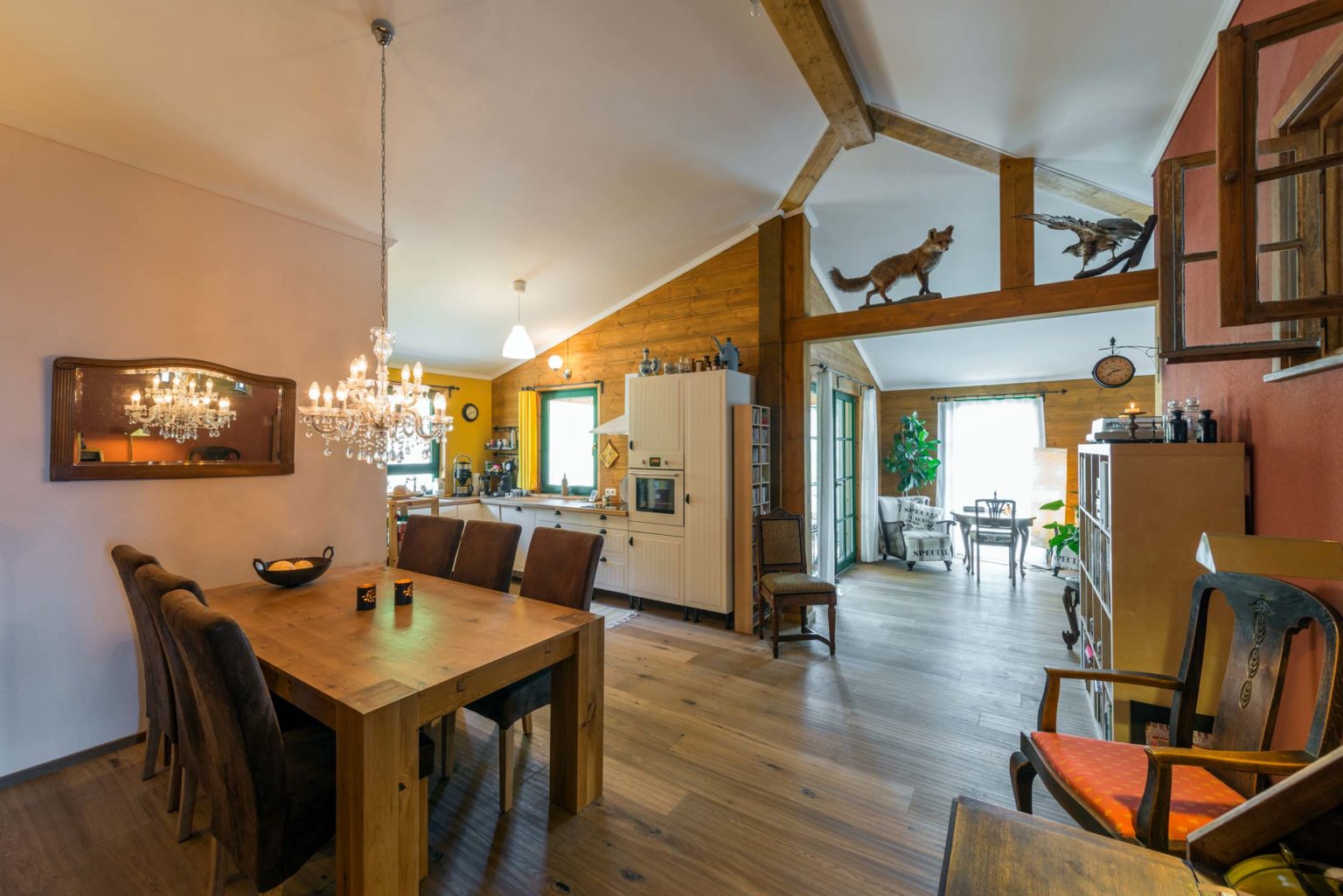 Drinnen entschied sie sich für eine Mischung aus farbig gestrichenen Wänden und dunkler getönten Blockwänden. Anstatt der für Fullwood sonst üblichen offenen Holzbalkendecke wählte die Hausherrin weiß gestrichene Deckenverkleidungen und ließ nur wenige Balken sichtbar, unter anderem den imposanten Firstbalken. Dazu kombinierte sie Eichendielen im gesamten Holzhaus (außer in Diele und Bädern). „Fullwood konnte wirklich alles genau so umsetzen, wie ich es wollte. Zuerst prüfte man die Machbarkeit und gab mir hier und da sinnvolle Tipps.“, freut sich die Hauseigentümerin über den angenehmen Planungsablauf, bei dem sie sehr von der jahrzehntelangen Erfahrung des Holzhausspezialisten profitierte. Mut zur Farbe und ein Händchen dafür bewies sie beim Abstimmen der Wandtöne aufeinander – von weiß über vanillegelb, sonnengelb, altrosa und ziegelrot bis hin zu dunkelbraun mit Metalliceffekt (Badezimmer) reicht die Palette. Neben den mittelbraunen Kiefernwänden kam im Wohnzimmer noch eine Wand in gelber Bruchsteinoptik dazu. Summa summarum herrscht ein abwechslungsreiches aber dennoch harmonisches und warmes Ambiente im Holzhaus, in dem sich auch Katze „Naima“ sehr wohlfühlt.
