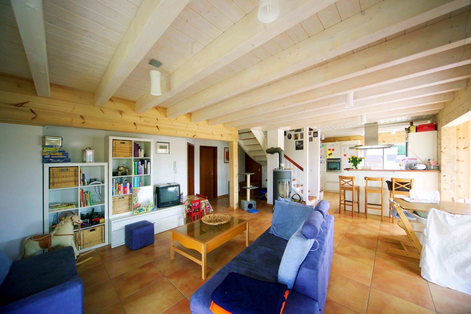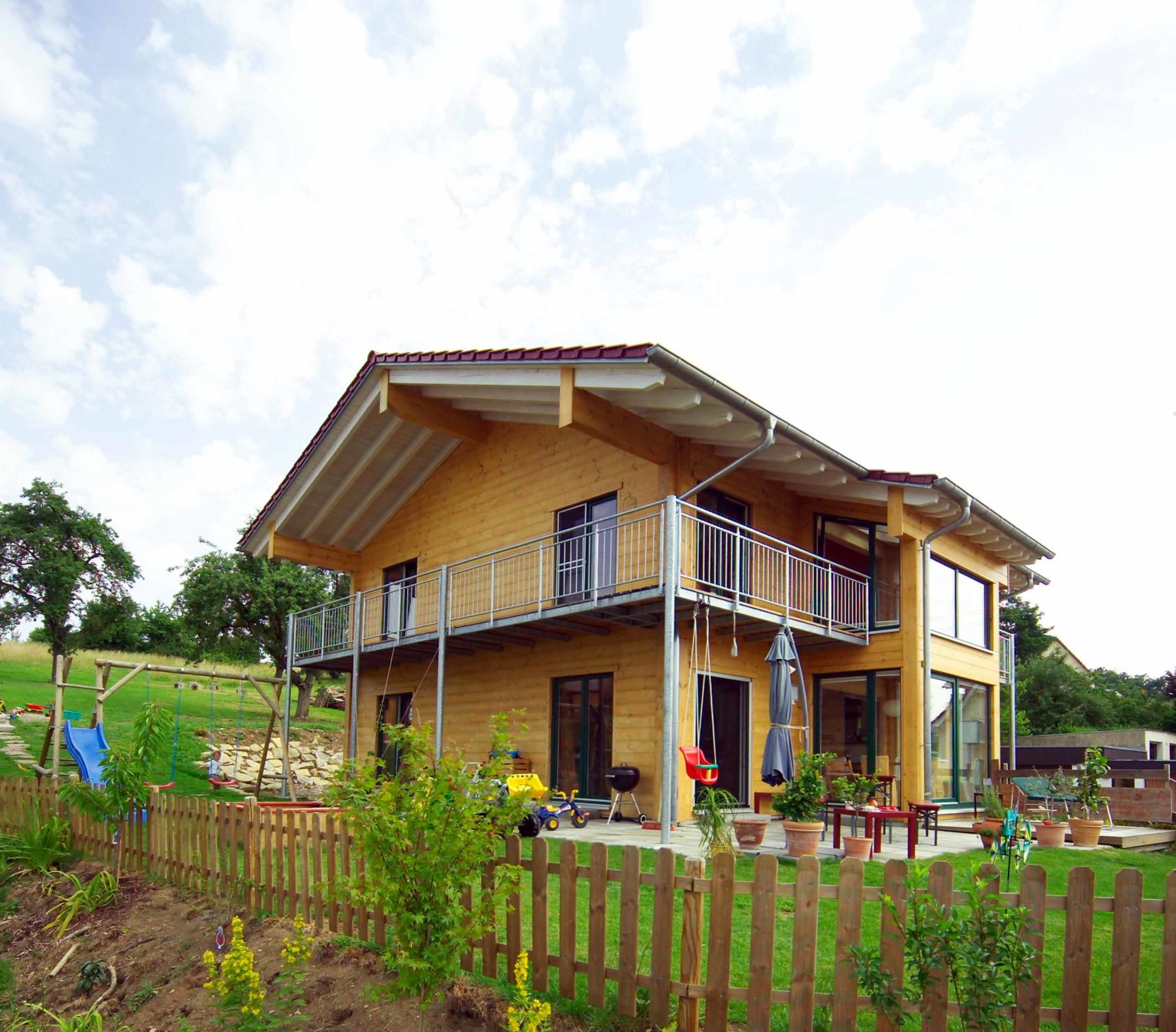 Bis zum ersten Kontakt mit Fullwood wäre eine Holzständerkonstruktion für Klaus May noch eine Alternative gewesen: „Allerdings behagten mir die Folien nicht, weil sie meiner Meinung nach nur in den ersten Jahren richtig funktionieren. Niemand weiß, wie die Wand in 30 Jahren aussieht.“ Ehefrau Eva sieht das ganz ähnlich: „Da wir als Physiotherapeuten schon von Berufs wegen viel über Gesundheitsthemen nachdenken, erschien uns ein massives Holzhaus als natürlichste Alternative.“ Hinzu kam, dass die Baufamilie schon nach dem ersten Firmenbesuch „komplett vom Fullwood-Bausystem überzeugt“ war. Klaus May: „Wie man dort die Schwierigkeiten des Baustoffs löst, hat mir sehr gut gefallen. Ein reines Holzhaus mit seinem hervorragenden Raumklima, außerdem setzungsfrei und dauerhaft luftdicht, konnte uns sonst keiner bieten.“ Das Ehepaar entschied sich für eine Richtmeistermontage mit hohem Eigenleistungsanteil – „eine optimale Bauweise, wenn sich jemand ein bisschen mit Holz auskennt. Zumal die Außenhülle dank der vorgefertigten Wandelemente in wenigen Tagen steht und man den kompletten Ausbau in trockenen, warmen Innenräumen durchführen kann.“ Geplant wurde Holzhaus „am Limes“ individuell. Der erste Plan stammte von Fullwood – „weil wir ganz schnell einen Grundriss zum Einreichen wegen der Eigenheimzulage brauchten“. Danach planten Eva und Klaus May ihr Holzhaus en Detail : das Erdgeschoss offen, mit fließenden Übergängen zwischen Wohnbereich, Essplatz und Küche, mit integrierter Treppe und vielen Zugängen zum Garten. „Wir wollten ein offenes Holzhaus, in dem man zusammen lebt und engen Kontakt zur Natur hat.“ Ein bewusster Kontrapunkt zur balkonlosen Mietwohnung im zweiten Stock, in der man keine Chance hatte, mit den Kindern ins Freie zu kommen. Die Planung erfolgte in mehreren Schritten, immer wieder wurde ein Grundriss gezeichnet, eine Weile liegengelassen, wieder geändert und bei Fullwood eingereicht. Dort prüfte man, ob die Statik stimmte – ein komplizierter Planungsprozess zwar, aber für die Holzhausfirma kein Problem.