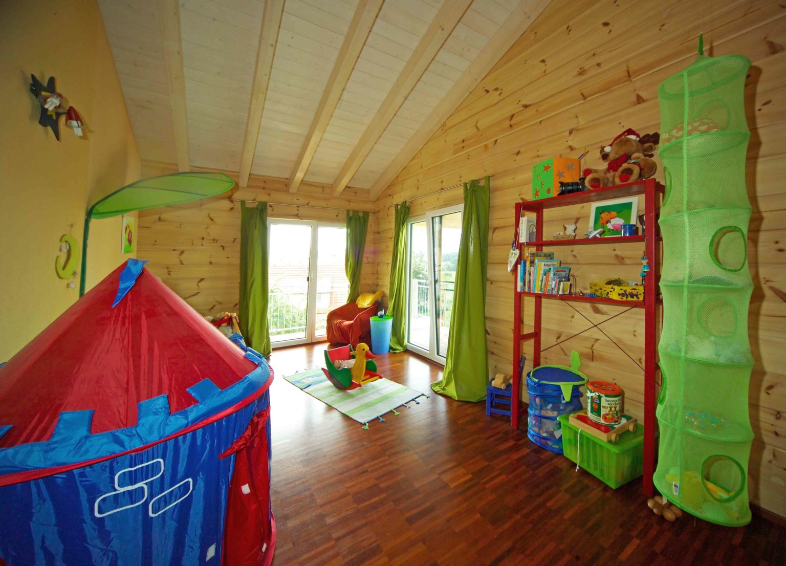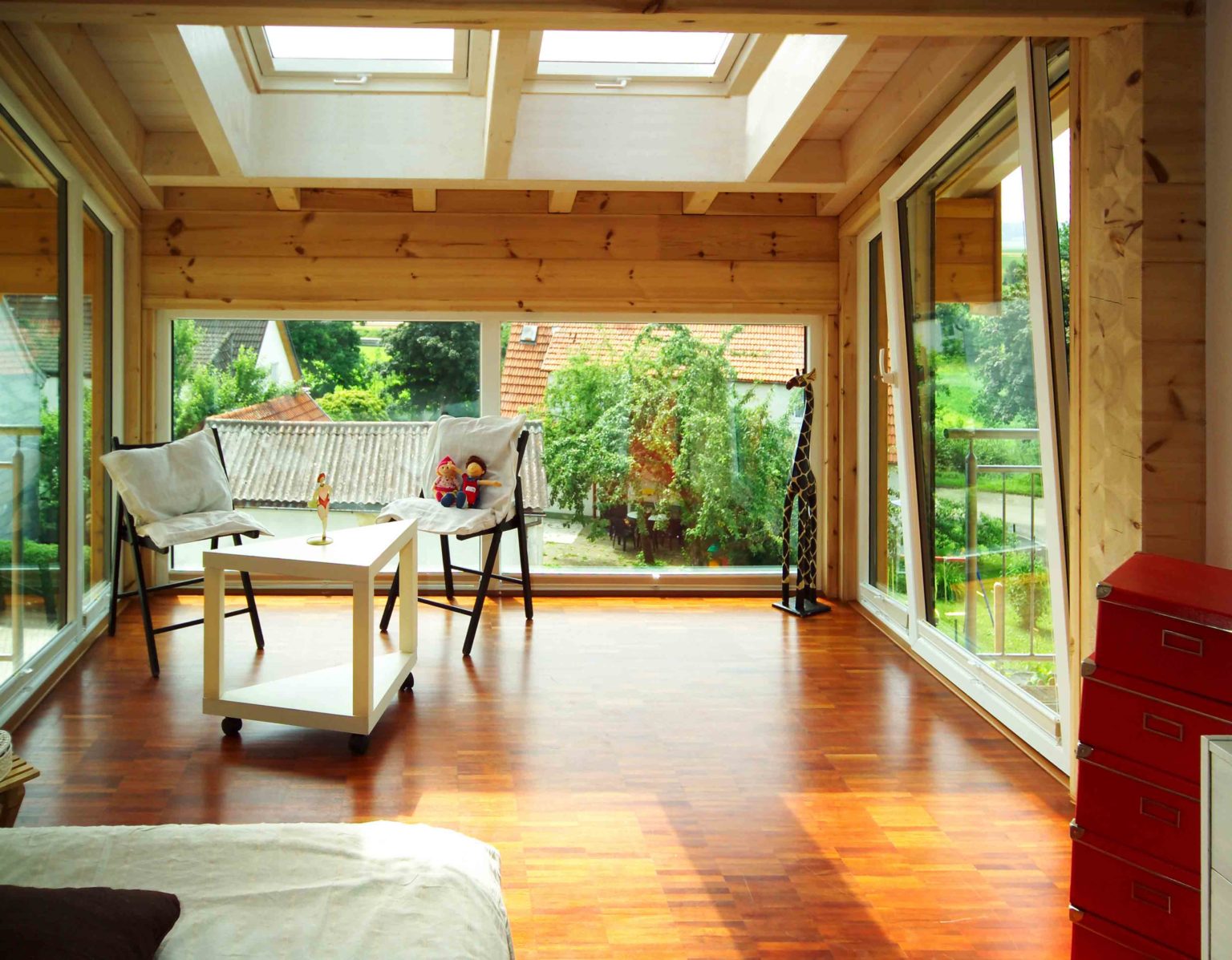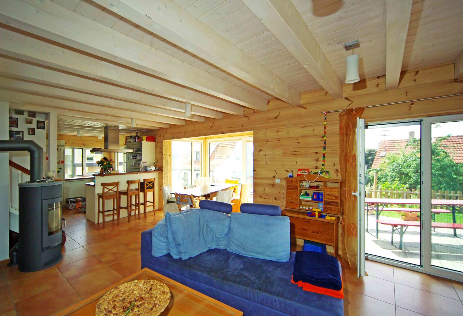 Mit drei Kinderzimmern plus Gästezimmer bietet auch das Dachgeschoss ein komfortables Raumprogramm, zumal die Dachschrägen dank hohem Kniestock kaum zu bemerken sind. Jedes Zimmer hat Zugang zu mindestens einem Balkon. Praktisches Planungsdetail: WC und Bad wurden voneinander getrennt. Dies dürfte die Wartezeiten in der morgendlichen „Rushhour“ deutlich verkürzen. Das Eigenleistungsprogramm der Baufamilie war umfangreich: Den kompletten Ausbau inklusive Dachausbau und Beplankung der Innenwände übernahm sie in Eigenregie, nur den Keller, die Elektroinstallation und den Fußboden vergaben Eva und Klaus May an Fachbetriebe. Trotz dieses hohen Anteils an Muskelhypothek schafften sie den Einzug in nur viereinhalb Monaten – am 28. April 2006 hatte der Hausaufbau begonnen, in der zweiten Septemberwoche wohnte man schon in den eigenen vier Wänden. Klaus May: „Schon der Aufbau selbst war hervorragend gelaufen. Am ersten Abend standen bereits sieben von acht Außenwänden, am Abend des vierten Tages war der Dachstuhl montiert und verschalt. Damit war unser Holzhaus regendicht. Der Innenausbau lief dann so reibungslos, dass wir am Ende weit unter unserem Zeitplan blieben. Alles funktionierte so, wie wir es erhofft hatten.“ Kein Wunder, dass die Familie jederzeit wieder mit Fullwood bauen würde. Auch deshalb, weil sie sich in der Wohnatmosphäre ihres Heimes rundum wohl fühlt. Und weil ihr Holzhaus so warm ist, dass man die Heizung an Ostern aus- und erst an Allerheiligen wieder einschalten kann. Die Sonne, an Sommertagen durch breite Dachüberstände aus den Wohnräumen verbannt, trägt im Winter bei niedrigem Sonnenstand ihren Teil zur Heizung bei. Außerdem unterstützen eine Solaranlage und ein Kaminofen den Heizungsbrenner, in dem Eva und Klaus May Holzpellets verfeuern. Zweimal wurde der Pellets-Speicher seit dem Einzug gefüllt, was einem Verbrauch von etwa 4 Tonnen Pellets pro Jahr und jährlichen Heizkosten von etwa 700 Euro entspricht. Wobei Eva May zu bedenken gibt, „dass wir ohne Krabbelkind wahrscheinlich sehr viel niedrigere Heizkosten hätten.“ Günstige Perspektive für die Zukunft also, in der die Heizkosten gegen den allgemeinen Trend deutlich sinken könnten. Ähnlich positiv fällt der Rückblick aus: „Heute sind wir total froh, dass wir uns für ein massives Holzhaus entschieden haben.“