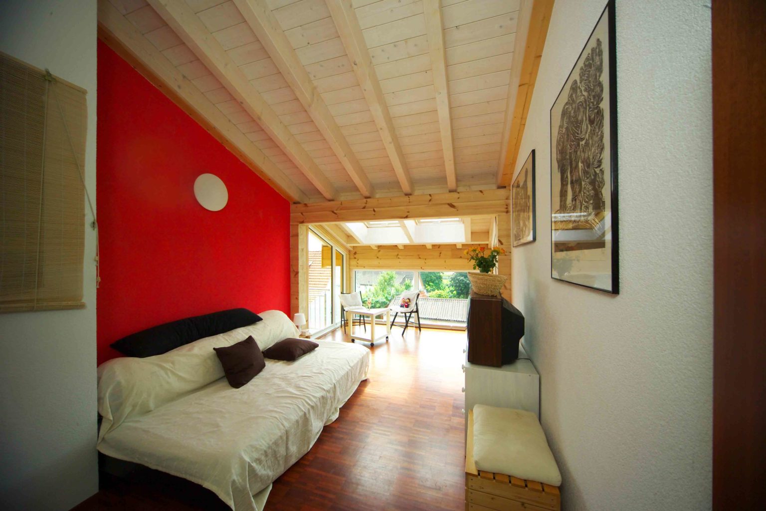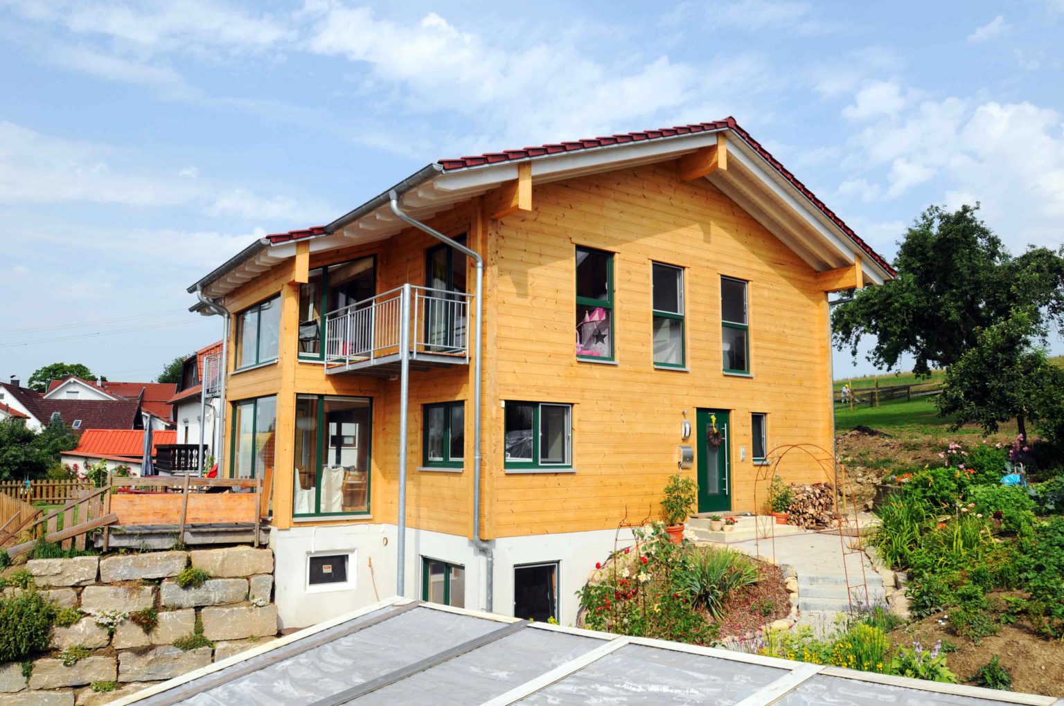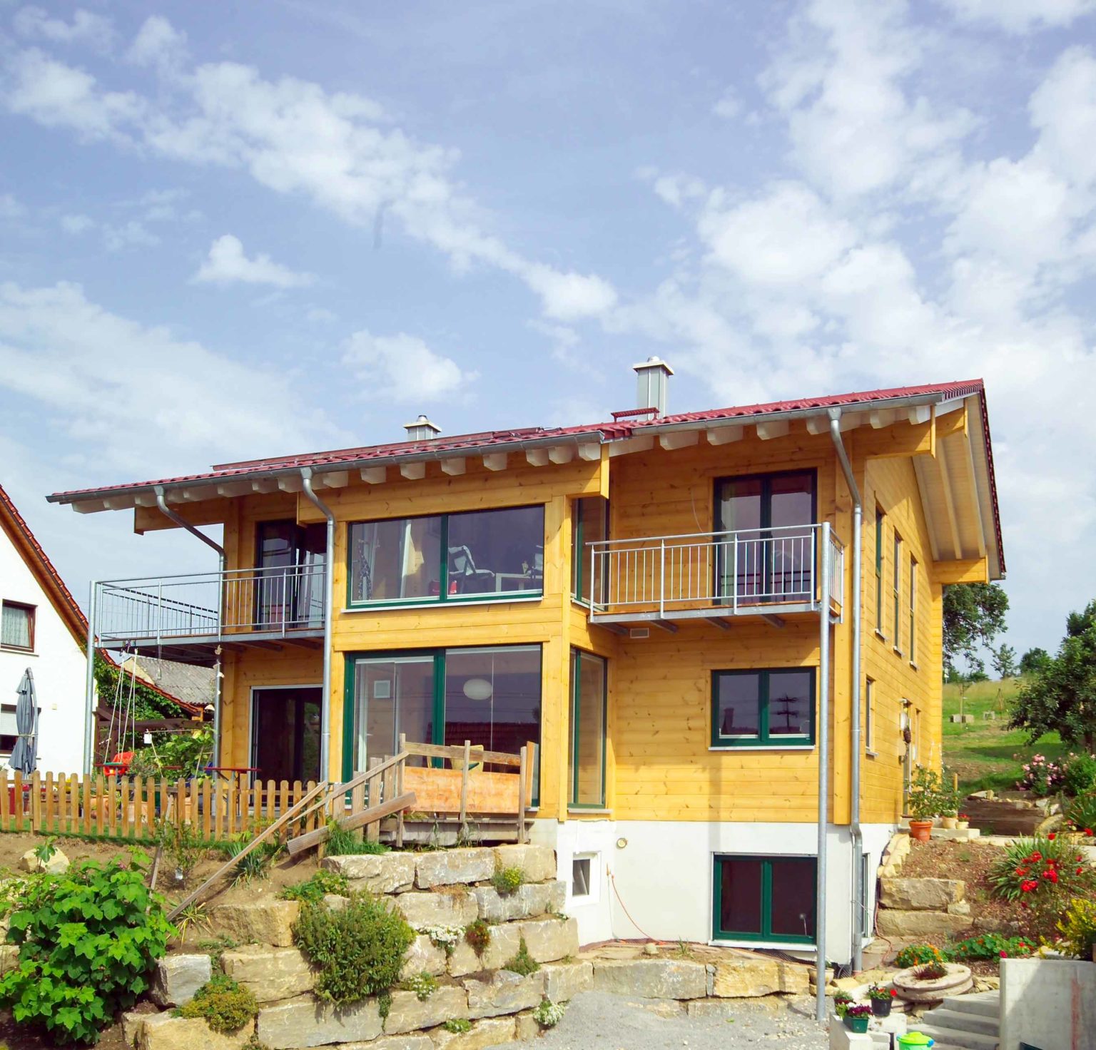 Mit drei Kinderzimmern plus Gästezimmer bietet auch das Dachgeschoss ein komfortables Raumprogramm, zumal die Dachschrägen dank hohem Kniestock kaum zu bemerken sind. Jedes Zimmer hat Zugang zu mindestens einem Balkon. Praktisches Planungsdetail: WC und Bad wurden voneinander getrennt. Dies dürfte die Wartezeiten in der morgendlichen „Rushhour“ deutlich verkürzen. Das Eigenleistungsprogramm der Baufamilie war umfangreich: Den kompletten Ausbau inklusive Dachausbau und Beplankung der Innenwände übernahm sie in Eigenregie, nur den Keller, die Elektroinstallation und den Fußboden vergaben Eva und Klaus May an Fachbetriebe. Trotz dieses hohen Anteils an Muskelhypothek schafften sie den Einzug in nur viereinhalb Monaten – am 28. April 2006 hatte der Hausaufbau begonnen, in der zweiten Septemberwoche wohnte man schon in den eigenen vier Wänden. Klaus May: „Schon der Aufbau selbst war hervorragend gelaufen. Am ersten Abend standen bereits sieben von acht Außenwänden, am Abend des vierten Tages war der Dachstuhl montiert und verschalt. Damit war unser Holzhaus regendicht. Der Innenausbau lief dann so reibungslos, dass wir am Ende weit unter unserem Zeitplan blieben. Alles funktionierte so, wie wir es erhofft hatten.“ Kein Wunder, dass die Familie jederzeit wieder mit Fullwood bauen würde. Auch deshalb, weil sie sich in der Wohnatmosphäre ihres Heimes rundum wohl fühlt. Und weil ihr Holzhaus so warm ist, dass man die Heizung an Ostern aus- und erst an Allerheiligen wieder einschalten kann. Die Sonne, an Sommertagen durch breite Dachüberstände aus den Wohnräumen verbannt, trägt im Winter bei niedrigem Sonnenstand ihren Teil zur Heizung bei. Außerdem unterstützen eine Solaranlage und ein Kaminofen den Heizungsbrenner, in dem Eva und Klaus May Holzpellets verfeuern. Zweimal wurde der Pellets-Speicher seit dem Einzug gefüllt, was einem Verbrauch von etwa 4 Tonnen Pellets pro Jahr und jährlichen Heizkosten von etwa 700 Euro entspricht. Wobei Eva May zu bedenken gibt, „dass wir ohne Krabbelkind wahrscheinlich sehr viel niedrigere Heizkosten hätten.“ Günstige Perspektive für die Zukunft also, in der die Heizkosten gegen den allgemeinen Trend deutlich sinken könnten. Ähnlich positiv fällt der Rückblick aus: „Heute sind wir total froh, dass wir uns für ein massives Holzhaus entschieden haben.“