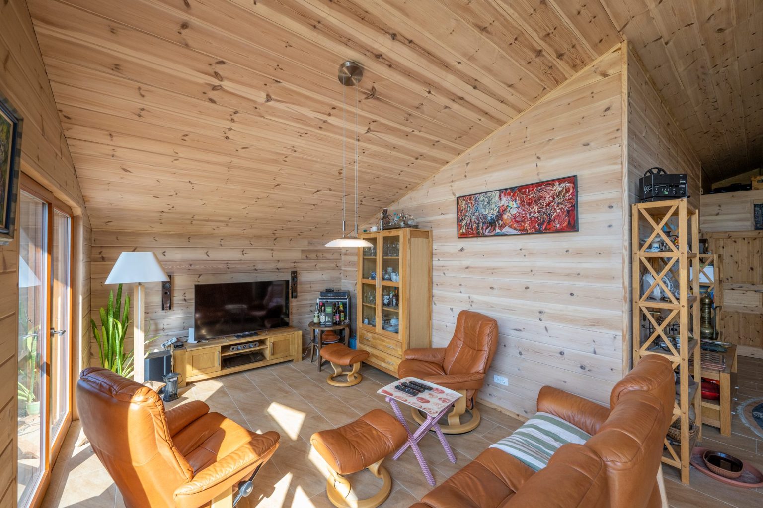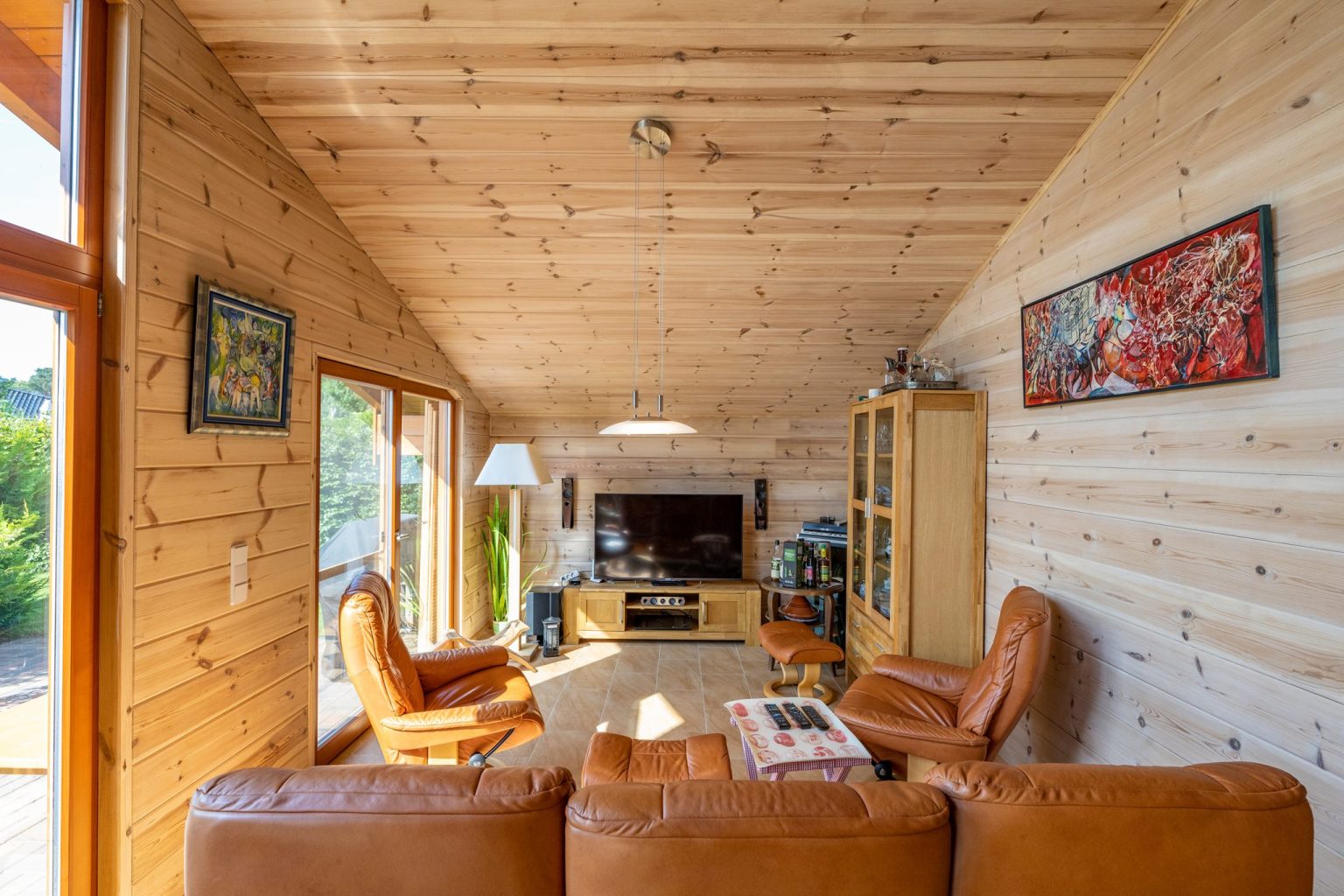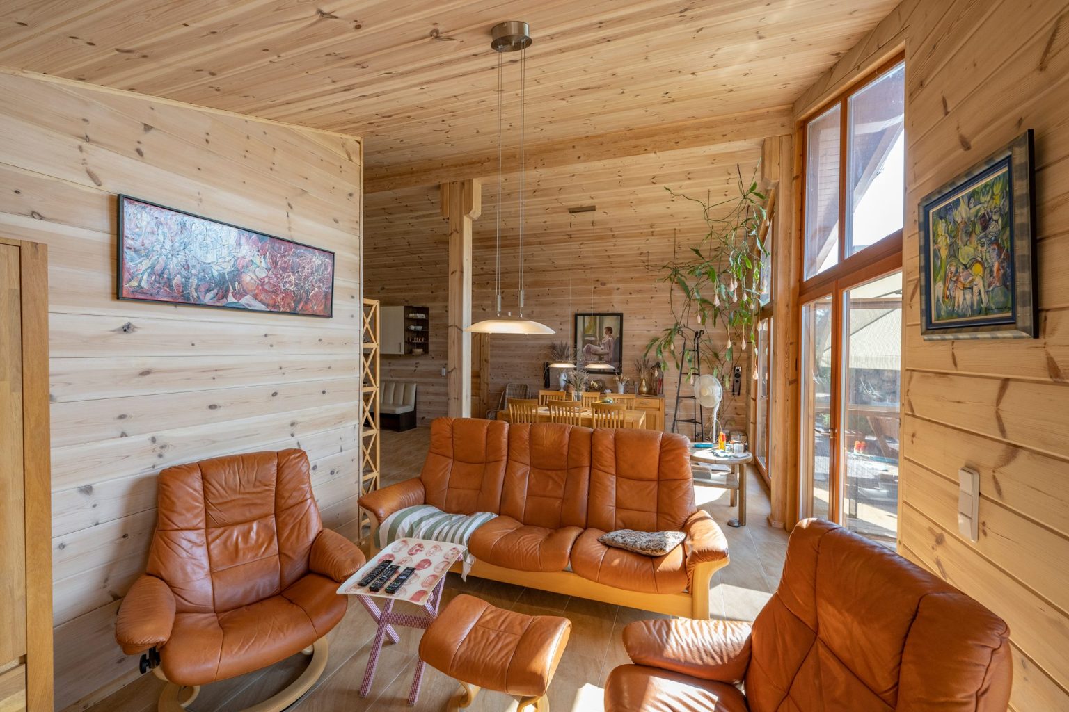 Den Dachstuhl ließen die Hausbesitzer mit glatten Kiefernbrettern verkleiden, lediglich die lange Firstpfette ist sichtbar. Aufgrund der Länge des Hauses ruht sie auf zwei Holzpfeilern, die sich beide im offenen Wohnbereich des Gebäudes befinden. Für die Fußböden wählte das Eigentümerpaar lieber Fliesen anstatt Holzparkett, einzig aus dem Grunde, weil Fliesen pflegeleichter sind. Schaut man von weitem, könnte man sie auch für helles Holz halten. Die Zimmertüren sind wiederum alle aus Kiefernholz und fügen sich fast unsichtbar in die Wandflächen ein. Konsequenterweise sind auch die Fenster aus Holz, setzen sich drinnen aber farblich von den Wänden ab. Ihr Cognac-Ton findet sich in der ledernen Sofalandschaft wieder. Draußen hingegen bekamen die Blockwände einen Schutzanstrich, dessen Farbe den Holzfenstern entspricht. Auch das Hausdach hebt sich mit seiner ziegelroten Dacheindeckung optisch kaum ab und das ganze Gebäude wirkt wie aus einem Guss.