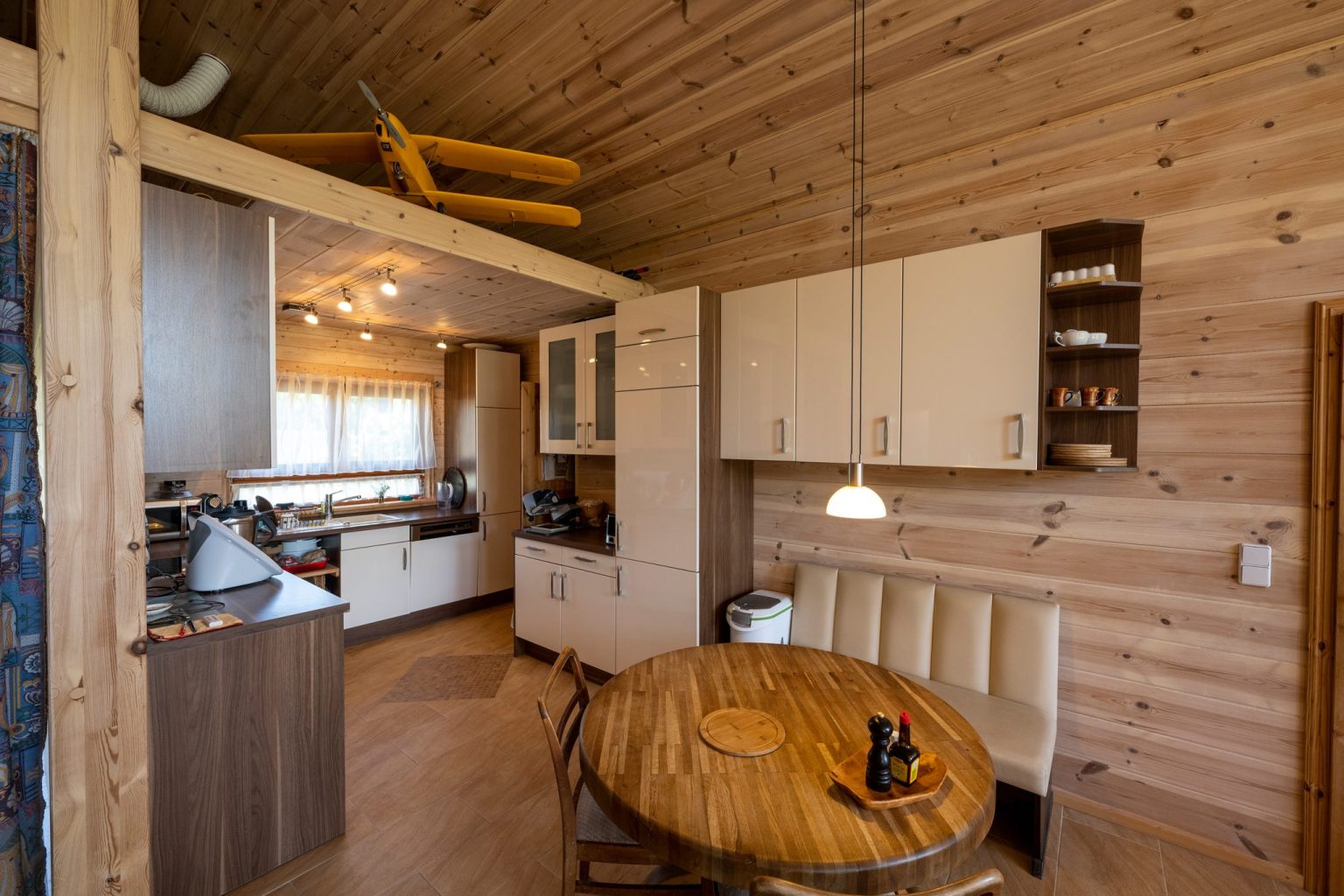 Als Holzhaus für Puristen könnte man Holzhaus „am Mellensee“ betiteln, da es ausschließlich Holzwände besitzt. „Aber Fullwood Wohnblockhaus baut doch immer massive Holzhäuser mit Blockwänden.“, wänden Sie zurecht ein. Das stimmt für die tragenden Außenwände, aber die Trennwände zwischen den Räumen sind üblicherweise nicht massiv, das wäre zu unpraktisch und zu teuer. Stattdessen bestehen sie aus leichtem Ständerwerk, welches individuell gedämmt und verkleidet werden kann. Die meisten Bauherren möchten sowieso nicht ausschließlich Holzwände in ihrem Haus haben, sondern kombinieren gerne weiße, farbige oder gemusterte Wandflächen zum Holz. Zu den hellen, glatten Blockbohlenwänden aus Polarkiefernholz passt einfach jede Farbe und jede Struktur. Ein kleiner Teil der Bauherrschaft entscheidet sich jedoch für so viel Holz wie möglich und verkleidet auch die Trennwände mit hellem Kiefernholz – so auch die Eigentümer von Holzhaus „am Mellensee“. Lediglich im Bad und im Gäste-WC finden sich dort Wandfliesen.