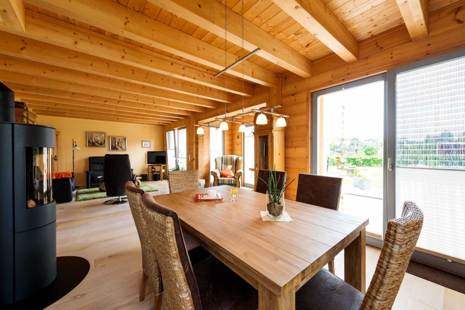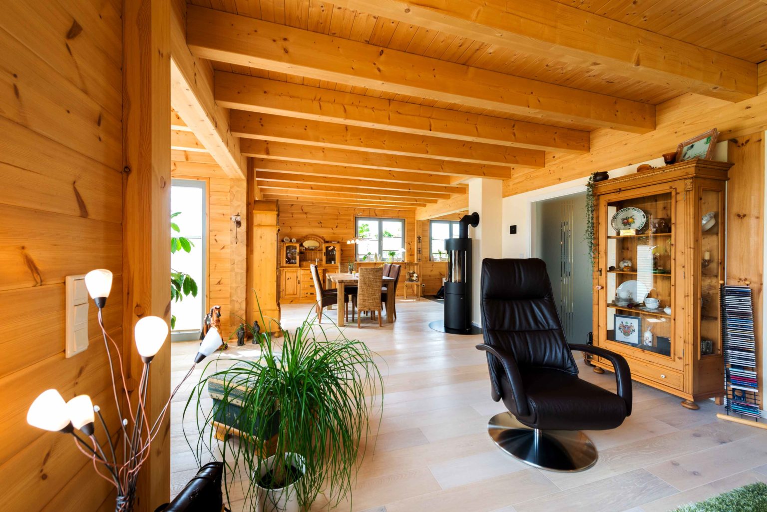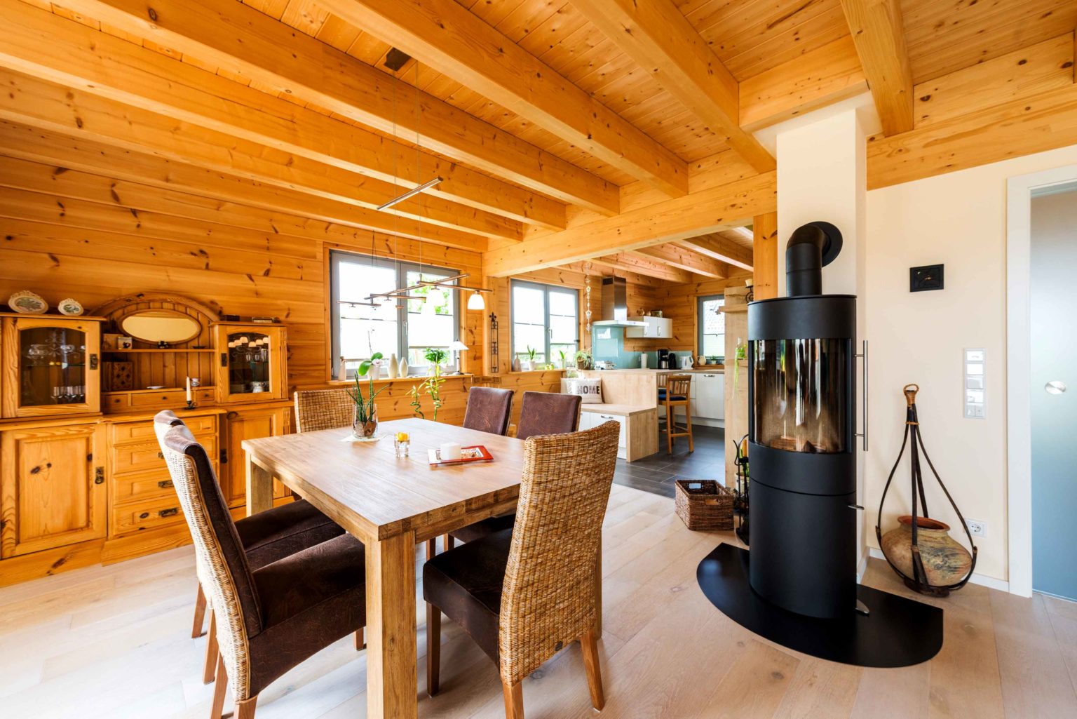 Holzhaus „am Mühlstein“ erhält besonders im großzügig bemessenen Wohnbereich viel natürliches Licht durch bodentiefe Fenster. In dem nach Süden ausgerichteten, L-förmigen Raum mit Erker (zweigeschossiges Zwerchhaus) gehen Küche, Esszimmer und Wohnzimmer fließend ineinander über und nehmen gut zwei Drittel des Erdgeschosses für sich in Anspruch. Ein direkter Zugang auf die Terrasse und in den ebenen Garten erweitert den Wohnbereich bei gutem Wetter nach draußen. „Für besonders gemütliche Stunden, wenn der Schneemann mal wieder vorbeischaut, haben wir einen hoch effektiven und umweltschonenden Kaminofen einbauen lassen.“, freut sich der Hausherr. Eine besonders geräumige Diele, die bis zum First offen ist, empfängt Eintretende und wartet mit einer sehr hellen, halb gewendelten Buchentreppe auf, die hinauf auf die Galerie im Dachgeschoss führt. Während im Erdgeschoss noch ein Hauswirtschaftsraum und ein Gäste-WC zu nennen sind, gelangt man von der mit einem gut belichteten Arbeitsplatz ausgestatteten Galerie in ein großes Schlafzimmer, ein Wohnbad und ein Gästezimmer. Durch die naturhellen Holzwände und Blockbalkendecken (nur im Erdgeschoss) wirkt Holzhaus „am Mühlstein“ besonders warm und behaglich. Die verputzten und in hellen Farben oder weiß gestrichenen Trennwände (leichte Ständerbauweise) fügen Leichtigkeit und Helligkeit hinzu, so dass keinerlei Rustikalität entsteht. Dem wirken schon die glatten, schnörkelfreien Kiefernwände entgegen.