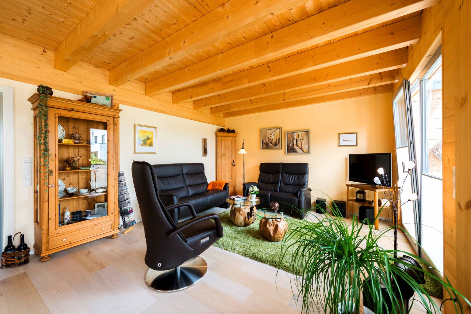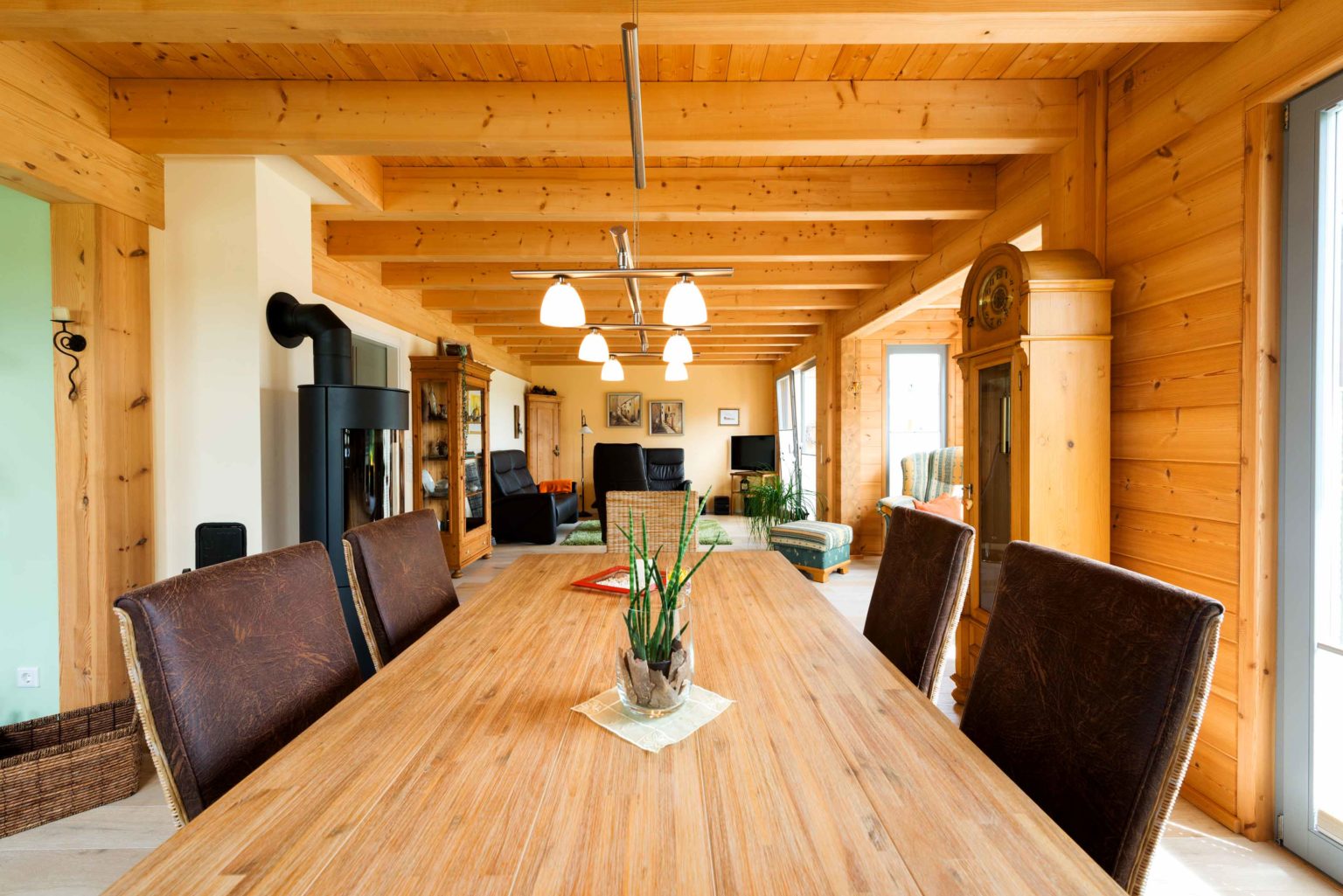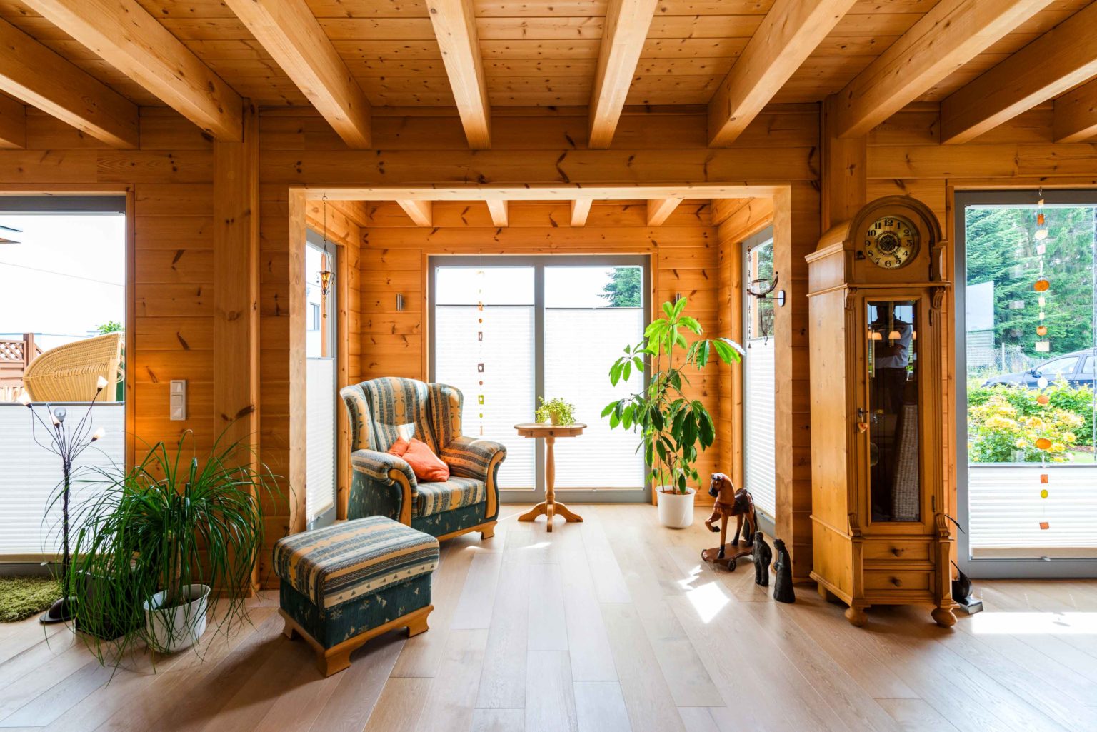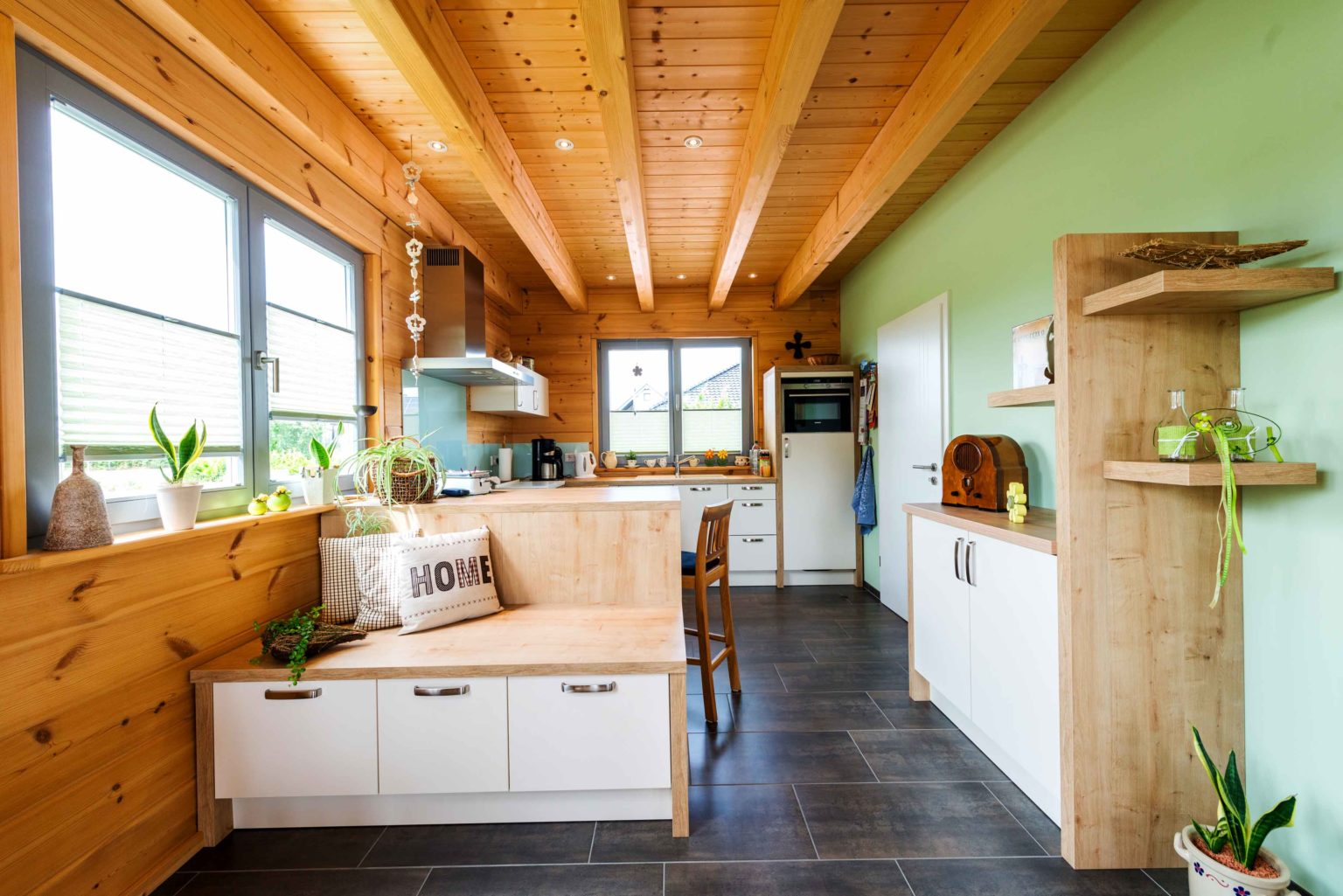 Holzhaus „am Mühlstein“ erhält besonders im großzügig bemessenen Wohnbereich viel natürliches Licht durch bodentiefe Fenster. In dem nach Süden ausgerichteten, L-förmigen Raum mit Erker (zweigeschossiges Zwerchhaus) gehen Küche, Esszimmer und Wohnzimmer fließend ineinander über und nehmen gut zwei Drittel des Erdgeschosses für sich in Anspruch. Ein direkter Zugang auf die Terrasse und in den ebenen Garten erweitert den Wohnbereich bei gutem Wetter nach draußen. „Für besonders gemütliche Stunden, wenn der Schneemann mal wieder vorbeischaut, haben wir einen hoch effektiven und umweltschonenden Kaminofen einbauen lassen.“, freut sich der Hausherr. Eine besonders geräumige Diele, die bis zum First offen ist, empfängt Eintretende und wartet mit einer sehr hellen, halb gewendelten Buchentreppe auf, die hinauf auf die Galerie im Dachgeschoss führt. Während im Erdgeschoss noch ein Hauswirtschaftsraum und ein Gäste-WC zu nennen sind, gelangt man von der mit einem gut belichteten Arbeitsplatz ausgestatteten Galerie in ein großes Schlafzimmer, ein Wohnbad und ein Gästezimmer. Durch die naturhellen Holzwände und Blockbalkendecken (nur im Erdgeschoss) wirkt Holzhaus „am Mühlstein“ besonders warm und behaglich. Die verputzten und in hellen Farben oder weiß gestrichenen Trennwände (leichte Ständerbauweise) fügen Leichtigkeit und Helligkeit hinzu, so dass keinerlei Rustikalität entsteht. Dem wirken schon die glatten, schnörkelfreien Kiefernwände entgegen.