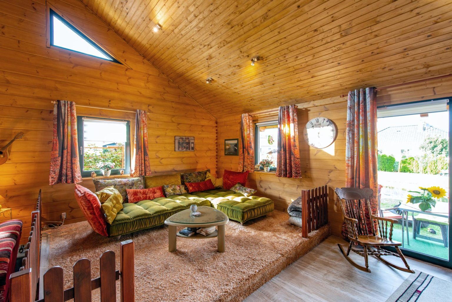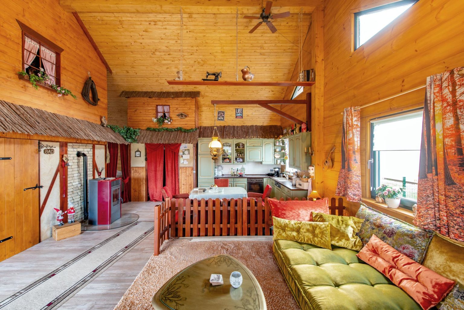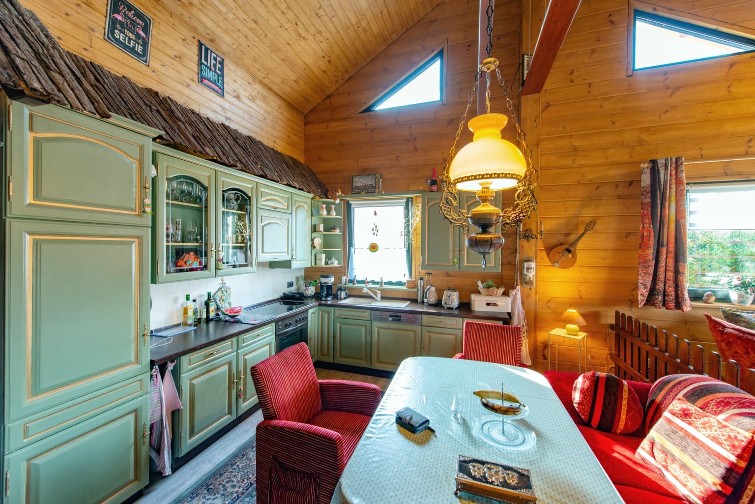 Der schlichte Baukörper gleicht einem länglichen Kubus, der von einem Satteldach gekrönt wird. Zur Straßenseite hin ist das Dach gut zwei Meter abgeschleppt, und dient dort als Verandadach. Die Veranda selbst ist aus Holz und besitzt einen Holzzaun und verstrebte Holzstützen im originalen amerikanischen Farmhauslook. Die Kiefernwände leuchten in einem warmen, hellen Ton, der wunderbar das dunkelgrün der Tondachziegel und Fenster ergänzt. Drinnen wurde das Holz nicht lasiert und darf nachdunkeln, so dass es noch wärmer wirkt. An der Gartenseite besitzt Holzhaus „am Plauer See“ einen mit Holzbrettern begrenzten Freisitz, von dem aus man die weitläufige, ebene Rasenfläche und den schmucken Gartenteich im Blick hat. Ein Gartenhäuschen gibt es auch, dort dürfen Gäste residieren. In seinem Holzhaus lebt das Ehepaar seinen ganz eigenen, verspielten und farbenfrohen Wohntraum aus, der einem almerischen Landhausstil ähnelt. Elemente, die an draußen erinnern, wurden hereingeholt, z.B.: zwei Sprossenfenster mit rotweißkarierten Vorhängen dahinter und innenliegenden Blumenkästen; schräge Vordachlemente auf halber Raumhöhe entlang zweier Wände; eine Stalltüre; und ein Holzlattenzaun als Eingrenzung der großzügigen Sofalandschaft, die auf einem Podest thront. Neben dem hallenartigen Wohnbereich beherbergt das Holzgebäude eine Diele, mit Zugang zum Hauswirtschaftsraum, sowie ein geräumiges Wohnbad, ein Schlafzimmer und einen kleinen Wellnessraum für Angela – die alle vom Wohnbereich aus zugänglich sind. Ein Abstellraum verbirgt sich oben in dem kleinen „Haus im Haus“ unter den Dachschrägen. „Wir würden jederzeit wieder mit Fullwood bauen!“, betonen die Kissings.