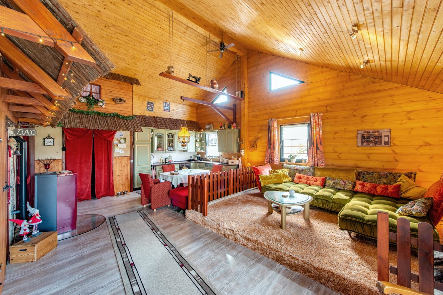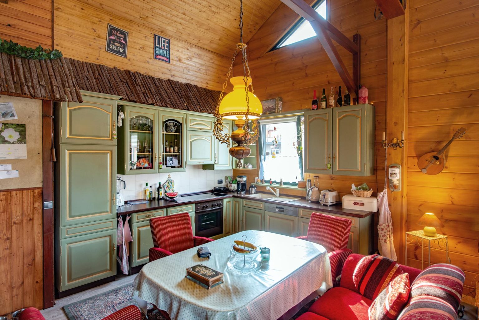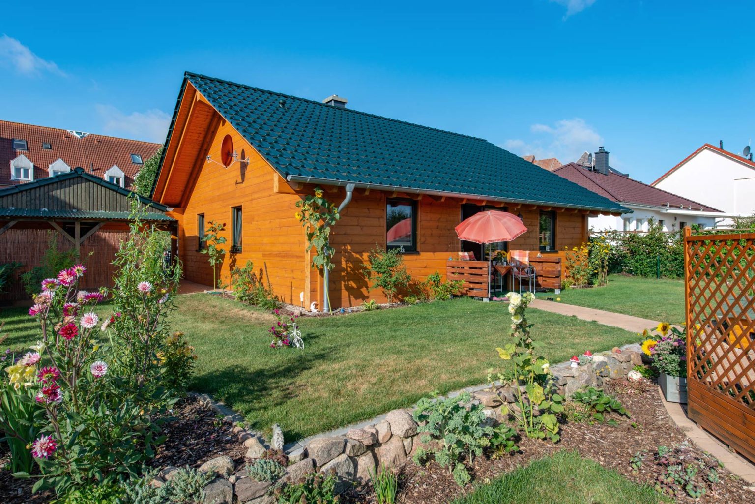 Der schlichte Baukörper gleicht einem länglichen Kubus, der von einem Satteldach gekrönt wird. Zur Straßenseite hin ist das Dach gut zwei Meter abgeschleppt, und dient dort als Verandadach. Die Veranda selbst ist aus Holz und besitzt einen Holzzaun und verstrebte Holzstützen im originalen amerikanischen Farmhauslook. Die Kiefernwände leuchten in einem warmen, hellen Ton, der wunderbar das dunkelgrün der Tondachziegel und Fenster ergänzt. Drinnen wurde das Holz nicht lasiert und darf nachdunkeln, so dass es noch wärmer wirkt. An der Gartenseite besitzt Holzhaus „am Plauer See“ einen mit Holzbrettern begrenzten Freisitz, von dem aus man die weitläufige, ebene Rasenfläche und den schmucken Gartenteich im Blick hat. Ein Gartenhäuschen gibt es auch, dort dürfen Gäste residieren. In seinem Holzhaus lebt das Ehepaar seinen ganz eigenen, verspielten und farbenfrohen Wohntraum aus, der einem almerischen Landhausstil ähnelt. Elemente, die an draußen erinnern, wurden hereingeholt, z.B.: zwei Sprossenfenster mit rotweißkarierten Vorhängen dahinter und innenliegenden Blumenkästen; schräge Vordachlemente auf halber Raumhöhe entlang zweier Wände; eine Stalltüre; und ein Holzlattenzaun als Eingrenzung der großzügigen Sofalandschaft, die auf einem Podest thront. Neben dem hallenartigen Wohnbereich beherbergt das Holzgebäude eine Diele, mit Zugang zum Hauswirtschaftsraum, sowie ein geräumiges Wohnbad, ein Schlafzimmer und einen kleinen Wellnessraum für Angela – die alle vom Wohnbereich aus zugänglich sind. Ein Abstellraum verbirgt sich oben in dem kleinen „Haus im Haus“ unter den Dachschrägen. „Wir würden jederzeit wieder mit Fullwood bauen!“, betonen die Kissings.