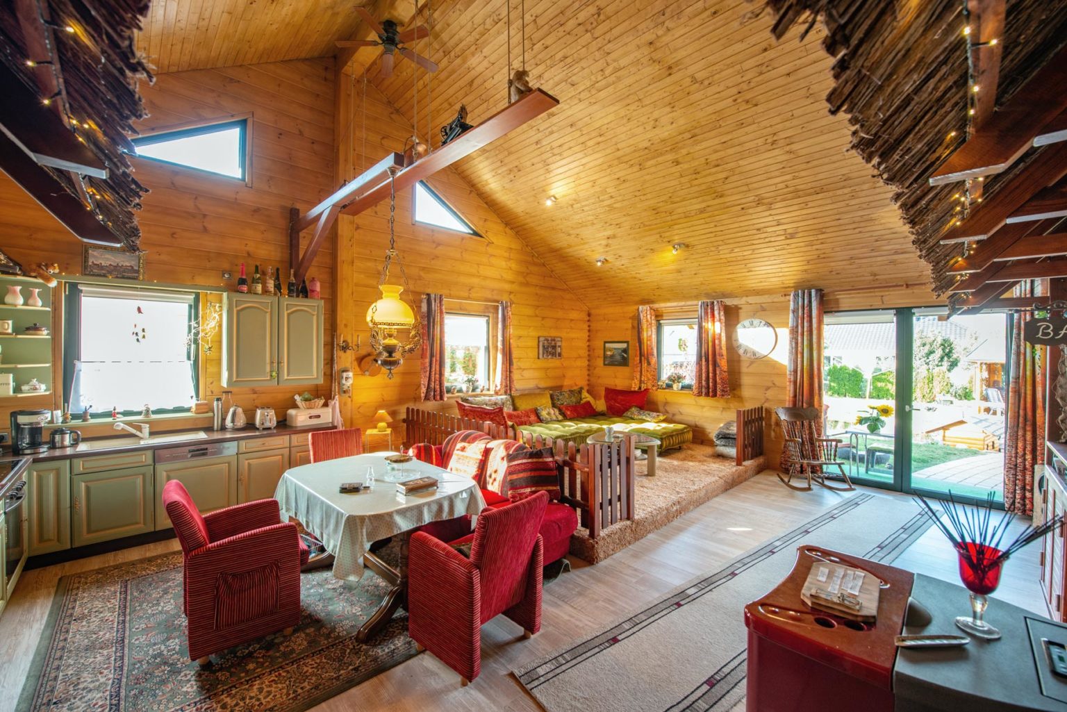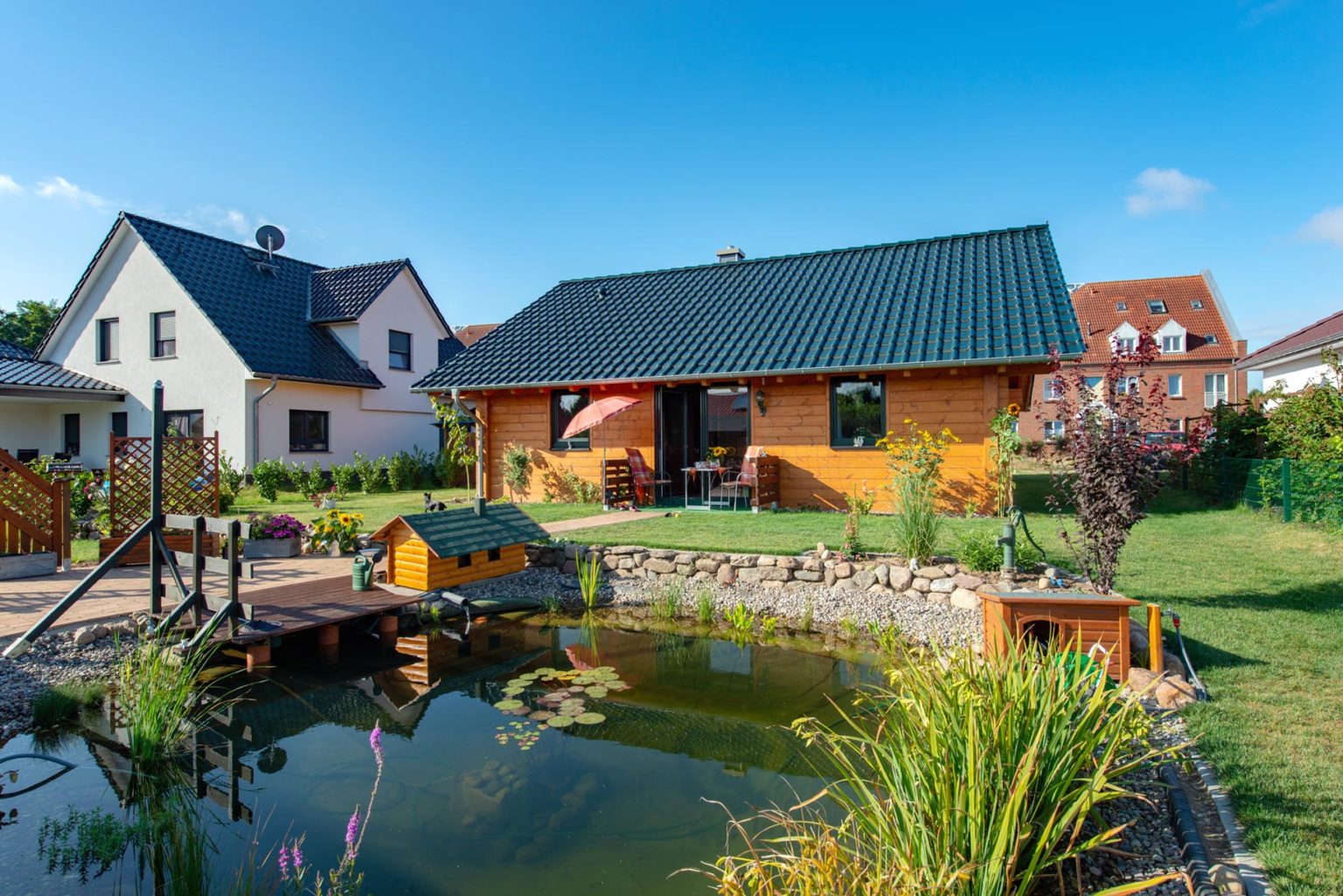 Das Holzhaus wird ausschließlich mit einem Pellets-Ofen, der im offenen Wohnbereich steht, beheizt. „Wir haben lediglich 250€ Heizkosten im Jahr!“, schwärmt die Dame des Hauses und ergänzt: „Die massiven Blockwände von Fullwood dämmen sehr gut, sogar besser, als der theoretisch errechneter U-Wert vermuten ließe. Das versprach man uns schon im Vorfeld, und jetzt wissen wir, dass es stimmt!“ Freilich tragen auch die Wärmeschutzfenster und das gut gedämmte Satteldach zum niedrigen Heizenergiebedarf von Holzhaus „am Plauer See“ bei. „Da die Heizwärme nach oben steigt und unsere Räume bis zum First offen sind, haben wir dort oben unterm Firstbalken einen Ventilator angebracht. Der ist nicht zum Abkühlen gedacht sondern verwirbelt die warme Luft, so dass wir es nicht nur unterm Dach warm haben, sondern auch unten.“, erklärt der Hausherr. Tatsächlich bewirkt eine Holzumgebung nachweislich eine höher gefühlte Raumtemperatur, so dass man sich bei 2-3 Grad niedrigeren Innenraumtemperaturen schon sehr behaglich fühlt. Davon profitieren auch die Schleimhäute, welche bekanntlich unter trockener Heizungsluft leiden. „Das Raumklima in unserem Holzhaus ist immer sehr angenehm!“, sagt Angela Kissing.