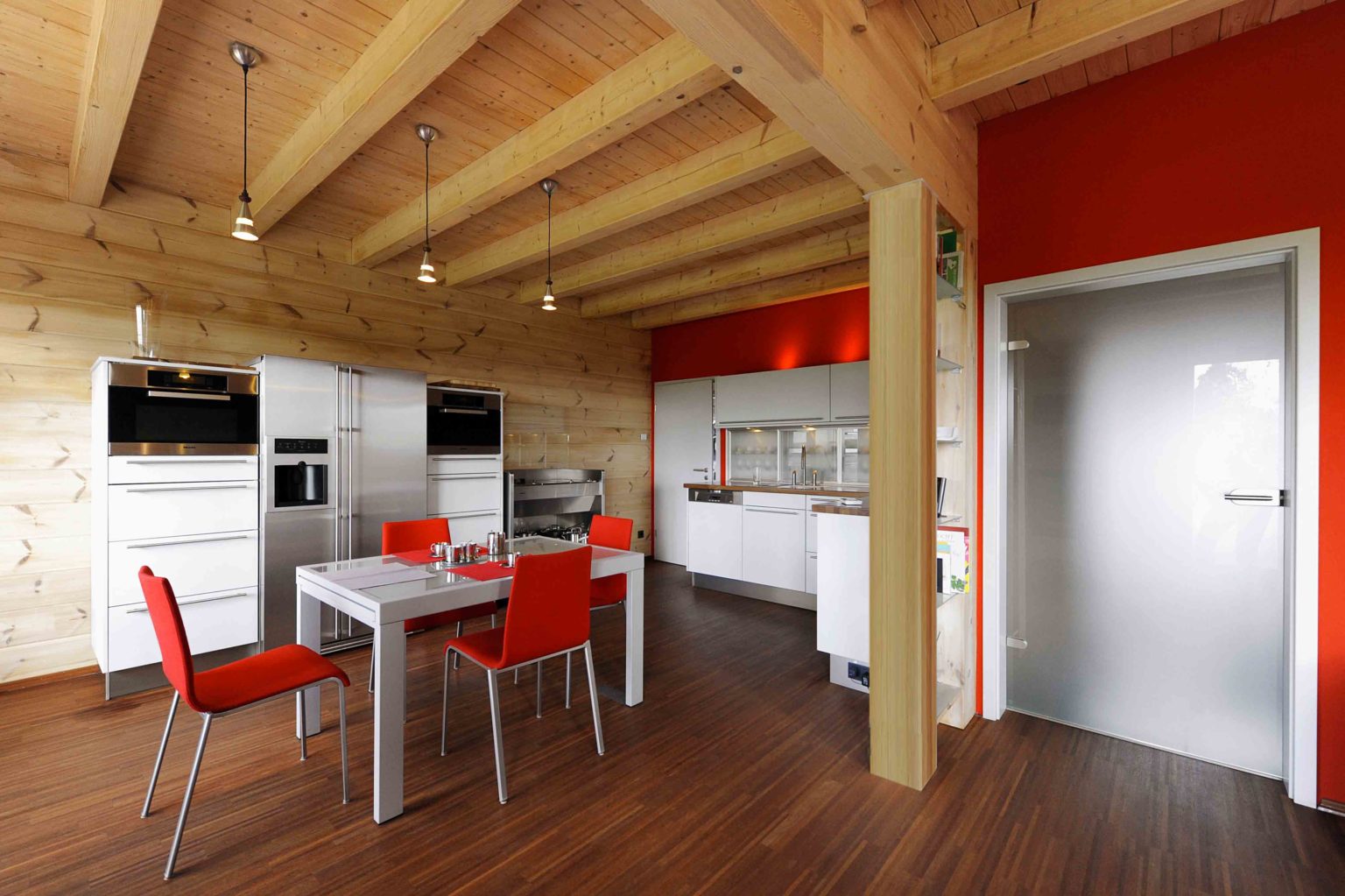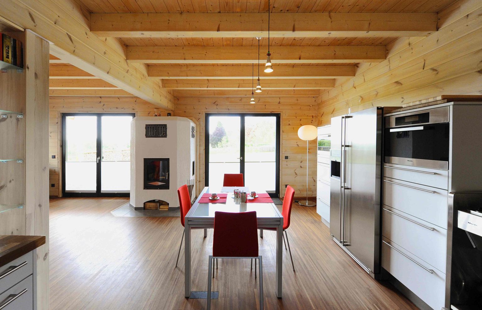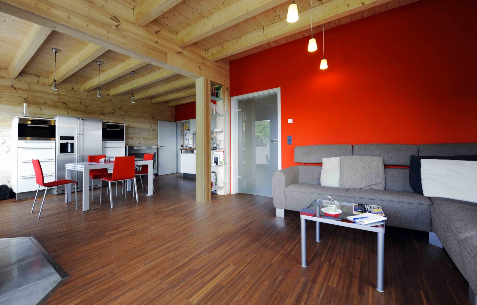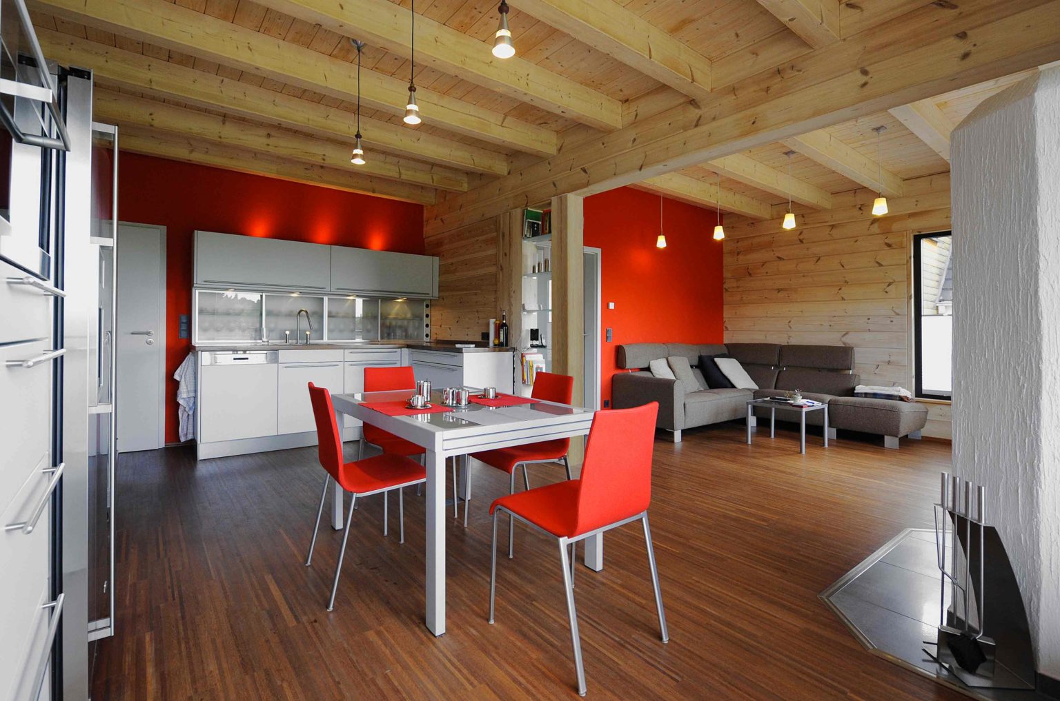 Im Obergeschoss hat er die Dachschrägen mit weißen, zementgebundenen Holzfaserplatten (USB-Platten) über der Dämmung verkleidet. Einzelne Ständerbauwände unterteilen das Erdgeschoss und sind im Wohnbereich signalrot gestrichen. Ansonsten ist alles aus massivem Holz. „Unser Holzhaus hält die Wärme sehr gut, mit Kamin haben wir hier manchmal 27 Grad“, berichtet die Hausherrin. Als besonders überzeugend empfindet sie den Feuchtigkeitsausgleich des Holzes. „Wenn im Bad ein Schwall Dampf aus der Dampfdusche kommt, ist der sofort weg.“