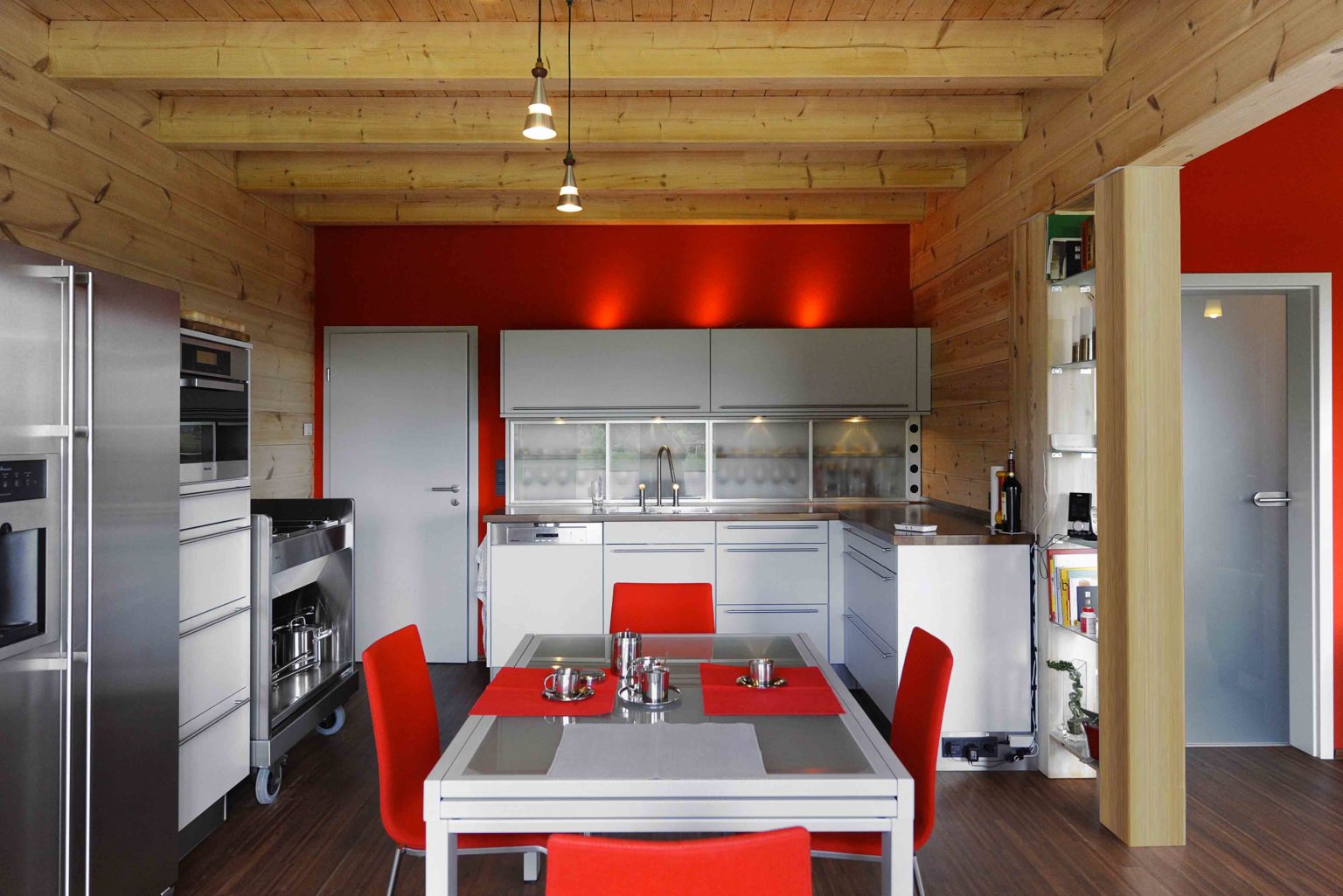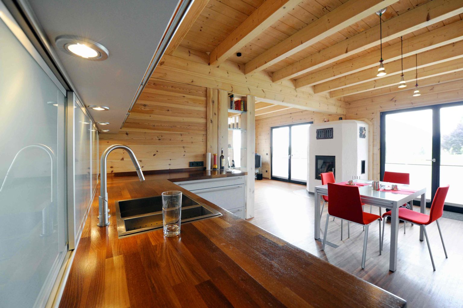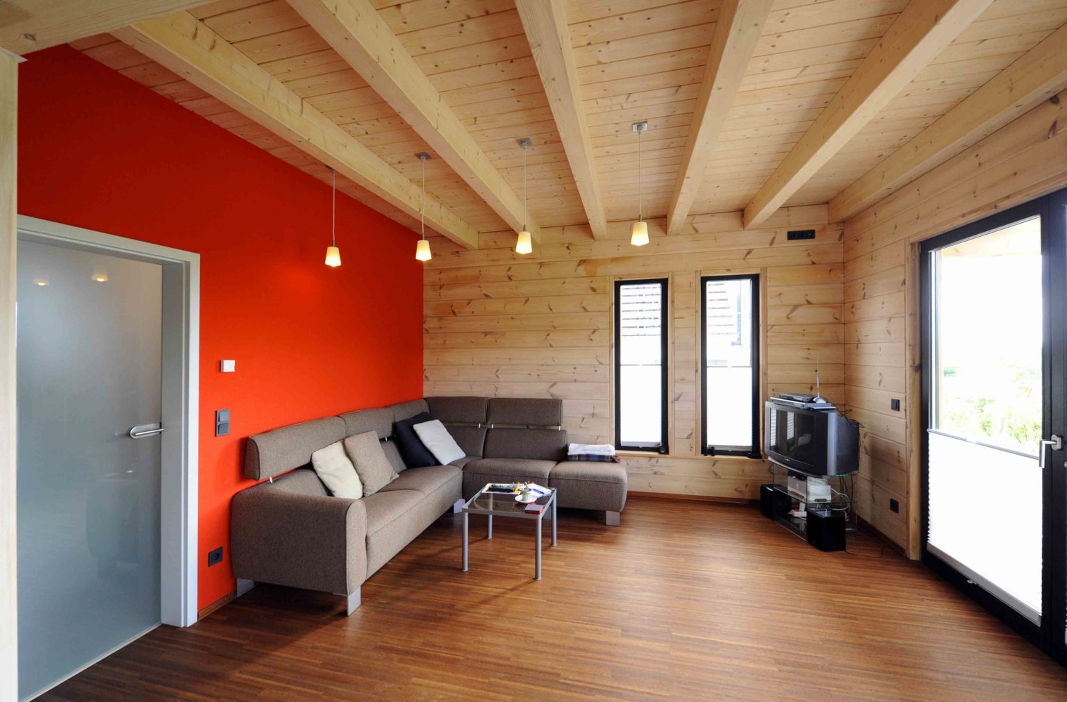 Im Obergeschoss hat er die Dachschrägen mit weißen, zementgebundenen Holzfaserplatten (USB-Platten) über der Dämmung verkleidet. Einzelne Ständerbauwände unterteilen das Erdgeschoss und sind im Wohnbereich signalrot gestrichen. Ansonsten ist alles aus massivem Holz. „Unser Holzhaus hält die Wärme sehr gut, mit Kamin haben wir hier manchmal 27 Grad“, berichtet die Hausherrin. Als besonders überzeugend empfindet sie den Feuchtigkeitsausgleich des Holzes. „Wenn im Bad ein Schwall Dampf aus der Dampfdusche kommt, ist der sofort weg.“