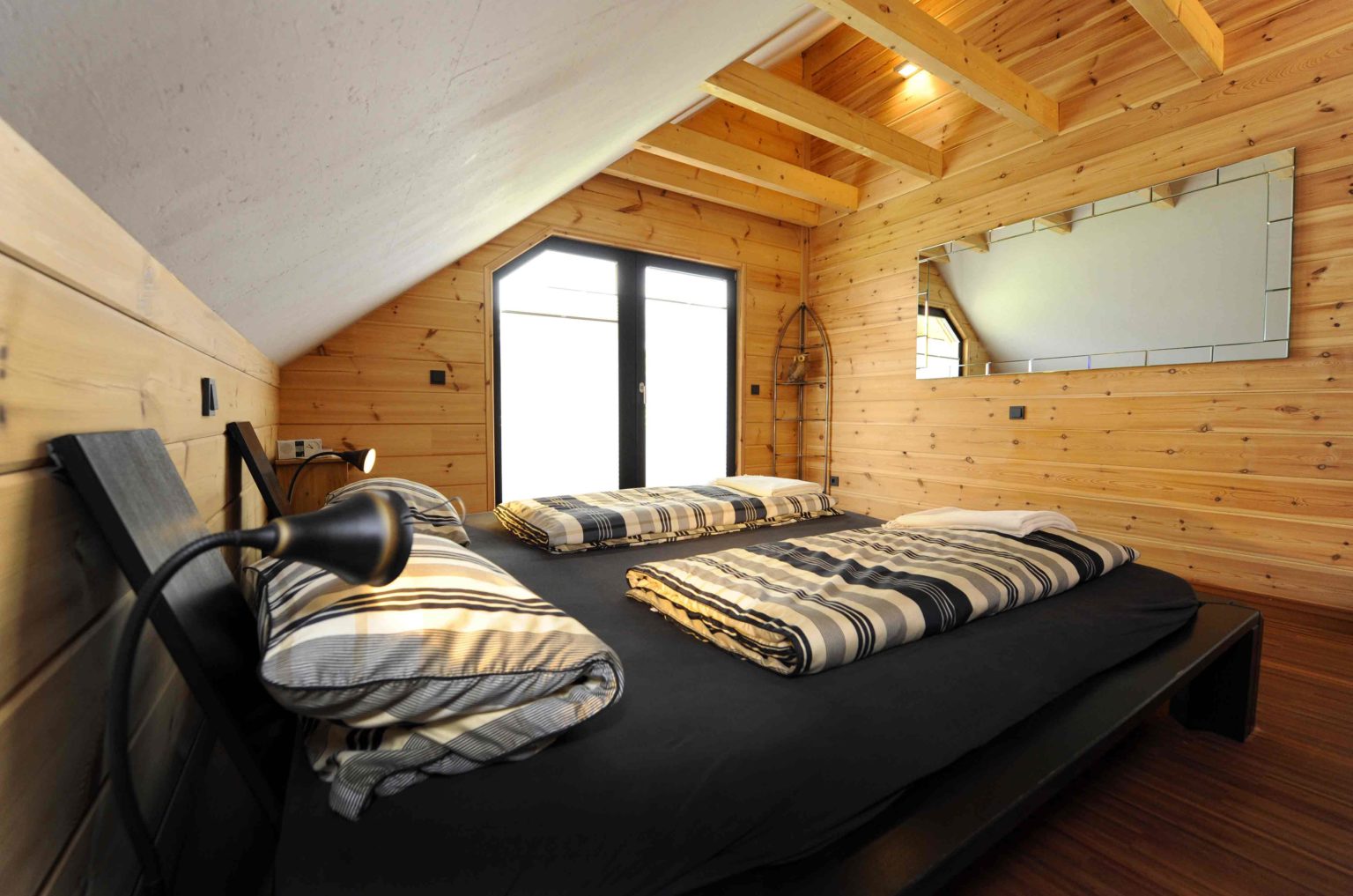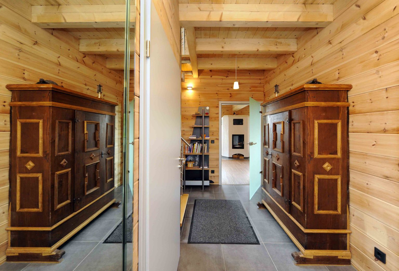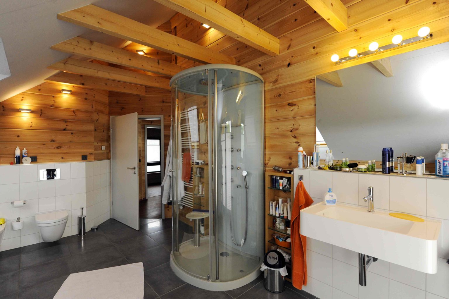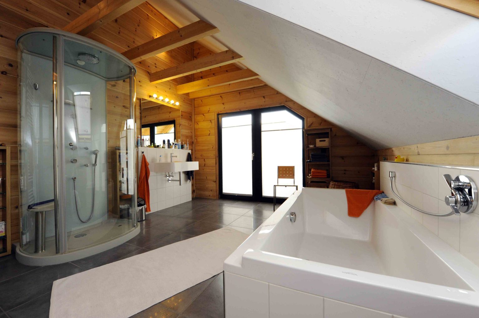 Im Obergeschoss hat er die Dachschrägen mit weißen, zementgebundenen Holzfaserplatten (USB-Platten) über der Dämmung verkleidet. Einzelne Ständerbauwände unterteilen das Erdgeschoss und sind im Wohnbereich signalrot gestrichen. Ansonsten ist alles aus massivem Holz. „Unser Holzhaus hält die Wärme sehr gut, mit Kamin haben wir hier manchmal 27 Grad“, berichtet die Hausherrin. Als besonders überzeugend empfindet sie den Feuchtigkeitsausgleich des Holzes. „Wenn im Bad ein Schwall Dampf aus der Dampfdusche kommt, ist der sofort weg.“