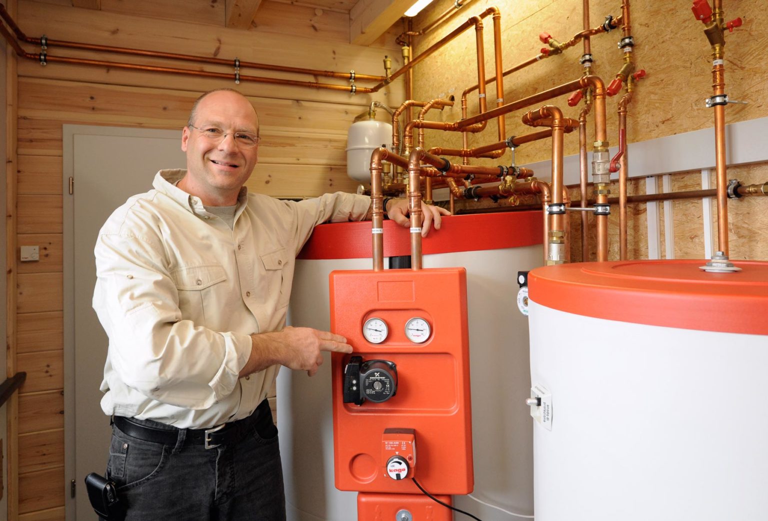 Laut Herstellerangaben muß er in fünf Jahren, dann nach weiteren sieben Jahren und das letzte Mal nach 14 Jahren nachstreichen. Zusammen mit dem optimal vorgetrockneten Holz und der fachgerechten Detail-Ausbildung (nach RAL-Güterichtlinien 402/1 und /2) kann damit auf einen gesundheitlich bedenklichen, chemischen Holzschutz verzichtet werden. Der Rohbau stand schon nach 4 Tagen („Der Richtmeister von Fullwood war einfach phantastisch!“) und nach weiteren 10 Monaten, in denen der Hausherr alles ohne Hilfe selbst ausgebaut und eingerichtet hat, zogen Claudia und er nur mit ein paar Koffern wie in ein Hotel ein. Jeden Arbeitsschritt hatte er zuvor genau im Kopf durchgespielt und vorbereitet, das Ausbaumaterial zuvor über viele Jahre besorgt und in den Kellern seiner Waschsalons eingelagert – säuberlich verpackt und beschriftet, von der edlen Einbauküche und der Dampfdusche über die Steckdosen bis hin zur elektrischen Zahnbürste! Sogar die komplette Heizungsanlage hat der Bauherr selbst montiert. „Die ist auch etwas Besonderes.“ Eine Gastherme, ein holzbefeuerter Kamin im Wohnzimmer mit Festbrennstoffkessel für Fußbodenheizung und Warmwasserbereitung und eine Solaranlage auf dem Dach speisen einen Speicher, der für Heizung und Warmwasser sorgt. Das System ist von einem Hersteller perfekt aufeinander abgestimmt und kam auf 21 Paletten, in der richtigen Reihenfolge verpackt mit detaillierter Bauanleitung. „Da fehlte nicht eine Schraube.“, schwärmt Matthias Meuthen noch heute.
