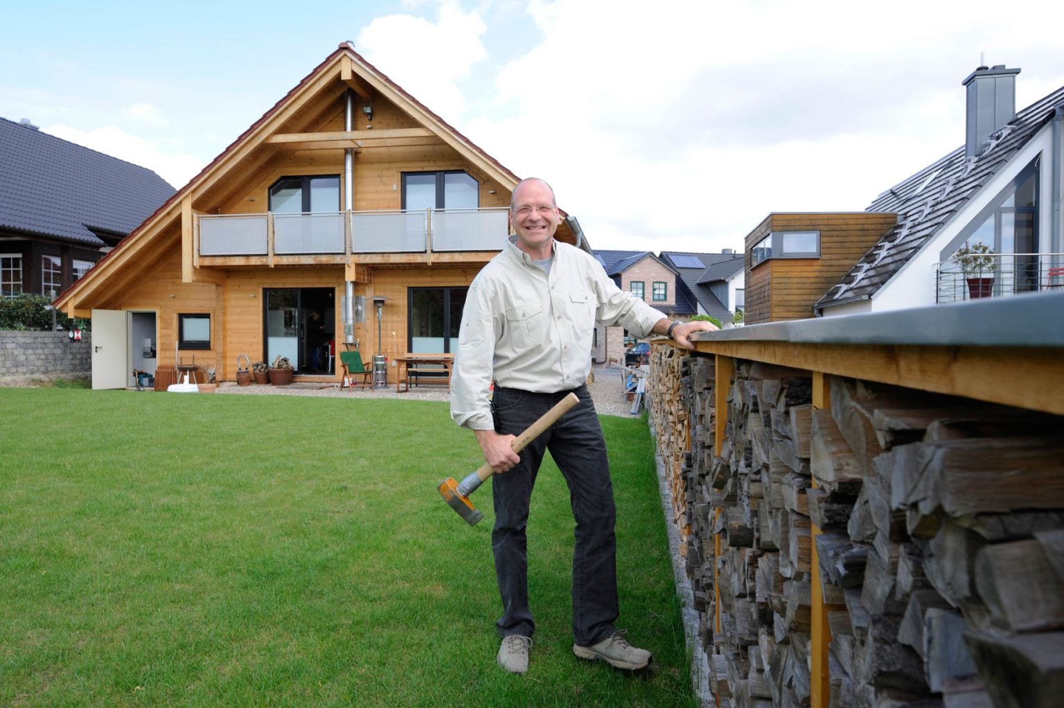 Viele pfiffige Details und gut durchdachte Ideen finden sich im Holzhaus von Matthias Meuthen. Beispielsweise ist das Treppengeländer aus Edelstahl im engen Treppenhaus komplett demontierbar. Überall entschied sich der Hausherr für 100er Türen. Es gibt einen Stromhauptschalter, der einfach zu bedienen ist aber Alarmanlage, Kühlschrank und Gefrierschrank ausnimmt. An der Decke sind Steckdosen an verschiedenen Stellen angebracht, so dass Lampen flexibel umgehängt werden können. Die Böden sind mit Fliesen aus Feinsteinzeug bedeckt und im Wohn- Essbereich mit einem dunklen tropischen Hartholz belegt. Sein Brennholz ist geschickt entlang der Grundstücksgrenze zum Nachbarn gestapelt und überdacht und dient nicht nur als Zaun, sondern ist bei trockenem Wetter auch „die längste Kölsch-Theke des Ortes“, wie der Hausherr augenzwinkernd anmerkt. Und während er vor Jahren noch nicht kochen konnte und für jeden Tee mit Honig in ein Lokal ging, ist er heute stolz auf seine Profiküche mit Dampfgarer. Einen chinesischen Koch wie in „Bonanza“ hat er aber nicht und lebt auch nicht mit Vater und Brüdern zusammen, wie die Filmfamilie. Claudia und er genießen lieber die traute Zweisamkeit in ihrem traumhaften Holzhaus.