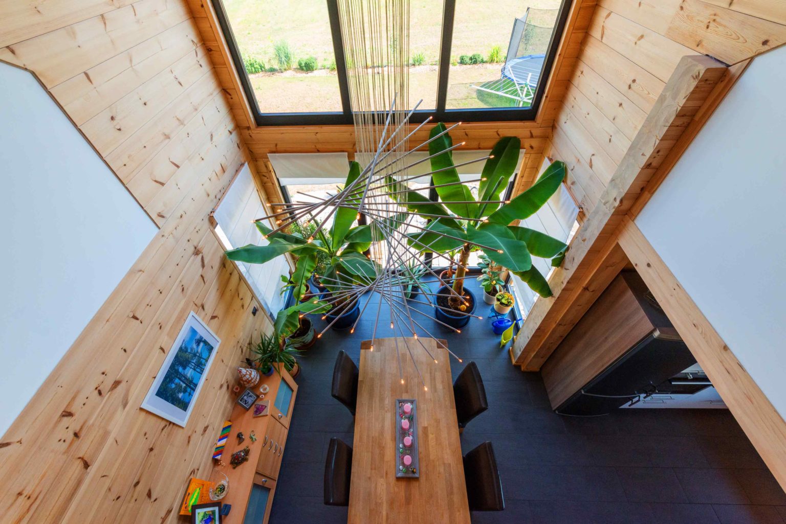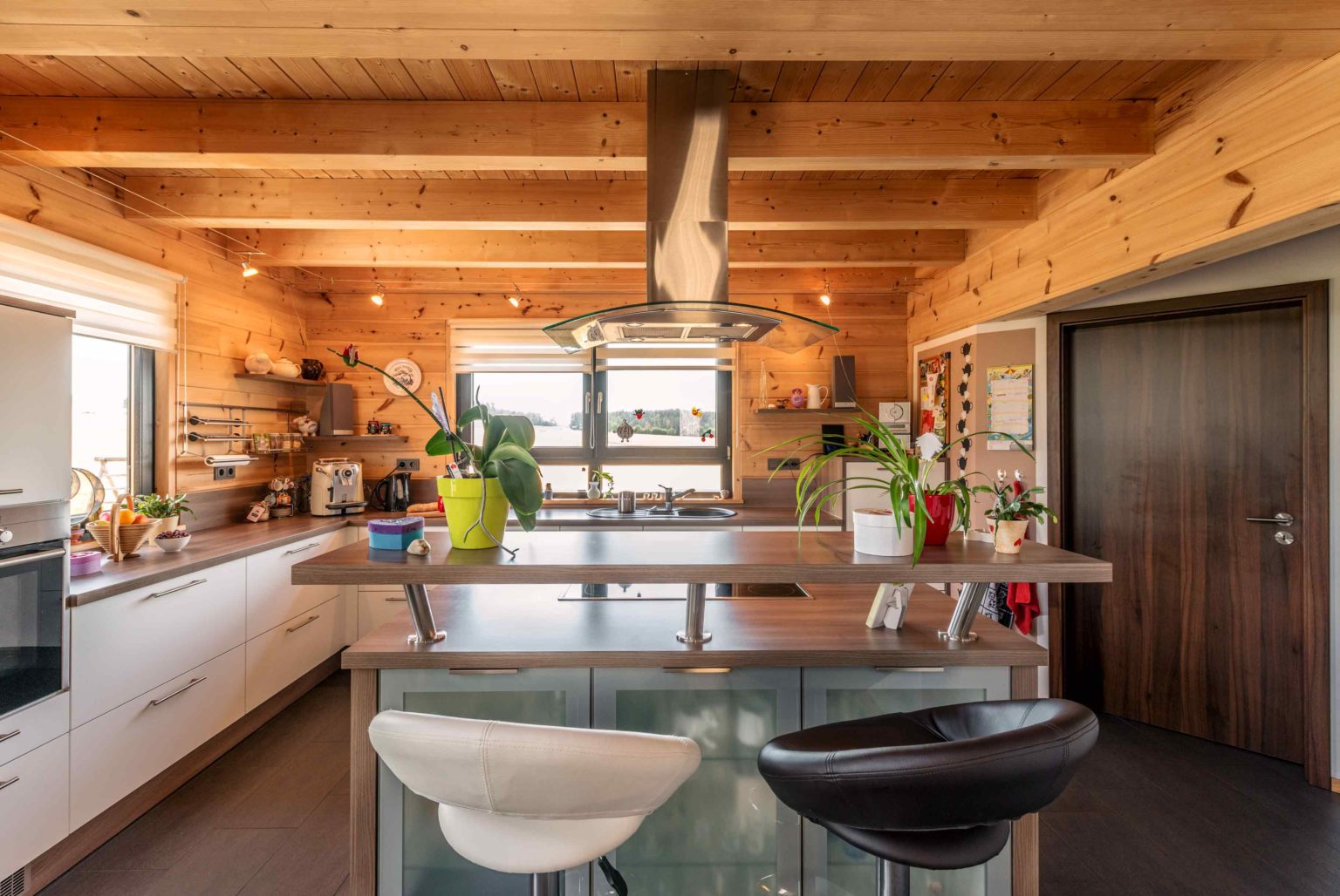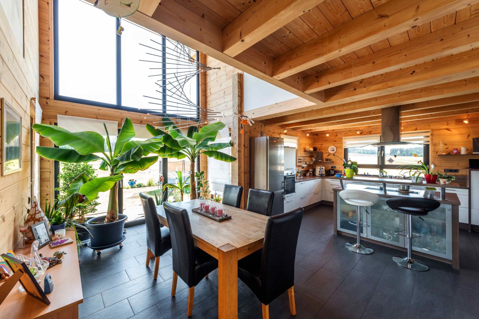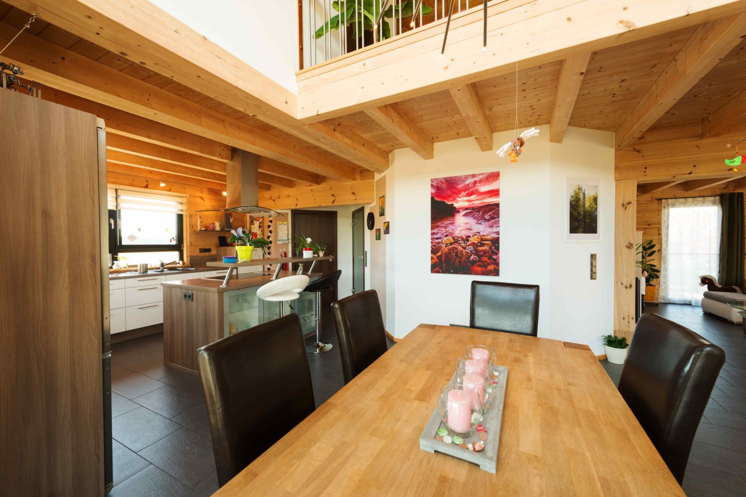 ​„Bei der Hausplanung haben wir uns stark am Musterhaus in Wolpertshausen orientiert. Das gefiel uns nämlich sehr gut wegen der horizontalen und vertikalen Offenheit und den vielen, großen Fenstern. Wir haben nur wenige Änderungen vorgenommen.“, sagt die Eigentümerin von Holzhaus „am Sonnensee“. Ihr und ihrem Gatten war ein luftiger, heller und offener Wohnbereich wichtig mit großzügigen Flächen, hohem Luftraum, viel natürlichem Lichteinfall und Blick in die Natur draußen. Deshalb besitzt das Holzhaus im Erdgeschoss einen großen Wohnbereich, in dem Küche, Essen und Wohnzimmer fließend ineinander übergehen, aber dennoch durch raffinierte Gliederung optisch voneinander getrennt sind. Der mit natürlichem Licht durchflutete Essbereich befindet sich im zweistöckigen, verglasten Zwerchhaus an der Südseite und bietet nicht nur den gewünschten Blick hinaus, sondern auch hinauf auf den imposanten Sichtdachstuhl über dem beeindruckend hohen Luftraum. Die Küche und das Wohnzimmer wiederum besitzen normalhohe, offene Holzbalkendecken, die Gemütlichkeit schenken ohne zu drücken. Vom Wohnzimmer aus geht es direkt hinaus zu einem überdachten Freisitz auf der Terrasse und in den weitläufigen Garten. Dank der angedeuteten L-Form des gesamten Wohnbereichs, kann man vom Sofa aus nicht in die Küche schauen, ein riesen Vorteil! Einheitlich verlegte, dunkelbraune große Fliesen betonen die große Fläche und den ungehinderten Bewegungsfluss im Erdgeschoss.