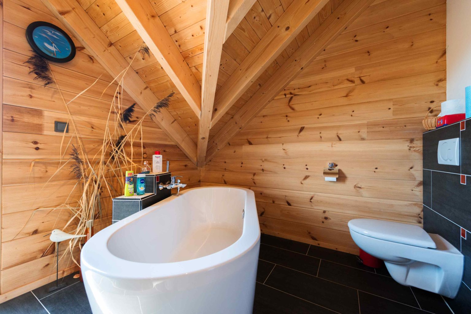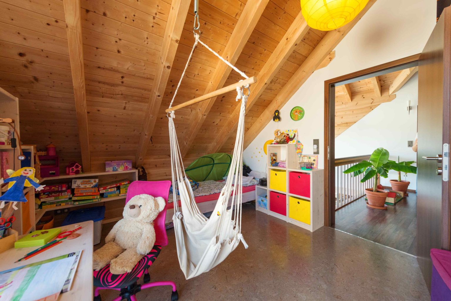 Von Wohnzimmer und Küche gibt es jeweils einen Zugang zur Diele. Außerdem befindet sich direkt neben der Küche ein Hauswirtschafts- und Vorratsraum. Das obligatorische Gäste-WC ist ebenfalls von der Diele zu erreichen. Von hier führt auch die Geschosstreppe hinauf auf eine Galerie mit Weitblick hinaus über die Felder und Blick auf den Essbereich im Erdgeschoss, von der man die beiden Kinderzimmer, das Schlafzimmer mit angeschlossener Ankleide und ein großes Wohn-Bad erreicht. Die Deckenhöhen im Dachgeschoss sind extrem großzügig, da über allem der offene Sichtdachstuhl thront. Dank der gut dämmenden einschaligen Kiefernwände, verbunden mit einer sehr gut isolierenden Aufdachdämmung und guten Wärmeschutzfenstern bleiben die Heizkosten trotz des sehr großen Volumens im Haus niedrig. Geheizt wird Holzhaus „am Sonnensee“ mit einer modernen Luft-Wasser-Wärmepumpe (Fußbodenheizung) und für die WC-Spülung sowie die Gartenbewässerung steht eine 5500 l umfassende Regenwasserzisterne zur Verfügung. „In unserer teils trockenen Gegend ist Regenwasser sehr wertvoll und hilft Geld zu sparen. Im Blick auf den Klimawandel, der gerade bei uns zu vermehrter Trockenheit führen soll, schien uns eine Regenwasserzisterne unbedingt von Nöten!“, argumentiert der Hausherr. Einliegerwohnung trägt finanzielle Belastung mit Die leichte Hanglage des Baugrundstücks hat das Ehepaar für ein bewohnbares Kellergeschoss genutzt. Darin befindet sich eine schöne, helle Einliegerwohnung mit eigener großer Sonnenterrasse, die vermietet wird. An der Hauseingangsseite (Nord) ist ein Carport und eine Garage an das Wohngebäude angebaut. So gelangt man immer trockenen Fußes vom Auto ins Holzhaus. Der jetzige Abstellraum im Dachgeschoss der Garage ist durch eine Tür mit der Galerie des Wohnhauses verbunden. Später soll auch dieser Bereich ausgebaut werden und bietet zusätzlichen Wohnraum.