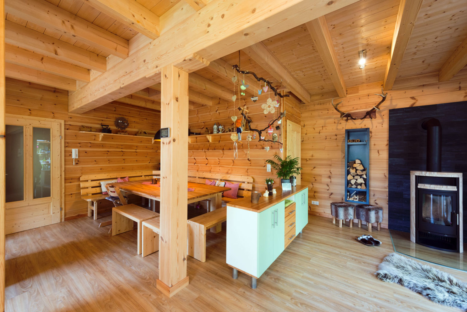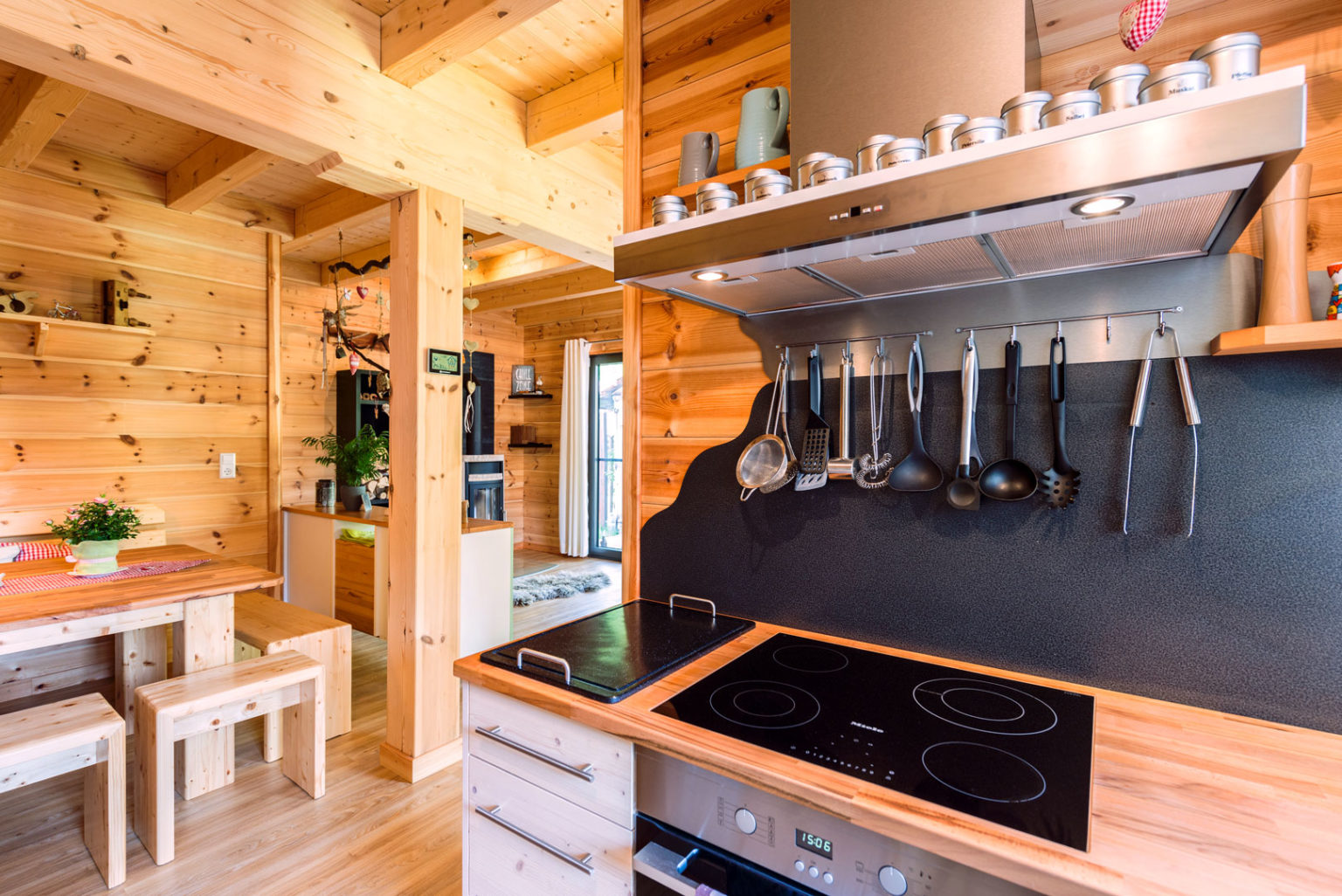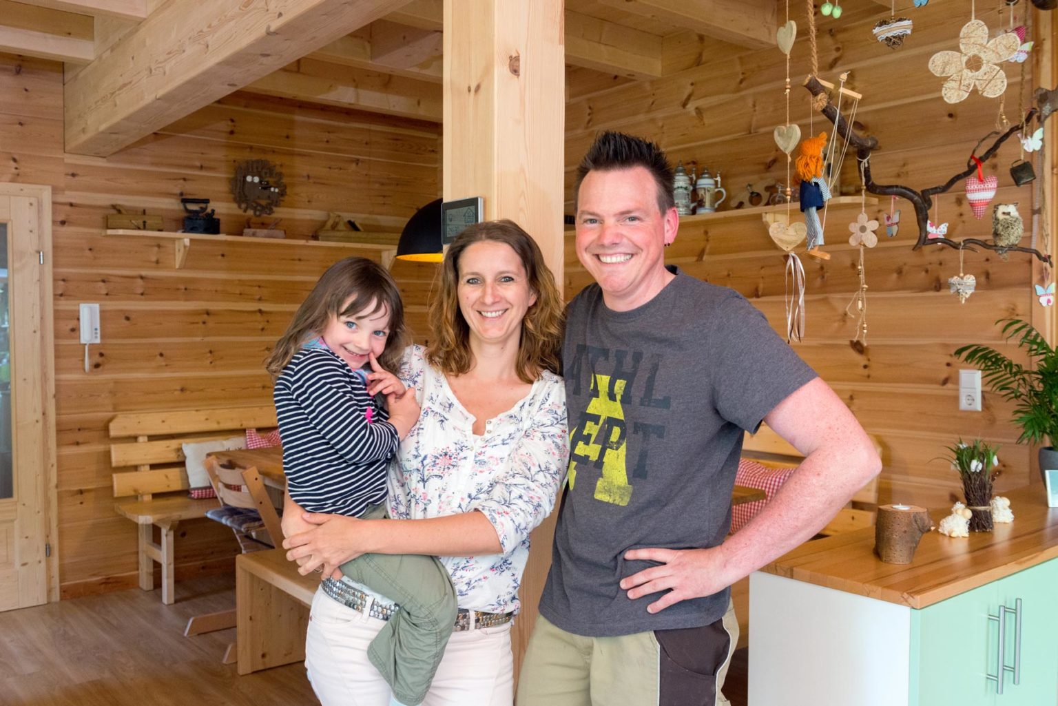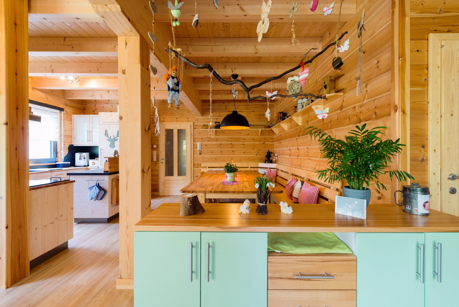 Als Möbelschreiner hat Stefan Bügler schon von Berufswegen einen engen Bezug zu Holz. Er und seine Frau Kathrin lieben das sinnliche, bodenständige Naturmaterial aber auch privat, sonst wäre wohl kaum ein massives Holzhaus in Frage gekommen. „Selbst ist der Mann“, dachte sich der junge Familienvater, und da er schließlich auch das praktische Können besitzt, hat er sein Holzhaus selbst gebaut. Angeleitet und unterstützt wurde er dabei von einem Richtmeister seines Holzhausherstellers, Fullwood, außerdem halfen Freunde beim Hausaufbau mit. Denen hilft er demnächst bei ihren Baustellen. Darauf folgte der Innenausbau, ebenfalls in Eigenleistung, und selbstverständlich ist jedes einzelne Möbelstück vom Hausherrn höchstpersönlich gebaut worden. „Es ist ein super Gefühl, wenn man alles selbst gemacht hat. Man behandelt Selbstgemachtes ganz anders.“, sagt Stefan Bügler voller Stolz. „Wir hatten eine gute Zeit während des Hausbaus, die Stimmung war immer gut, es gab nie Stress oder Streit, und die Sonne lachte auch permanent.“, erinnert sich Kathrin Bügler, die selbst mithalf, wo sie konnte. „Meine Schwiegermutter hat die Handwerker immer bestens mit selbstgekochtem Essen versorgt. Das hob die Stimmung zusätzlich.“, fährt sie fort.
