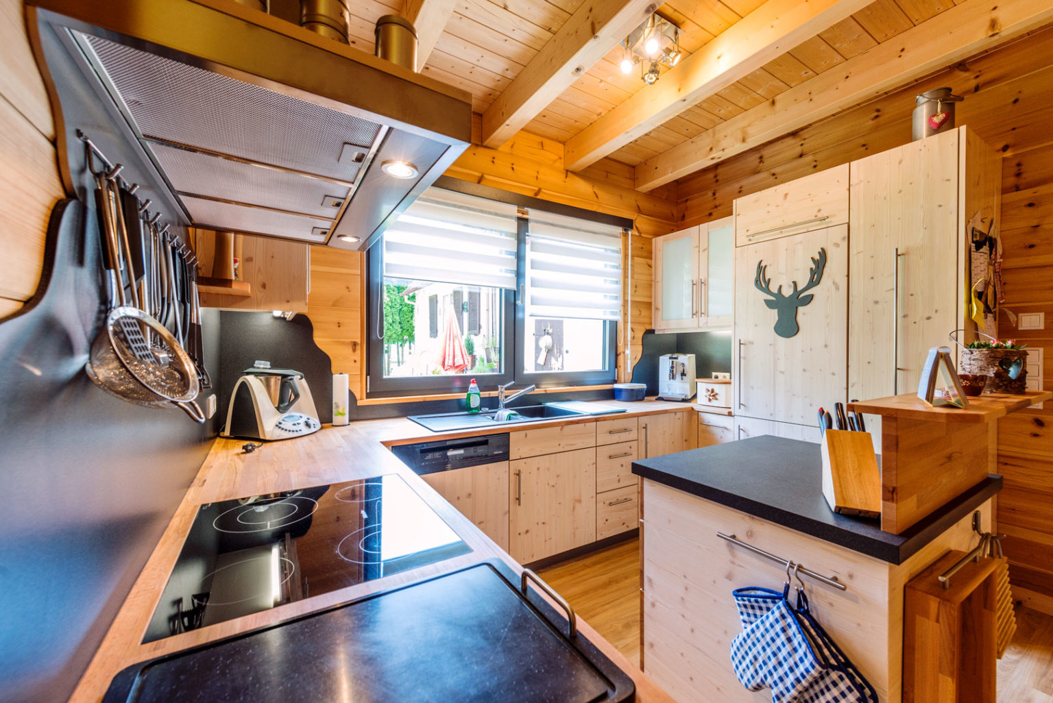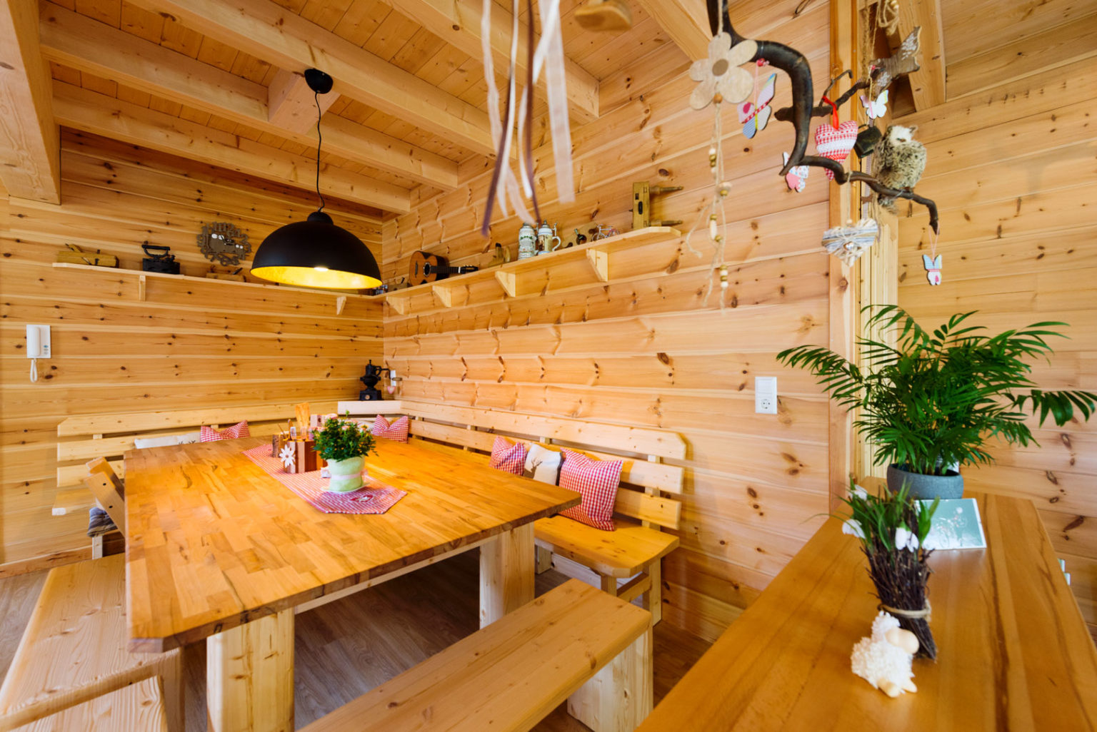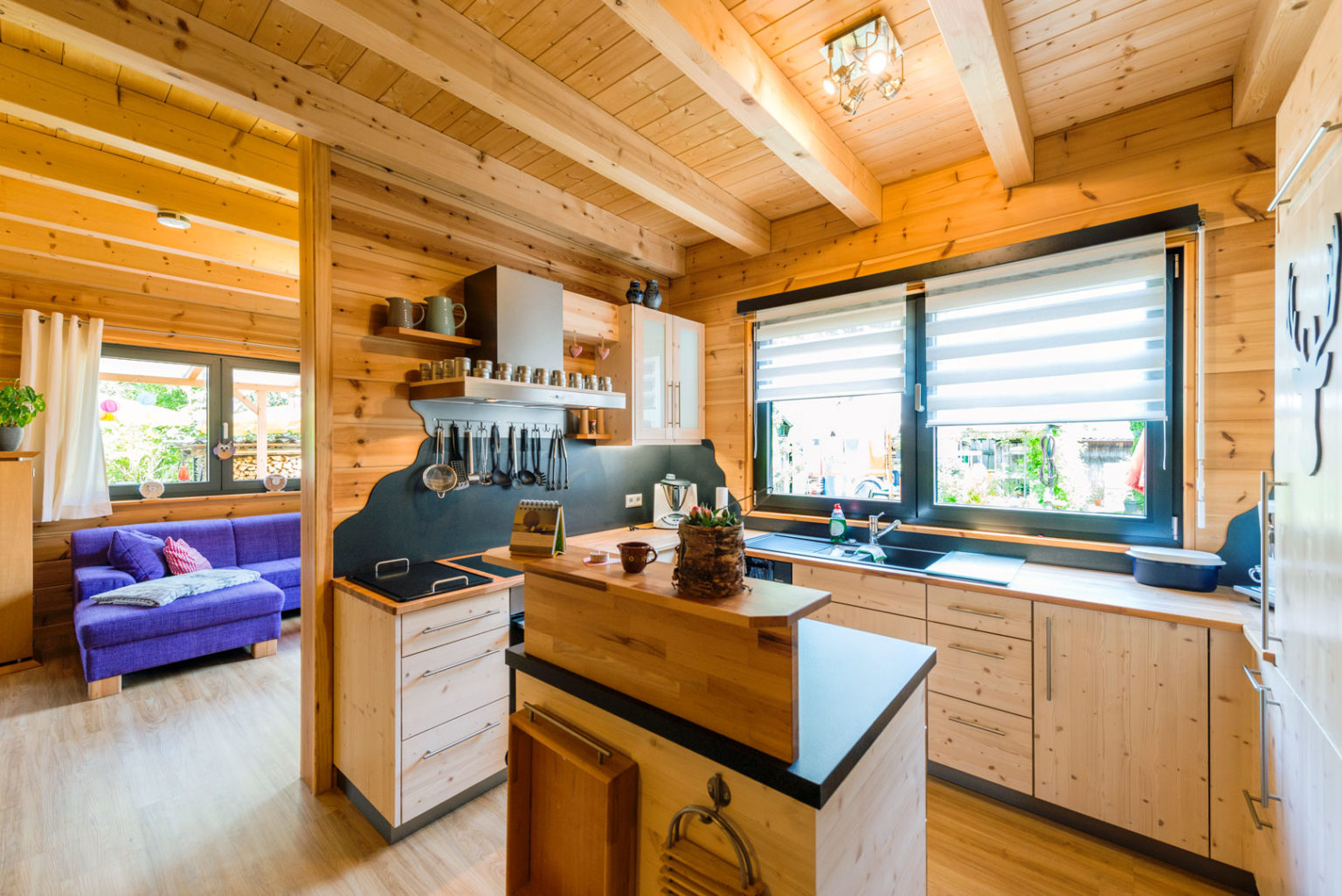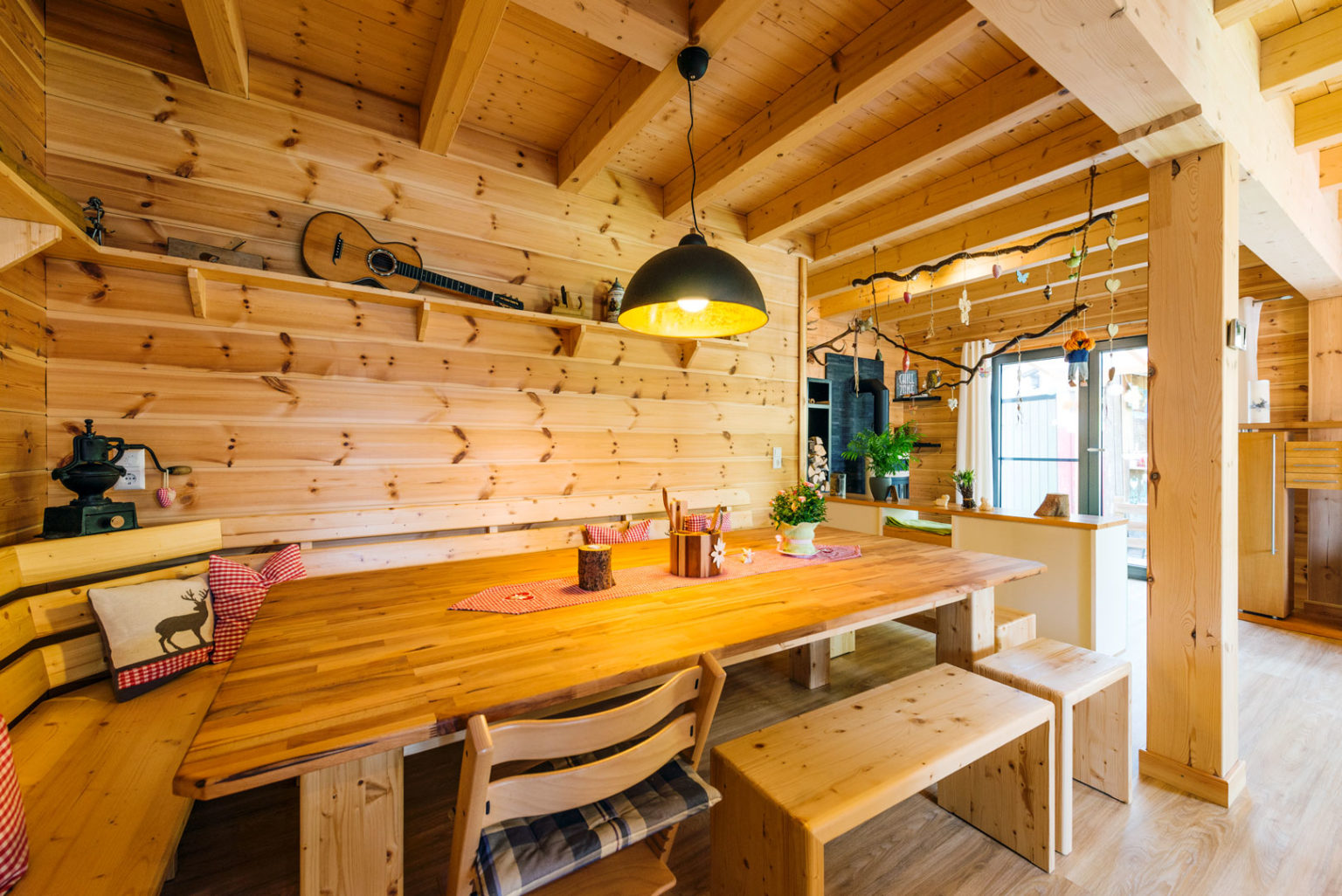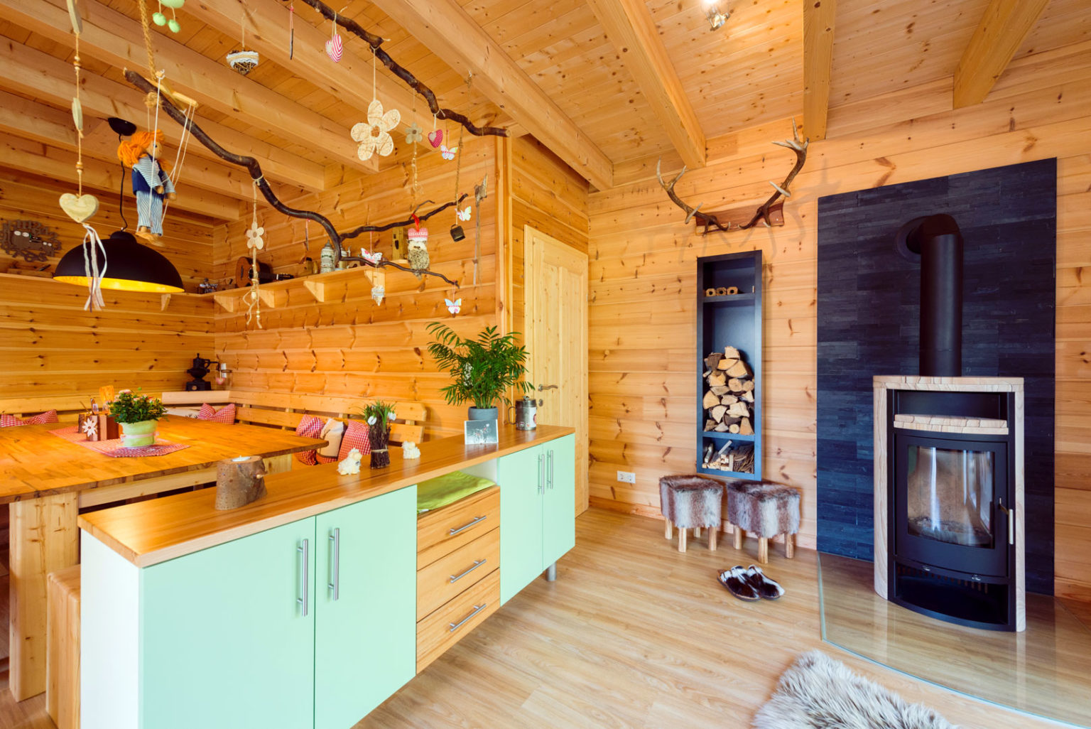 Als Möbelschreiner hat Stefan Bügler schon von Berufswegen einen engen Bezug zu Holz. Er und seine Frau Kathrin lieben das sinnliche, bodenständige Naturmaterial aber auch privat, sonst wäre wohl kaum ein massives Holzhaus in Frage gekommen. „Selbst ist der Mann“, dachte sich der junge Familienvater, und da er schließlich auch das praktische Können besitzt, hat er sein Holzhaus selbst gebaut. Angeleitet und unterstützt wurde er dabei von einem Richtmeister seines Holzhausherstellers, Fullwood, außerdem halfen Freunde beim Hausaufbau mit. Denen hilft er demnächst bei ihren Baustellen. Darauf folgte der Innenausbau, ebenfalls in Eigenleistung, und selbstverständlich ist jedes einzelne Möbelstück vom Hausherrn höchstpersönlich gebaut worden. „Es ist ein super Gefühl, wenn man alles selbst gemacht hat. Man behandelt Selbstgemachtes ganz anders.“, sagt Stefan Bügler voller Stolz. „Wir hatten eine gute Zeit während des Hausbaus, die Stimmung war immer gut, es gab nie Stress oder Streit, und die Sonne lachte auch permanent.“, erinnert sich Kathrin Bügler, die selbst mithalf, wo sie konnte. „Meine Schwiegermutter hat die Handwerker immer bestens mit selbstgekochtem Essen versorgt. Das hob die Stimmung zusätzlich.“, fährt sie fort.